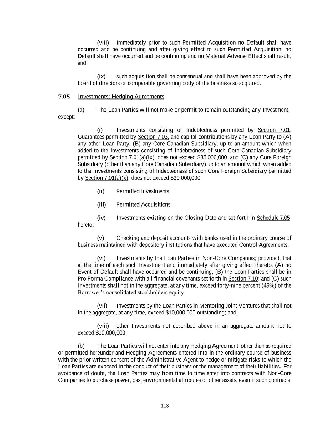 113 (viii) immediately prior to such Permitted Acquisition no Default shall have occurred and be continuing and after giving effect to such Permitted Acquisition, no Default shall have occurred and be continuing and no Material Adverse Effect shall result; and (ix) such acquisition shall be consensual and shall have been approved by the board of directors or comparable governing body of the business so acquired. 7.05 Investments; Hedging Agreements. (a) The Loan Parties will not make or permit to remain outstanding any Investment, except: (i) Investments consisting of Indebtedness permitted by Section 7.01, Guarantees permitted by Section 7.03, and capital contributions by any Loan Party to (A) any other Loan Party, (B) any Core Canadian Subsidiary, up to an amount which when added to the Investments consisting of Indebtedness of such Core Canadian Subsidiary permitted by Section 7.01(a)(ix), does not exceed $35,000,000, and (C) any Core Foreign Subsidiary (other than any Core Canadian Subsidiary) up to an amount which when added to the Investments consisting of Indebtedness of such Core Foreign Subsidiary permitted by Section 7.01(a)(x), does not exceed $30,000,000; (ii) Permitted Investments; (iii) Permitted Acquisitions; (iv) Investments existing on the Closing Date and set forth in Schedule 7.05 hereto; (v) Checking and deposit accounts with banks used in the ordinary course of business maintained with depository institutions that have executed Control Agreements; (vi) Investments by the Loan Parties in Non-Core Companies; provided, that at the time of each such Investment and immediately after giving effect thereto, (A) no Event of Default shall have occurred and be continuing, (B) the Loan Parties shall be in Pro Forma Compliance with all financial covenants set forth in Section 7.10; and (C) such Investments shall not in the aggregate, at any time, exceed forty-nine percent (49%) of the Borrower’s consolidated stockholders equity; (vii) Investments by the Loan Parties in Mentoring Joint Ventures that shall not in the aggregate, at any time, exceed $10,000,000 outstanding; and (viii) other Investments not described above in an aggregate amount not to exceed $10,000,000. (b) The Loan Parties will not enter into any Hedging Agreement, other than as required or permitted hereunder and Hedging Agreements entered into in the ordinary course of business with the prior written consent of the Administrative Agent to hedge or mitigate risks to which the Loan Parties are exposed in the conduct of their business or the management of their liabilities. For avoidance of doubt, the Loan Parties may from time to time enter into contracts with Non-Core Companies to purchase power, gas, environmental attributes or other assets, even if such contracts