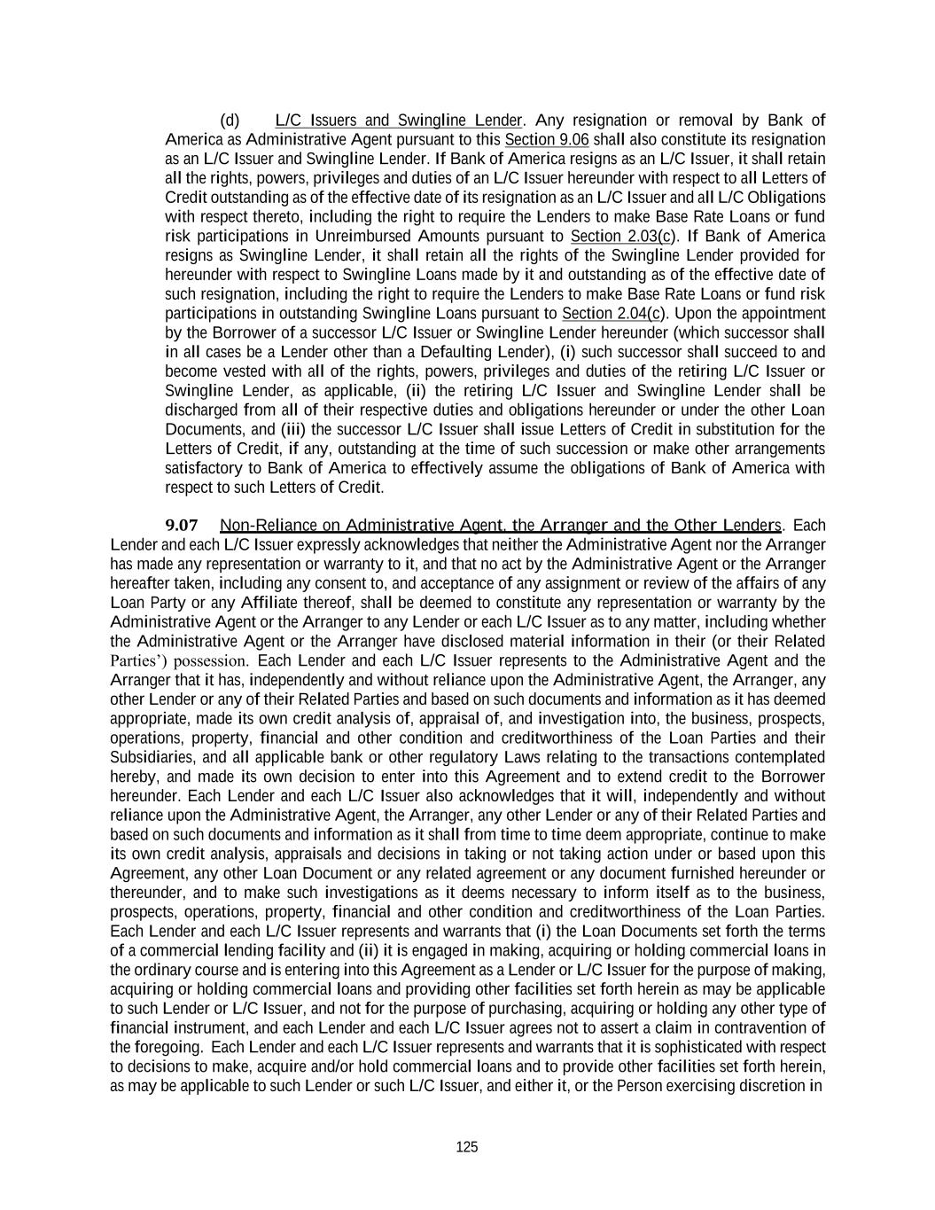 125 (d) L/C Issuers and Swingline Lender. Any resignation or removal by Bank of America as Administrative Agent pursuant to this Section 9.06 shall also constitute its resignation as an L/C Issuer and Swingline Lender. If Bank of America resigns as an L/C Issuer, it shall retain all the rights, powers, privileges and duties of an L/C Issuer hereunder with respect to all Letters of Credit outstanding as of the effective date of its resignation as an L/C Issuer and all L/C Obligations with respect thereto, including the right to require the Lenders to make Base Rate Loans or fund risk participations in Unreimbursed Amounts pursuant to Section 2.03(c). If Bank of America resigns as Swingline Lender, it shall retain all the rights of the Swingline Lender provided for hereunder with respect to Swingline Loans made by it and outstanding as of the effective date of such resignation, including the right to require the Lenders to make Base Rate Loans or fund risk participations in outstanding Swingline Loans pursuant to Section 2.04(c). Upon the appointment by the Borrower of a successor L/C Issuer or Swingline Lender hereunder (which successor shall in all cases be a Lender other than a Defaulting Lender), (i) such successor shall succeed to and become vested with all of the rights, powers, privileges and duties of the retiring L/C Issuer or Swingline Lender, as applicable, (ii) the retiring L/C Issuer and Swingline Lender shall be discharged from all of their respective duties and obligations hereunder or under the other Loan Documents, and (iii) the successor L/C Issuer shall issue Letters of Credit in substitution for the Letters of Credit, if any, outstanding at the time of such succession or make other arrangements satisfactory to Bank of America to effectively assume the obligations of Bank of America with respect to such Letters of Credit. 9.07 Non-Reliance on Administrative Agent, the Arranger and the Other Lenders. Each Lender and each L/C Issuer expressly acknowledges that neither the Administrative Agent nor the Arranger has made any representation or warranty to it, and that no act by the Administrative Agent or the Arranger hereafter taken, including any consent to, and acceptance of any assignment or review of the affairs of any Loan Party or any Affiliate thereof, shall be deemed to constitute any representation or warranty by the Administrative Agent or the Arranger to any Lender or each L/C Issuer as to any matter, including whether the Administrative Agent or the Arranger have disclosed material information in their (or their Related Parties’) possession. Each Lender and each L/C Issuer represents to the Administrative Agent and the Arranger that it has, independently and without reliance upon the Administrative Agent, the Arranger, any other Lender or any of their Related Parties and based on such documents and information as it has deemed appropriate, made its own credit analysis of, appraisal of, and investigation into, the business, prospects, operations, property, financial and other condition and creditworthiness of the Loan Parties and their Subsidiaries, and all applicable bank or other regulatory Laws relating to the transactions contemplated hereby, and made its own decision to enter into this Agreement and to extend credit to the Borrower hereunder. Each Lender and each L/C Issuer also acknowledges that it will, independently and without reliance upon the Administrative Agent, the Arranger, any other Lender or any of their Related Parties and based on such documents and information as it shall from time to time deem appropriate, continue to make its own credit analysis, appraisals and decisions in taking or not taking action under or based upon this Agreement, any other Loan Document or any related agreement or any document furnished hereunder or thereunder, and to make such investigations as it deems necessary to inform itself as to the business, prospects, operations, property, financial and other condition and creditworthiness of the Loan Parties. Each Lender and each L/C Issuer represents and warrants that (i) the Loan Documents set forth the terms of a commercial lending facility and (ii) it is engaged in making, acquiring or holding commercial loans in the ordinary course and is entering into this Agreement as a Lender or L/C Issuer for the purpose of making, acquiring or holding commercial loans and providing other facilities set forth herein as may be applicable to such Lender or L/C Issuer, and not for the purpose of purchasing, acquiring or holding any other type of financial instrument, and each Lender and each L/C Issuer agrees not to assert a claim in contravention of the foregoing. Each Lender and each L/C Issuer represents and warrants that it is sophisticated with respect to decisions to make, acquire and/or hold commercial loans and to provide other facilities set forth herein, as may be applicable to such Lender or such L/C Issuer, and either it, or the Person exercising discretion in