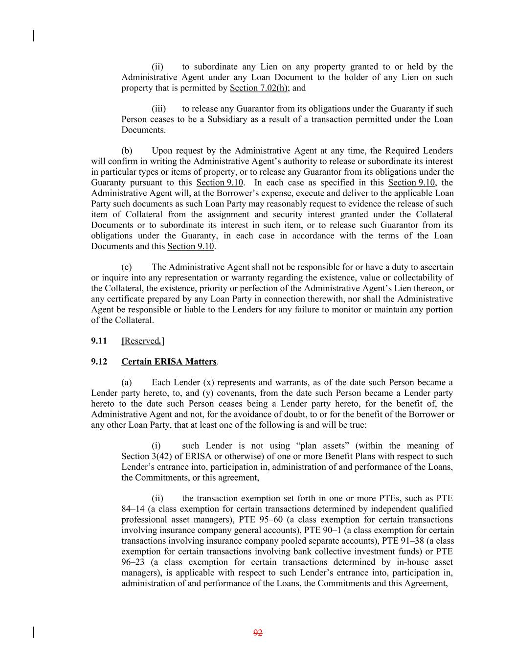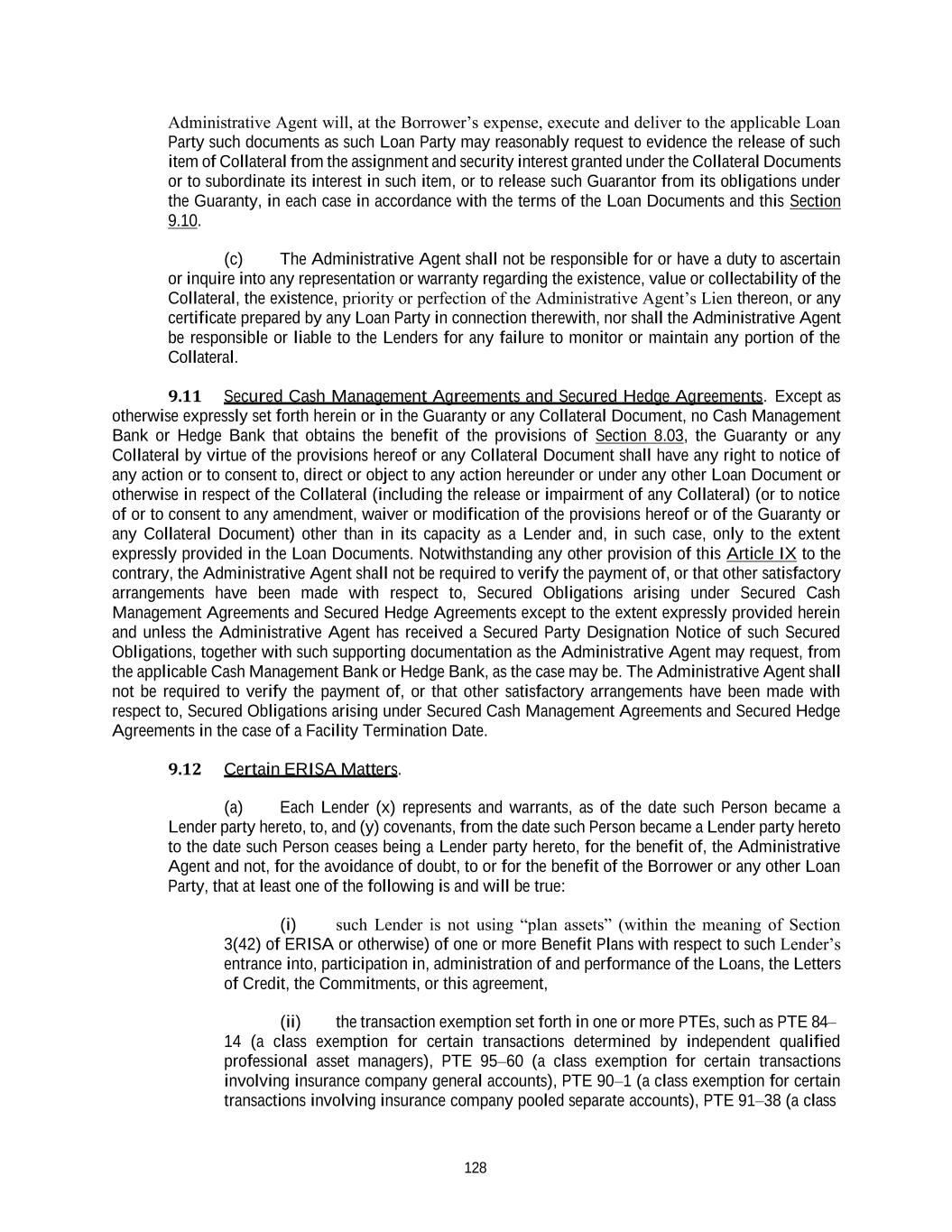 128 Administrative Agent will, at the Borrower’s expense, execute and deliver to the applicable Loan Party such documents as such Loan Party may reasonably request to evidence the release of such item of Collateral from the assignment and security interest granted under the Collateral Documents or to subordinate its interest in such item, or to release such Guarantor from its obligations under the Guaranty, in each case in accordance with the terms of the Loan Documents and this Section 9.10. (c) The Administrative Agent shall not be responsible for or have a duty to ascertain or inquire into any representation or warranty regarding the existence, value or collectability of the Collateral, the existence, priority or perfection of the Administrative Agent’s Lien thereon, or any certificate prepared by any Loan Party in connection therewith, nor shall the Administrative Agent be responsible or liable to the Lenders for any failure to monitor or maintain any portion of the Collateral. 9.11 Secured Cash Management Agreements and Secured Hedge Agreements. Except as otherwise expressly set forth herein or in the Guaranty or any Collateral Document, no Cash Management Bank or Hedge Bank that obtains the benefit of the provisions of Section 8.03, the Guaranty or any Collateral by virtue of the provisions hereof or any Collateral Document shall have any right to notice of any action or to consent to, direct or object to any action hereunder or under any other Loan Document or otherwise in respect of the Collateral (including the release or impairment of any Collateral) (or to notice of or to consent to any amendment, waiver or modification of the provisions hereof or of the Guaranty or any Collateral Document) other than in its capacity as a Lender and, in such case, only to the extent expressly provided in the Loan Documents. Notwithstanding any other provision of this Article IX to the contrary, the Administrative Agent shall not be required to verify the payment of, or that other satisfactory arrangements have been made with respect to, Secured Obligations arising under Secured Cash Management Agreements and Secured Hedge Agreements except to the extent expressly provided herein and unless the Administrative Agent has received a Secured Party Designation Notice of such Secured Obligations, together with such supporting documentation as the Administrative Agent may request, from the applicable Cash Management Bank or Hedge Bank, as the case may be. The Administrative Agent shall not be required to verify the payment of, or that other satisfactory arrangements have been made with respect to, Secured Obligations arising under Secured Cash Management Agreements and Secured Hedge Agreements in the case of a Facility Termination Date. 9.12 Certain ERISA Matters. (a) Each Lender (x) represents and warrants, as of the date such Person became a Lender party hereto, to, and (y) covenants, from the date such Person became a Lender party hereto to the date such Person ceases being a Lender party hereto, for the benefit of, the Administrative Agent and not, for the avoidance of doubt, to or for the benefit of the Borrower or any other Loan Party, that at least one of the following is and will be true: (i) such Lender is not using “plan assets” (within the meaning of Section 3(42) of ERISA or otherwise) of one or more Benefit Plans with respect to such Lender’s entrance into, participation in, administration of and performance of the Loans, the Letters of Credit, the Commitments, or this agreement, (ii) the transaction exemption set forth in one or more PTEs, such as PTE 84– 14 (a class exemption for certain transactions determined by independent qualified professional asset managers), PTE 95–60 (a class exemption for certain transactions involving insurance company general accounts), PTE 90–1 (a class exemption for certain transactions involving insurance company pooled separate accounts), PTE 91–38 (a class
