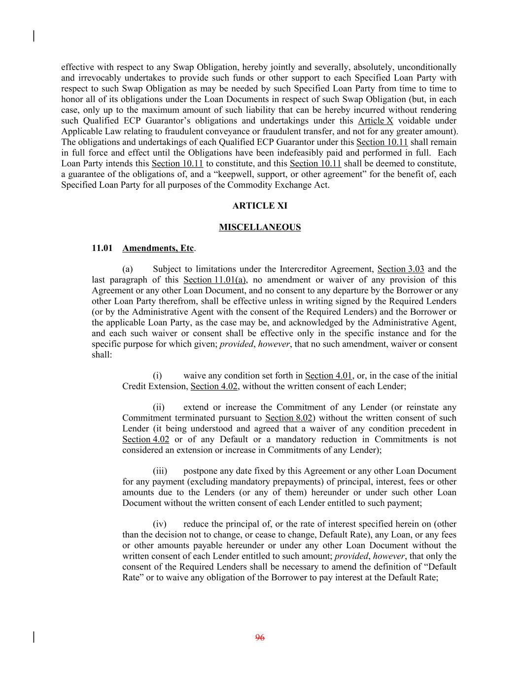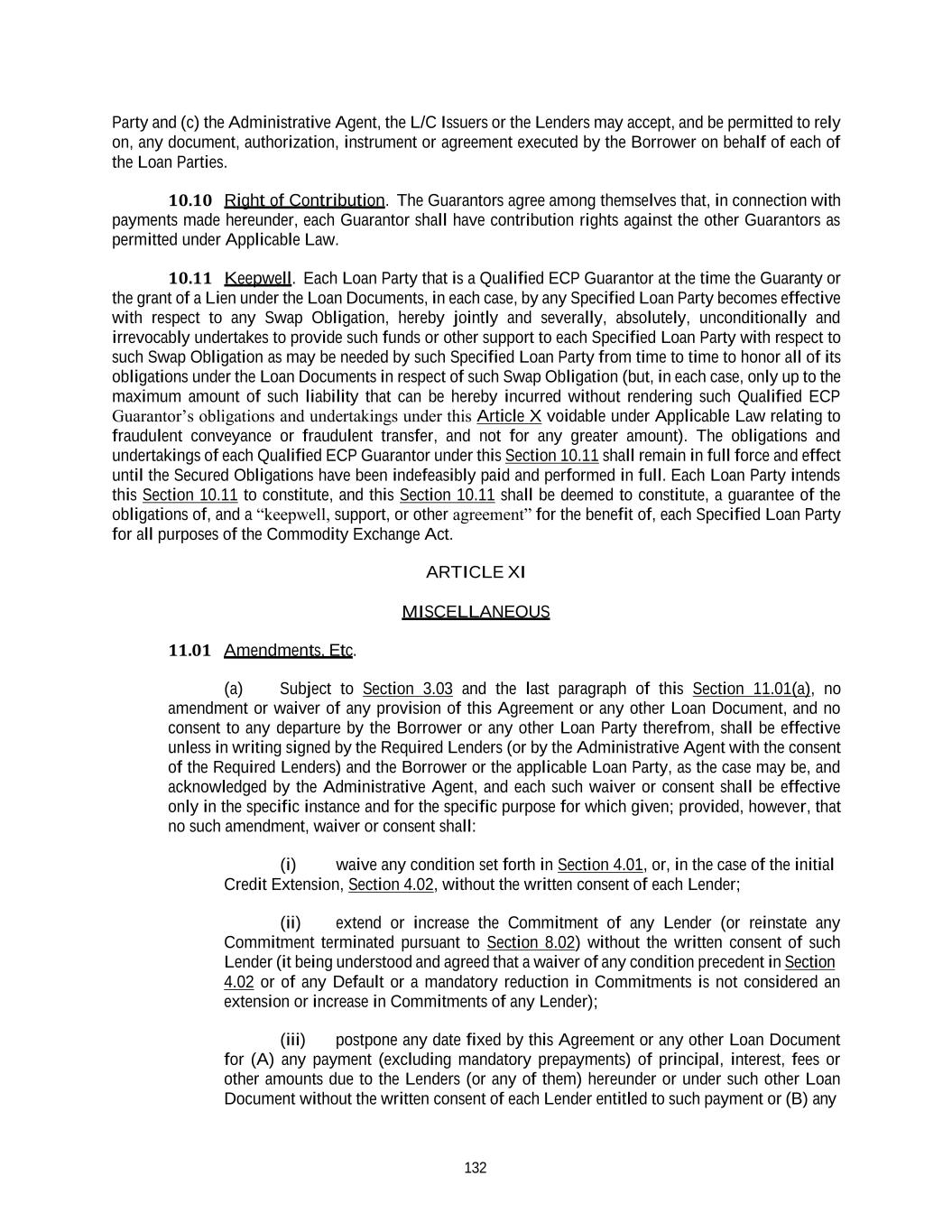 132 Party and (c) the Administrative Agent, the L/C Issuers or the Lenders may accept, and be permitted to rely on, any document, authorization, instrument or agreement executed by the Borrower on behalf of each of the Loan Parties. 10.10 Right of Contribution. The Guarantors agree among themselves that, in connection with payments made hereunder, each Guarantor shall have contribution rights against the other Guarantors as permitted under Applicable Law. 10.11 Keepwell. Each Loan Party that is a Qualified ECP Guarantor at the time the Guaranty or the grant of a Lien under the Loan Documents, in each case, by any Specified Loan Party becomes effective with respect to any Swap Obligation, hereby jointly and severally, absolutely, unconditionally and irrevocably undertakes to provide such funds or other support to each Specified Loan Party with respect to such Swap Obligation as may be needed by such Specified Loan Party from time to time to honor all of its obligations under the Loan Documents in respect of such Swap Obligation (but, in each case, only up to the maximum amount of such liability that can be hereby incurred without rendering such Qualified ECP Guarantor’s obligations and undertakings under this Article X voidable under Applicable Law relating to fraudulent conveyance or fraudulent transfer, and not for any greater amount). The obligations and undertakings of each Qualified ECP Guarantor under this Section 10.11 shall remain in full force and effect until the Secured Obligations have been indefeasibly paid and performed in full. Each Loan Party intends this Section 10.11 to constitute, and this Section 10.11 shall be deemed to constitute, a guarantee of the obligations of, and a “keepwell, support, or other agreement” for the benefit of, each Specified Loan Party for all purposes of the Commodity Exchange Act. ARTICLE XI MISCELLANEOUS 11.01 Amendments, Etc. (a) Subject to Section 3.03 and the last paragraph of this Section 11.01(a), no amendment or waiver of any provision of this Agreement or any other Loan Document, and no consent to any departure by the Borrower or any other Loan Party therefrom, shall be effective unless in writing signed by the Required Lenders (or by the Administrative Agent with the consent of the Required Lenders) and the Borrower or the applicable Loan Party, as the case may be, and acknowledged by the Administrative Agent, and each such waiver or consent shall be effective only in the specific instance and for the specific purpose for which given; provided, however, that no such amendment, waiver or consent shall: (i) waive any condition set forth in Section 4.01, or, in the case of the initial Credit Extension, Section 4.02, without the written consent of each Lender; (ii) extend or increase the Commitment of any Lender (or reinstate any Commitment terminated pursuant to Section 8.02) without the written consent of such Lender (it being understood and agreed that a waiver of any condition precedent in Section 4.02 or of any Default or a mandatory reduction in Commitments is not considered an extension or increase in Commitments of any Lender); (iii) postpone any date fixed by this Agreement or any other Loan Document for (A) any payment (excluding mandatory prepayments) of principal, interest, fees or other amounts due to the Lenders (or any of them) hereunder or under such other Loan Document without the written consent of each Lender entitled to such payment or (B) any