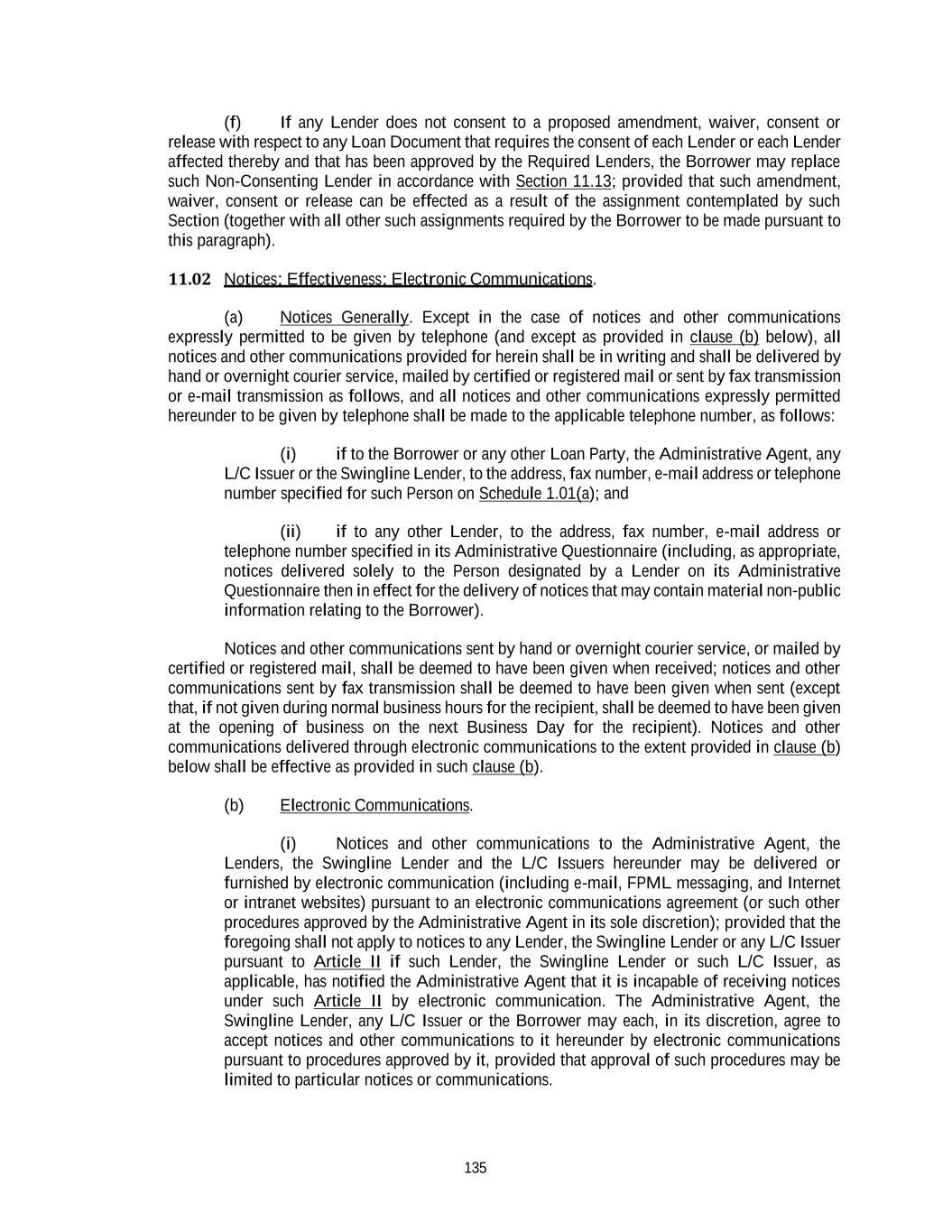 135 (f) If any Lender does not consent to a proposed amendment, waiver, consent or release with respect to any Loan Document that requires the consent of each Lender or each Lender affected thereby and that has been approved by the Required Lenders, the Borrower may replace such Non-Consenting Lender in accordance with Section 11.13; provided that such amendment, waiver, consent or release can be effected as a result of the assignment contemplated by such Section (together with all other such assignments required by the Borrower to be made pursuant to this paragraph). 11.02 Notices; Effectiveness; Electronic Communications. (a) Notices Generally. Except in the case of notices and other communications expressly permitted to be given by telephone (and except as provided in clause (b) below), all notices and other communications provided for herein shall be in writing and shall be delivered by hand or overnight courier service, mailed by certified or registered mail or sent by fax transmission or e-mail transmission as follows, and all notices and other communications expressly permitted hereunder to be given by telephone shall be made to the applicable telephone number, as follows: (i) if to the Borrower or any other Loan Party, the Administrative Agent, any L/C Issuer or the Swingline Lender, to the address, fax number, e-mail address or telephone number specified for such Person on Schedule 1.01(a); and (ii) if to any other Lender, to the address, fax number, e-mail address or telephone number specified in its Administrative Questionnaire (including, as appropriate, notices delivered solely to the Person designated by a Lender on its Administrative Questionnaire then in effect for the delivery of notices that may contain material non-public information relating to the Borrower). Notices and other communications sent by hand or overnight courier service, or mailed by certified or registered mail, shall be deemed to have been given when received; notices and other communications sent by fax transmission shall be deemed to have been given when sent (except that, if not given during normal business hours for the recipient, shall be deemed to have been given at the opening of business on the next Business Day for the recipient). Notices and other communications delivered through electronic communications to the extent provided in clause (b) below shall be effective as provided in such clause (b). (b) Electronic Communications. (i) Notices and other communications to the Administrative Agent, the Lenders, the Swingline Lender and the L/C Issuers hereunder may be delivered or furnished by electronic communication (including e-mail, FPML messaging, and Internet or intranet websites) pursuant to an electronic communications agreement (or such other procedures approved by the Administrative Agent in its sole discretion); provided that the foregoing shall not apply to notices to any Lender, the Swingline Lender or any L/C Issuer pursuant to Article II if such Lender, the Swingline Lender or such L/C Issuer, as applicable, has notified the Administrative Agent that it is incapable of receiving notices under such Article II by electronic communication. The Administrative Agent, the Swingline Lender, any L/C Issuer or the Borrower may each, in its discretion, agree to accept notices and other communications to it hereunder by electronic communications pursuant to procedures approved by it, provided that approval of such procedures may be limited to particular notices or communications.