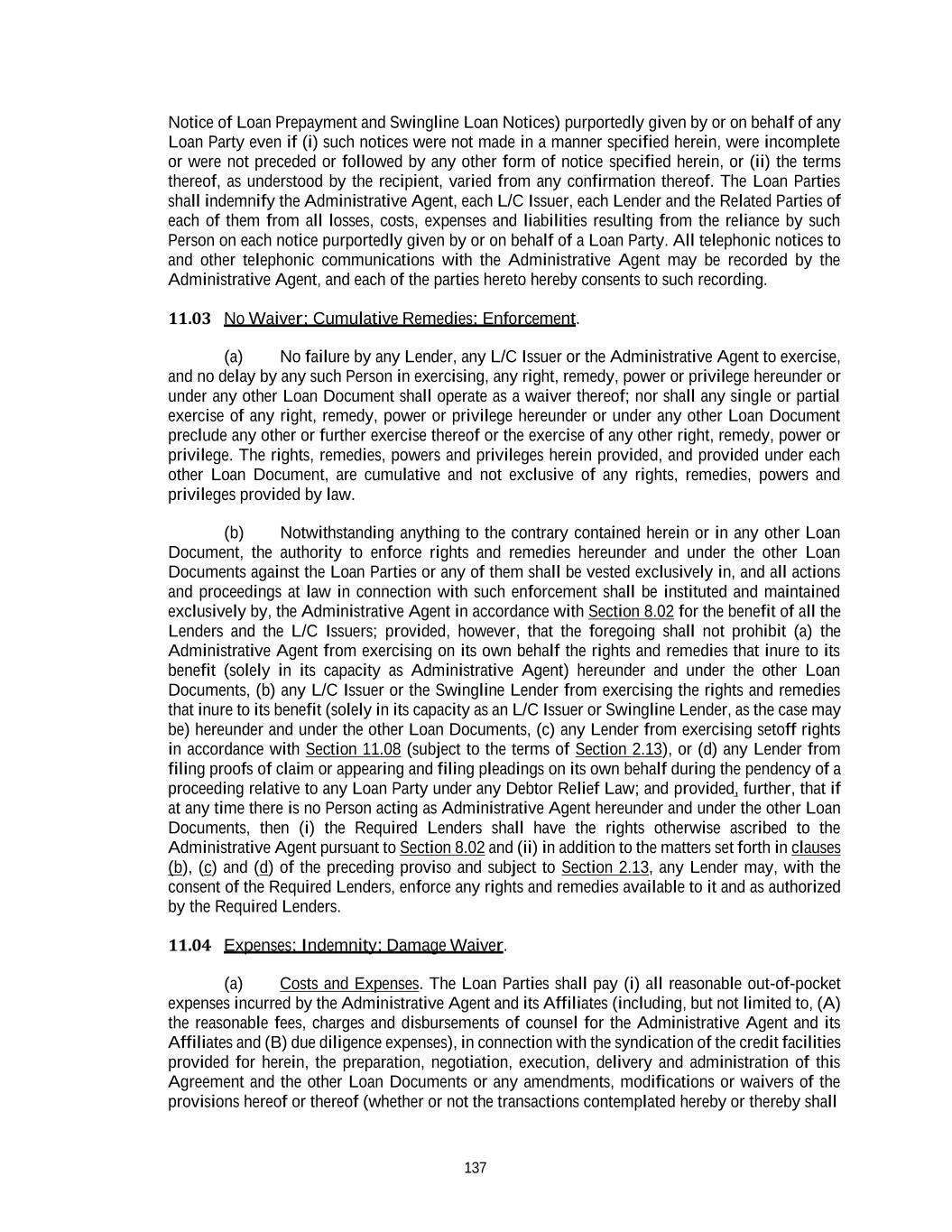 137 Notice of Loan Prepayment and Swingline Loan Notices) purportedly given by or on behalf of any Loan Party even if (i) such notices were not made in a manner specified herein, were incomplete or were not preceded or followed by any other form of notice specified herein, or (ii) the terms thereof, as understood by the recipient, varied from any confirmation thereof. The Loan Parties shall indemnify the Administrative Agent, each L/C Issuer, each Lender and the Related Parties of each of them from all losses, costs, expenses and liabilities resulting from the reliance by such Person on each notice purportedly given by or on behalf of a Loan Party. All telephonic notices to and other telephonic communications with the Administrative Agent may be recorded by the Administrative Agent, and each of the parties hereto hereby consents to such recording. 11.03 No Waiver; Cumulative Remedies; Enforcement. (a) No failure by any Lender, any L/C Issuer or the Administrative Agent to exercise, and no delay by any such Person in exercising, any right, remedy, power or privilege hereunder or under any other Loan Document shall operate as a waiver thereof; nor shall any single or partial exercise of any right, remedy, power or privilege hereunder or under any other Loan Document preclude any other or further exercise thereof or the exercise of any other right, remedy, power or privilege. The rights, remedies, powers and privileges herein provided, and provided under each other Loan Document, are cumulative and not exclusive of any rights, remedies, powers and privileges provided by law. (b) Notwithstanding anything to the contrary contained herein or in any other Loan Document, the authority to enforce rights and remedies hereunder and under the other Loan Documents against the Loan Parties or any of them shall be vested exclusively in, and all actions and proceedings at law in connection with such enforcement shall be instituted and maintained exclusively by, the Administrative Agent in accordance with Section 8.02 for the benefit of all the Lenders and the L/C Issuers; provided, however, that the foregoing shall not prohibit (a) the Administrative Agent from exercising on its own behalf the rights and remedies that inure to its benefit (solely in its capacity as Administrative Agent) hereunder and under the other Loan Documents, (b) any L/C Issuer or the Swingline Lender from exercising the rights and remedies that inure to its benefit (solely in its capacity as an L/C Issuer or Swingline Lender, as the case may be) hereunder and under the other Loan Documents, (c) any Lender from exercising setoff rights in accordance with Section 11.08 (subject to the terms of Section 2.13), or (d) any Lender from filing proofs of claim or appearing and filing pleadings on its own behalf during the pendency of a proceeding relative to any Loan Party under any Debtor Relief Law; and provided, further, that if at any time there is no Person acting as Administrative Agent hereunder and under the other Loan Documents, then (i) the Required Lenders shall have the rights otherwise ascribed to the Administrative Agent pursuant to Section 8.02 and (ii) in addition to the matters set forth in clauses (b), (c) and (d) of the preceding proviso and subject to Section 2.13, any Lender may, with the consent of the Required Lenders, enforce any rights and remedies available to it and as authorized by the Required Lenders. 11.04 Expenses; Indemnity; Damage Waiver. (a) Costs and Expenses. The Loan Parties shall pay (i) all reasonable out-of-pocket expenses incurred by the Administrative Agent and its Affiliates (including, but not limited to, (A) the reasonable fees, charges and disbursements of counsel for the Administrative Agent and its Affiliates and (B) due diligence expenses), in connection with the syndication of the credit facilities provided for herein, the preparation, negotiation, execution, delivery and administration of this Agreement and the other Loan Documents or any amendments, modifications or waivers of the provisions hereof or thereof (whether or not the transactions contemplated hereby or thereby shall