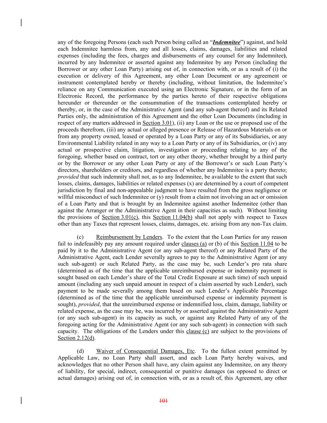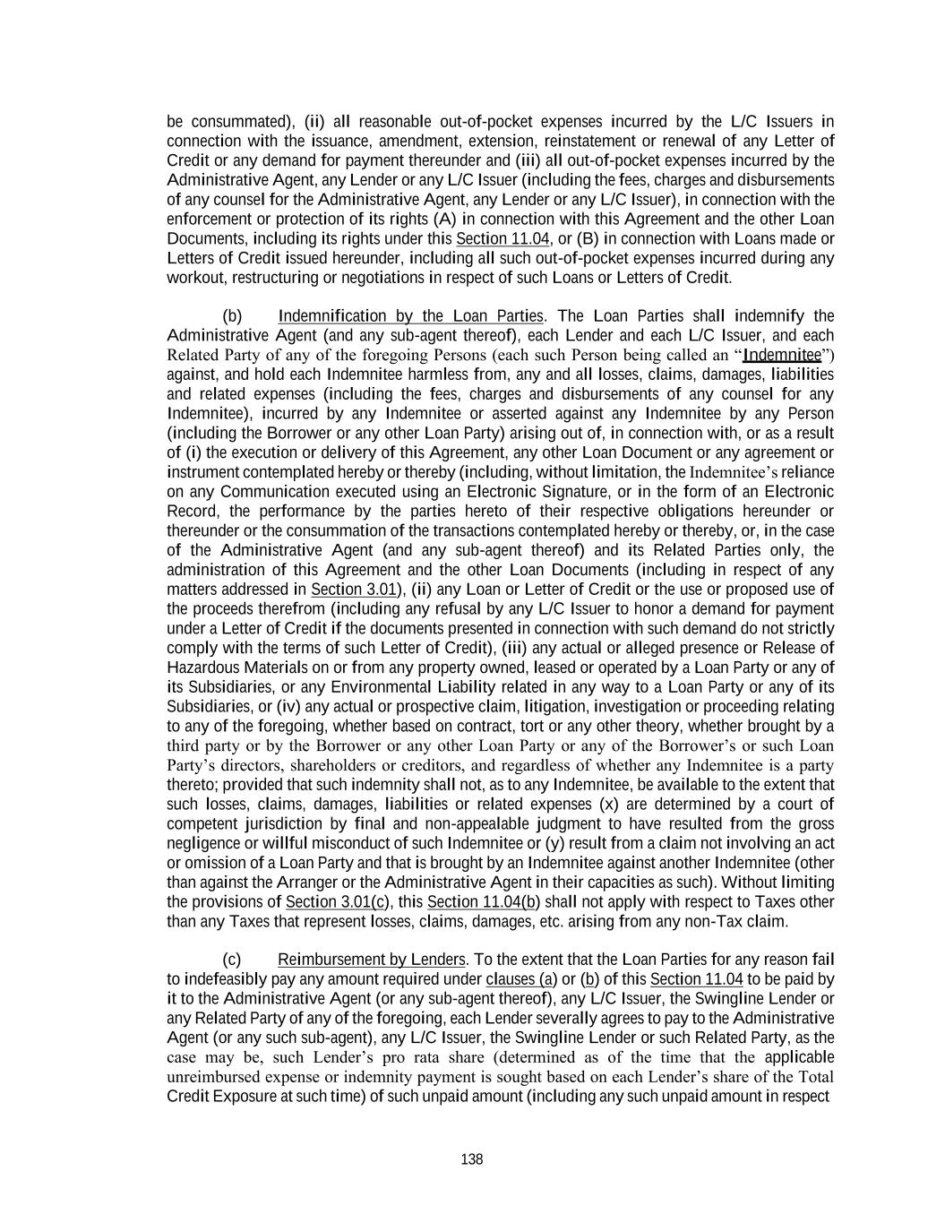 138 be consummated), (ii) all reasonable out-of-pocket expenses incurred by the L/C Issuers in connection with the issuance, amendment, extension, reinstatement or renewal of any Letter of Credit or any demand for payment thereunder and (iii) all out-of-pocket expenses incurred by the Administrative Agent, any Lender or any L/C Issuer (including the fees, charges and disbursements of any counsel for the Administrative Agent, any Lender or any L/C Issuer), in connection with the enforcement or protection of its rights (A) in connection with this Agreement and the other Loan Documents, including its rights under this Section 11.04, or (B) in connection with Loans made or Letters of Credit issued hereunder, including all such out-of-pocket expenses incurred during any workout, restructuring or negotiations in respect of such Loans or Letters of Credit. (b) Indemnification by the Loan Parties. The Loan Parties shall indemnify the Administrative Agent (and any sub-agent thereof), each Lender and each L/C Issuer, and each Related Party of any of the foregoing Persons (each such Person being called an “Indemnitee”) against, and hold each Indemnitee harmless from, any and all losses, claims, damages, liabilities and related expenses (including the fees, charges and disbursements of any counsel for any Indemnitee), incurred by any Indemnitee or asserted against any Indemnitee by any Person (including the Borrower or any other Loan Party) arising out of, in connection with, or as a result of (i) the execution or delivery of this Agreement, any other Loan Document or any agreement or instrument contemplated hereby or thereby (including, without limitation, the Indemnitee’s reliance on any Communication executed using an Electronic Signature, or in the form of an Electronic Record, the performance by the parties hereto of their respective obligations hereunder or thereunder or the consummation of the transactions contemplated hereby or thereby, or, in the case of the Administrative Agent (and any sub-agent thereof) and its Related Parties only, the administration of this Agreement and the other Loan Documents (including in respect of any matters addressed in Section 3.01), (ii) any Loan or Letter of Credit or the use or proposed use of the proceeds therefrom (including any refusal by any L/C Issuer to honor a demand for payment under a Letter of Credit if the documents presented in connection with such demand do not strictly comply with the terms of such Letter of Credit), (iii) any actual or alleged presence or Release of Hazardous Materials on or from any property owned, leased or operated by a Loan Party or any of its Subsidiaries, or any Environmental Liability related in any way to a Loan Party or any of its Subsidiaries, or (iv) any actual or prospective claim, litigation, investigation or proceeding relating to any of the foregoing, whether based on contract, tort or any other theory, whether brought by a third party or by the Borrower or any other Loan Party or any of the Borrower’s or such Loan Party’s directors, shareholders or creditors, and regardless of whether any Indemnitee is a party thereto; provided that such indemnity shall not, as to any Indemnitee, be available to the extent that such losses, claims, damages, liabilities or related expenses (x) are determined by a court of competent jurisdiction by final and non-appealable judgment to have resulted from the gross negligence or willful misconduct of such Indemnitee or (y) result from a claim not involving an act or omission of a Loan Party and that is brought by an Indemnitee against another Indemnitee (other than against the Arranger or the Administrative Agent in their capacities as such). Without limiting the provisions of Section 3.01(c), this Section 11.04(b) shall not apply with respect to Taxes other than any Taxes that represent losses, claims, damages, etc. arising from any non-Tax claim. (c) Reimbursement by Lenders. To the extent that the Loan Parties for any reason fail to indefeasibly pay any amount required under clauses (a) or (b) of this Section 11.04 to be paid by it to the Administrative Agent (or any sub-agent thereof), any L/C Issuer, the Swingline Lender or any Related Party of any of the foregoing, each Lender severally agrees to pay to the Administrative Agent (or any such sub-agent), any L/C Issuer, the Swingline Lender or such Related Party, as the case may be, such Lender’s pro rata share (determined as of the time that the applicable unreimbursed expense or indemnity payment is sought based on each Lender’s share of the Total Credit Exposure at such time) of such unpaid amount (including any such unpaid amount in respect