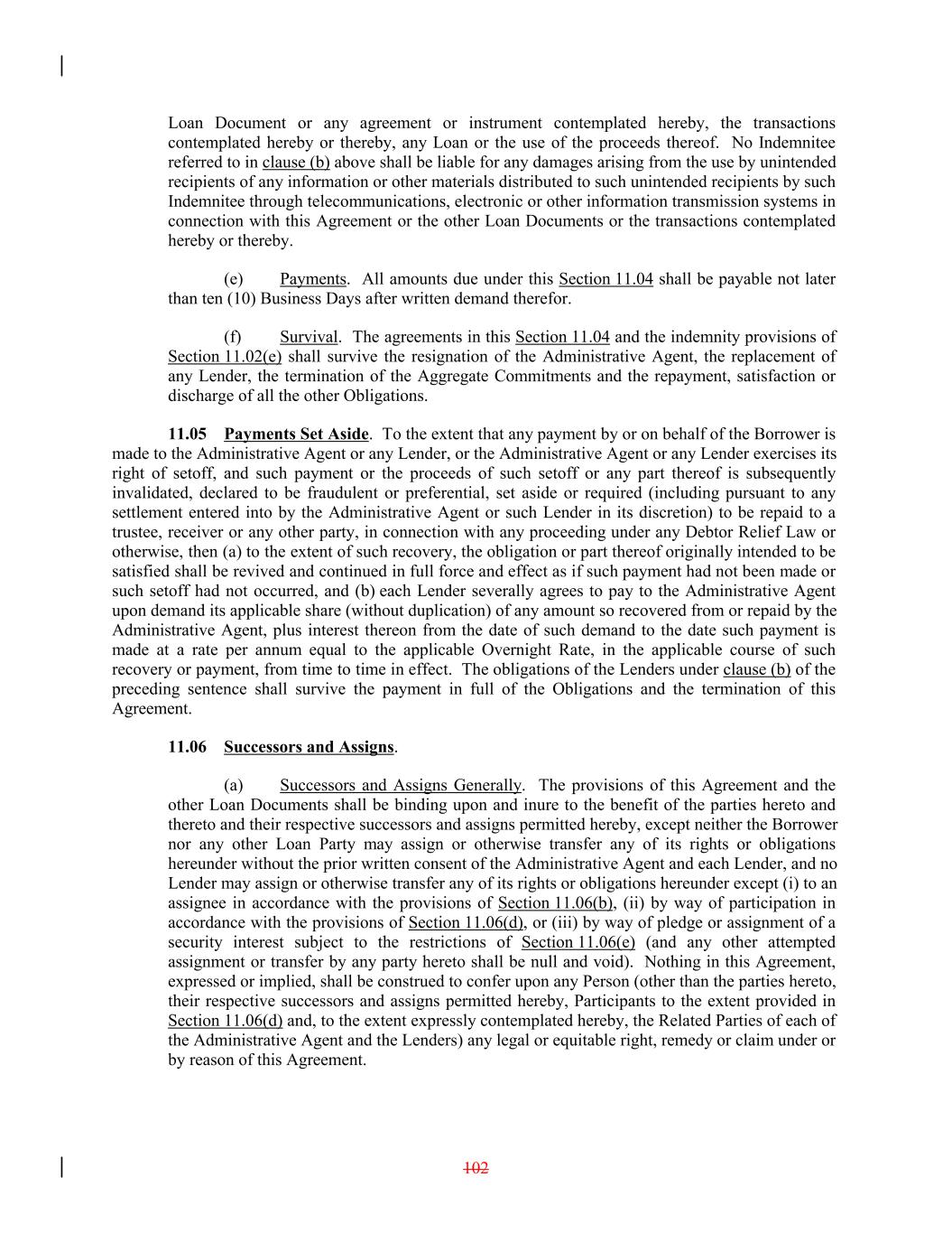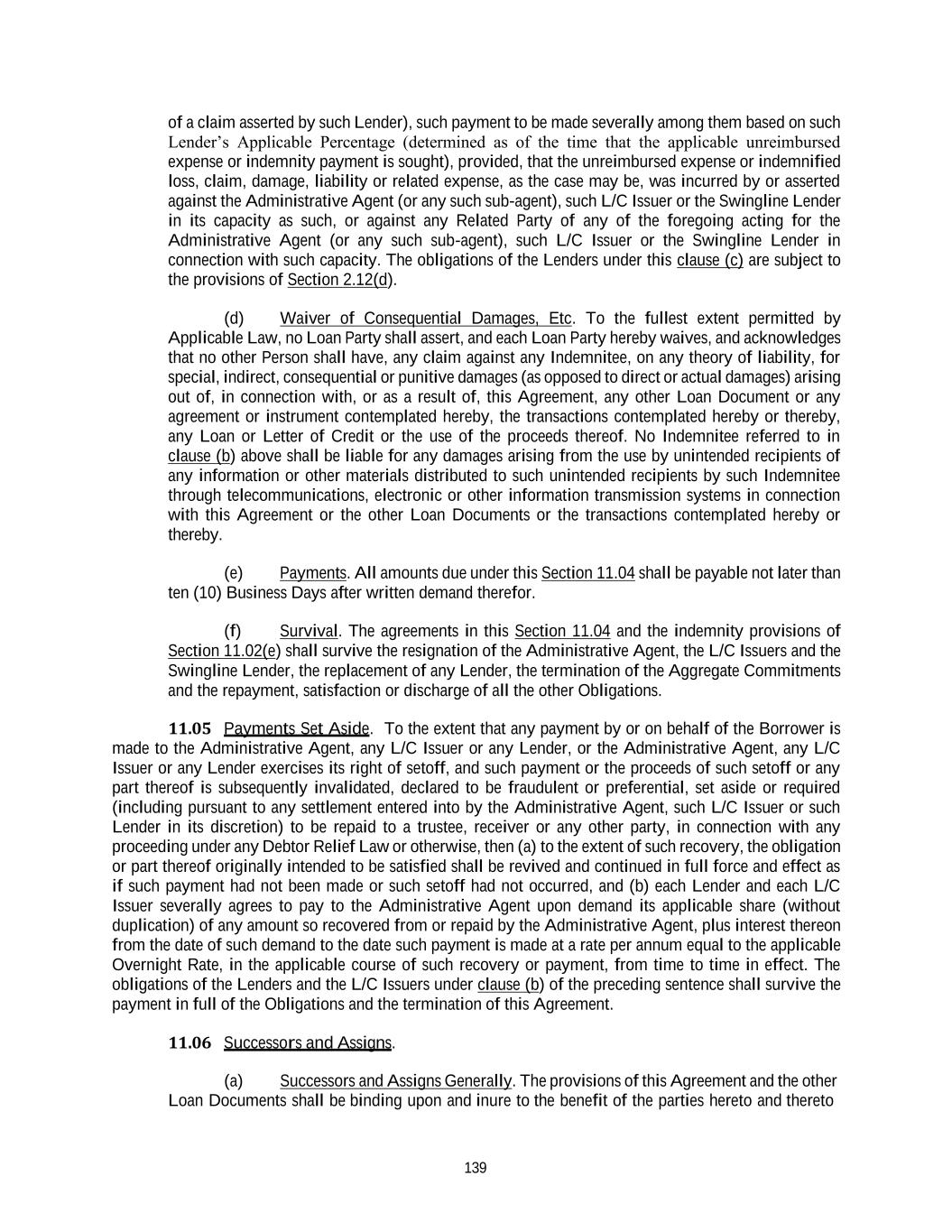 139 of a claim asserted by such Lender), such payment to be made severally among them based on such Lender’s Applicable Percentage (determined as of the time that the applicable unreimbursed expense or indemnity payment is sought), provided, that the unreimbursed expense or indemnified loss, claim, damage, liability or related expense, as the case may be, was incurred by or asserted against the Administrative Agent (or any such sub-agent), such L/C Issuer or the Swingline Lender in its capacity as such, or against any Related Party of any of the foregoing acting for the Administrative Agent (or any such sub-agent), such L/C Issuer or the Swingline Lender in connection with such capacity. The obligations of the Lenders under this clause (c) are subject to the provisions of Section 2.12(d). (d) Waiver of Consequential Damages, Etc. To the fullest extent permitted by Applicable Law, no Loan Party shall assert, and each Loan Party hereby waives, and acknowledges that no other Person shall have, any claim against any Indemnitee, on any theory of liability, for special, indirect, consequential or punitive damages (as opposed to direct or actual damages) arising out of, in connection with, or as a result of, this Agreement, any other Loan Document or any agreement or instrument contemplated hereby, the transactions contemplated hereby or thereby, any Loan or Letter of Credit or the use of the proceeds thereof. No Indemnitee referred to in clause (b) above shall be liable for any damages arising from the use by unintended recipients of any information or other materials distributed to such unintended recipients by such Indemnitee through telecommunications, electronic or other information transmission systems in connection with this Agreement or the other Loan Documents or the transactions contemplated hereby or thereby. (e) Payments. All amounts due under this Section 11.04 shall be payable not later than ten (10) Business Days after written demand therefor. (f) Survival. The agreements in this Section 11.04 and the indemnity provisions of Section 11.02(e) shall survive the resignation of the Administrative Agent, the L/C Issuers and the Swingline Lender, the replacement of any Lender, the termination of the Aggregate Commitments and the repayment, satisfaction or discharge of all the other Obligations. 11.05 Payments Set Aside. To the extent that any payment by or on behalf of the Borrower is made to the Administrative Agent, any L/C Issuer or any Lender, or the Administrative Agent, any L/C Issuer or any Lender exercises its right of setoff, and such payment or the proceeds of such setoff or any part thereof is subsequently invalidated, declared to be fraudulent or preferential, set aside or required (including pursuant to any settlement entered into by the Administrative Agent, such L/C Issuer or such Lender in its discretion) to be repaid to a trustee, receiver or any other party, in connection with any proceeding under any Debtor Relief Law or otherwise, then (a) to the extent of such recovery, the obligation or part thereof originally intended to be satisfied shall be revived and continued in full force and effect as if such payment had not been made or such setoff had not occurred, and (b) each Lender and each L/C Issuer severally agrees to pay to the Administrative Agent upon demand its applicable share (without duplication) of any amount so recovered from or repaid by the Administrative Agent, plus interest thereon from the date of such demand to the date such payment is made at a rate per annum equal to the applicable Overnight Rate, in the applicable course of such recovery or payment, from time to time in effect. The obligations of the Lenders and the L/C Issuers under clause (b) of the preceding sentence shall survive the payment in full of the Obligations and the termination of this Agreement. 11.06 Successors and Assigns. (a) Successors and Assigns Generally. The provisions of this Agreement and the other Loan Documents shall be binding upon and inure to the benefit of the parties hereto and thereto