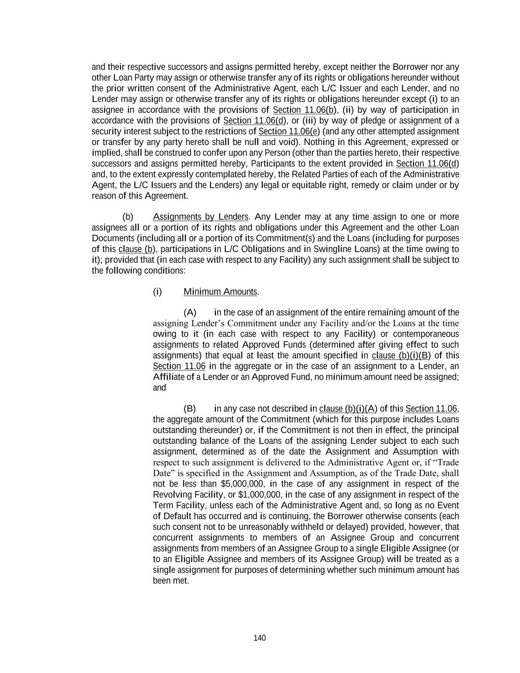 140 and their respective successors and assigns permitted hereby, except neither the Borrower nor any other Loan Party may assign or otherwise transfer any of its rights or obligations hereunder without the prior written consent of the Administrative Agent, each L/C Issuer and each Lender, and no Lender may assign or otherwise transfer any of its rights or obligations hereunder except (i) to an assignee in accordance with the provisions of Section 11.06(b), (ii) by way of participation in accordance with the provisions of Section 11.06(d), or (iii) by way of pledge or assignment of a security interest subject to the restrictions of Section 11.06(e) (and any other attempted assignment or transfer by any party hereto shall be null and void). Nothing in this Agreement, expressed or implied, shall be construed to confer upon any Person (other than the parties hereto, their respective successors and assigns permitted hereby, Participants to the extent provided in Section 11.06(d) and, to the extent expressly contemplated hereby, the Related Parties of each of the Administrative Agent, the L/C Issuers and the Lenders) any legal or equitable right, remedy or claim under or by reason of this Agreement. (b) Assignments by Lenders. Any Lender may at any time assign to one or more assignees all or a portion of its rights and obligations under this Agreement and the other Loan Documents (including all or a portion of its Commitment(s) and the Loans (including for purposes of this clause (b), participations in L/C Obligations and in Swingline Loans) at the time owing to it); provided that (in each case with respect to any Facility) any such assignment shall be subject to the following conditions: (i) Minimum Amounts. (A) in the case of an assignment of the entire remaining amount of the assigning Lender’s Commitment under any Facility and/or the Loans at the time owing to it (in each case with respect to any Facility) or contemporaneous assignments to related Approved Funds (determined after giving effect to such assignments) that equal at least the amount specified in clause (b)(i)(B) of this Section 11.06 in the aggregate or in the case of an assignment to a Lender, an Affiliate of a Lender or an Approved Fund, no minimum amount need be assigned; and (B) in any case not described in clause (b)(i)(A) of this Section 11.06, the aggregate amount of the Commitment (which for this purpose includes Loans outstanding thereunder) or, if the Commitment is not then in effect, the principal outstanding balance of the Loans of the assigning Lender subject to each such assignment, determined as of the date the Assignment and Assumption with respect to such assignment is delivered to the Administrative Agent or, if “Trade Date” is specified in the Assignment and Assumption, as of the Trade Date, shall not be less than $5,000,000, in the case of any assignment in respect of the Revolving Facility, or $1,000,000, in the case of any assignment in respect of the Term Facility, unless each of the Administrative Agent and, so long as no Event of Default has occurred and is continuing, the Borrower otherwise consents (each such consent not to be unreasonably withheld or delayed) provided, however, that concurrent assignments to members of an Assignee Group and concurrent assignments from members of an Assignee Group to a single Eligible Assignee (or to an Eligible Assignee and members of its Assignee Group) will be treated as a single assignment for purposes of determining whether such minimum amount has been met.