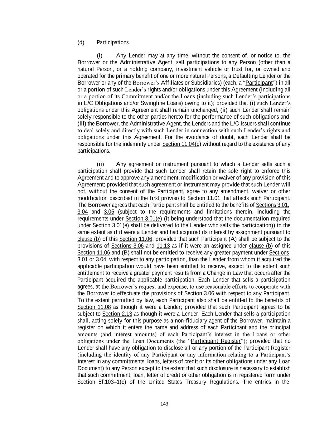 143 (d) Participations. (i) Any Lender may at any time, without the consent of, or notice to, the Borrower or the Administrative Agent, sell participations to any Person (other than a natural Person, or a holding company, investment vehicle or trust for, or owned and operated for the primary benefit of one or more natural Persons, a Defaulting Lender or the Borrower or any of the Borrower’s Affiliates or Subsidiaries) (each, a “Participant”) in all or a portion of such Lender’s rights and/or obligations under this Agreement (including all or a portion of its Commitment and/or the Loans (including such Lender’s participations in L/C Obligations and/or Swingline Loans) owing to it); provided that (i) such Lender’s obligations under this Agreement shall remain unchanged, (ii) such Lender shall remain solely responsible to the other parties hereto for the performance of such obligations and (iii) the Borrower, the Administrative Agent, the Lenders and the L/C Issuers shall continue to deal solely and directly with such Lender in connection with such Lender’s rights and obligations under this Agreement. For the avoidance of doubt, each Lender shall be responsible for the indemnity under Section 11.04(c) without regard to the existence of any participations. (ii) Any agreement or instrument pursuant to which a Lender sells such a participation shall provide that such Lender shall retain the sole right to enforce this Agreement and to approve any amendment, modification or waiver of any provision of this Agreement; provided that such agreement or instrument may provide that such Lender will not, without the consent of the Participant, agree to any amendment, waiver or other modification described in the first proviso to Section 11.01 that affects such Participant. The Borrower agrees that each Participant shall be entitled to the benefits of Sections 3.01, 3.04 and 3.05 (subject to the requirements and limitations therein, including the requirements under Section 3.01(e) (it being understood that the documentation required under Section 3.01(e) shall be delivered to the Lender who sells the participation)) to the same extent as if it were a Lender and had acquired its interest by assignment pursuant to clause (b) of this Section 11.06; provided that such Participant (A) shall be subject to the provisions of Sections 3.06 and 11.13 as if it were an assignee under clause (b) of this Section 11.06 and (B) shall not be entitled to receive any greater payment under Sections 3.01 or 3.04, with respect to any participation, than the Lender from whom it acquired the applicable participation would have been entitled to receive, except to the extent such entitlement to receive a greater payment results from a Change in Law that occurs after the Participant acquired the applicable participation. Each Lender that sells a participation agrees, at the Borrower’s request and expense, to use reasonable efforts to cooperate with the Borrower to effectuate the provisions of Section 3.06 with respect to any Participant. To the extent permitted by law, each Participant also shall be entitled to the benefits of Section 11.08 as though it were a Lender; provided that such Participant agrees to be subject to Section 2.13 as though it were a Lender. Each Lender that sells a participation shall, acting solely for this purpose as a non-fiduciary agent of the Borrower, maintain a register on which it enters the name and address of each Participant and the principal amounts (and interest amounts) of each Participant’s interest in the Loans or other obligations under the Loan Documents (the “Participant Register”); provided that no Lender shall have any obligation to disclose all or any portion of the Participant Register (including the identity of any Participant or any information relating to a Participant’s interest in any commitments, loans, letters of credit or its other obligations under any Loan Document) to any Person except to the extent that such disclosure is necessary to establish that such commitment, loan, letter of credit or other obligation is in registered form under Section 5f.103–1(c) of the United States Treasury Regulations. The entries in the