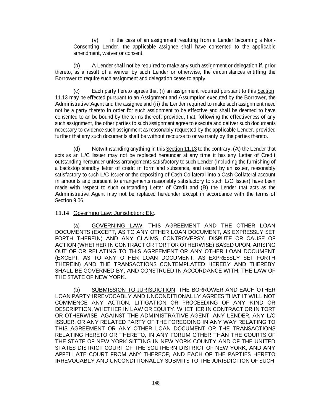 148 (v) in the case of an assignment resulting from a Lender becoming a Non- Consenting Lender, the applicable assignee shall have consented to the applicable amendment, waiver or consent. (b) A Lender shall not be required to make any such assignment or delegation if, prior thereto, as a result of a waiver by such Lender or otherwise, the circumstances entitling the Borrower to require such assignment and delegation cease to apply. (c) Each party hereto agrees that (i) an assignment required pursuant to this Section 11.13 may be effected pursuant to an Assignment and Assumption executed by the Borrower, the Administrative Agent and the assignee and (ii) the Lender required to make such assignment need not be a party thereto in order for such assignment to be effective and shall be deemed to have consented to an be bound by the terms thereof; provided, that, following the effectiveness of any such assignment, the other parties to such assignment agree to execute and deliver such documents necessary to evidence such assignment as reasonably requested by the applicable Lender, provided further that any such documents shall be without recourse to or warranty by the parties thereto. (d) Notwithstanding anything in this Section 11.13 to the contrary, (A) the Lender that acts as an L/C Issuer may not be replaced hereunder at any time it has any Letter of Credit outstanding hereunder unless arrangements satisfactory to such Lender (including the furnishing of a backstop standby letter of credit in form and substance, and issued by an issuer, reasonably satisfactory to such L/C Issuer or the depositing of Cash Collateral into a Cash Collateral account in amounts and pursuant to arrangements reasonably satisfactory to such L/C Issuer) have been made with respect to such outstanding Letter of Credit and (B) the Lender that acts as the Administrative Agent may not be replaced hereunder except in accordance with the terms of Section 9.06. 11.14 Governing Law; Jurisdiction; Etc. (a) GOVERNING LAW. THIS AGREEMENT AND THE OTHER LOAN DOCUMENTS (EXCEPT, AS TO ANY OTHER LOAN DOCUMENT, AS EXPRESSLY SET FORTH THEREIN) AND ANY CLAIMS, CONTROVERSY, DISPUTE OR CAUSE OF ACTION (WHETHER IN CONTRACT OR TORT OR OTHERWISE) BASED UPON, ARISING OUT OF OR RELATING TO THIS AGREEMENT OR ANY OTHER LOAN DOCUMENT (EXCEPT, AS TO ANY OTHER LOAN DOCUMENT, AS EXPRESSLY SET FORTH THEREIN) AND THE TRANSACTIONS CONTEMPLATED HEREBY AND THEREBY SHALL BE GOVERNED BY, AND CONSTRUED IN ACCORDANCE WITH, THE LAW OF THE STATE OF NEW YORK. (b) SUBMISSION TO JURISDICTION. THE BORROWER AND EACH OTHER LOAN PARTY IRREVOCABLY AND UNCONDITIONALLY AGREES THAT IT WILL NOT COMMENCE ANY ACTION, LITIGATION OR PROCEEDING OF ANY KIND OR DESCRIPTION, WHETHER IN LAW OR EQUITY, WHETHER IN CONTRACT OR IN TORT OR OTHERWISE, AGAINST THE ADMINISTRATIVE AGENT, ANY LENDER, ANY L/C ISSUER, OR ANY RELATED PARTY OF THE FOREGOING IN ANY WAY RELATING TO THIS AGREEMENT OR ANY OTHER LOAN DOCUMENT OR THE TRANSACTIONS RELATING HERETO OR THERETO, IN ANY FORUM OTHER THAN THE COURTS OF THE STATE OF NEW YORK SITTING IN NEW YORK COUNTY AND OF THE UNITED STATES DISTRICT COURT OF THE SOUTHERN DISTRICT OF NEW YORK, AND ANY APPELLATE COURT FROM ANY THEREOF, AND EACH OF THE PARTIES HERETO IRREVOCABLY AND UNCONDITIONALLY SUBMITS TO THE JURISDICTION OF SUCH