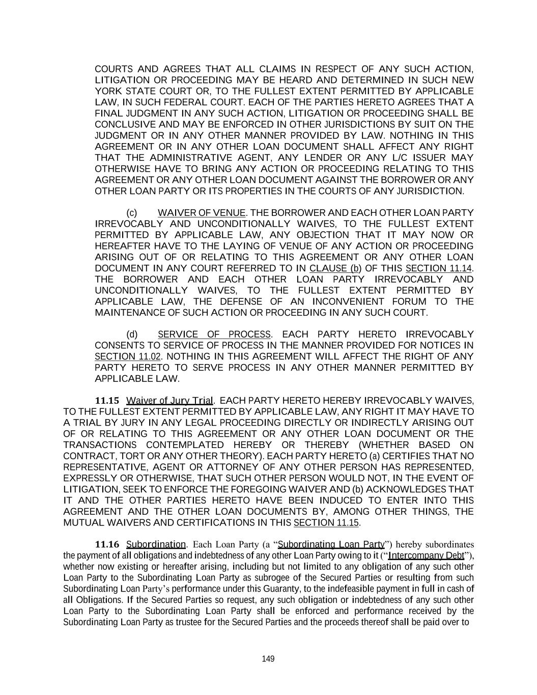 149 COURTS AND AGREES THAT ALL CLAIMS IN RESPECT OF ANY SUCH ACTION, LITIGATION OR PROCEEDING MAY BE HEARD AND DETERMINED IN SUCH NEW YORK STATE COURT OR, TO THE FULLEST EXTENT PERMITTED BY APPLICABLE LAW, IN SUCH FEDERAL COURT. EACH OF THE PARTIES HERETO AGREES THAT A FINAL JUDGMENT IN ANY SUCH ACTION, LITIGATION OR PROCEEDING SHALL BE CONCLUSIVE AND MAY BE ENFORCED IN OTHER JURISDICTIONS BY SUIT ON THE JUDGMENT OR IN ANY OTHER MANNER PROVIDED BY LAW. NOTHING IN THIS AGREEMENT OR IN ANY OTHER LOAN DOCUMENT SHALL AFFECT ANY RIGHT THAT THE ADMINISTRATIVE AGENT, ANY LENDER OR ANY L/C ISSUER MAY OTHERWISE HAVE TO BRING ANY ACTION OR PROCEEDING RELATING TO THIS AGREEMENT OR ANY OTHER LOAN DOCUMENT AGAINST THE BORROWER OR ANY OTHER LOAN PARTY OR ITS PROPERTIES IN THE COURTS OF ANY JURISDICTION. (c) WAIVER OF VENUE. THE BORROWER AND EACH OTHER LOAN PARTY IRREVOCABLY AND UNCONDITIONALLY WAIVES, TO THE FULLEST EXTENT PERMITTED BY APPLICABLE LAW, ANY OBJECTION THAT IT MAY NOW OR HEREAFTER HAVE TO THE LAYING OF VENUE OF ANY ACTION OR PROCEEDING ARISING OUT OF OR RELATING TO THIS AGREEMENT OR ANY OTHER LOAN DOCUMENT IN ANY COURT REFERRED TO IN CLAUSE (b) OF THIS SECTION 11.14. THE BORROWER AND EACH OTHER LOAN PARTY IRREVOCABLY AND UNCONDITIONALLY WAIVES, TO THE FULLEST EXTENT PERMITTED BY APPLICABLE LAW, THE DEFENSE OF AN INCONVENIENT FORUM TO THE MAINTENANCE OF SUCH ACTION OR PROCEEDING IN ANY SUCH COURT. (d) SERVICE OF PROCESS. EACH PARTY HERETO IRREVOCABLY CONSENTS TO SERVICE OF PROCESS IN THE MANNER PROVIDED FOR NOTICES IN SECTION 11.02. NOTHING IN THIS AGREEMENT WILL AFFECT THE RIGHT OF ANY PARTY HERETO TO SERVE PROCESS IN ANY OTHER MANNER PERMITTED BY APPLICABLE LAW. 11.15 Waiver of Jury Trial. EACH PARTY HERETO HEREBY IRREVOCABLY WAIVES, TO THE FULLEST EXTENT PERMITTED BY APPLICABLE LAW, ANY RIGHT IT MAY HAVE TO A TRIAL BY JURY IN ANY LEGAL PROCEEDING DIRECTLY OR INDIRECTLY ARISING OUT OF OR RELATING TO THIS AGREEMENT OR ANY OTHER LOAN DOCUMENT OR THE TRANSACTIONS CONTEMPLATED HEREBY OR THEREBY (WHETHER BASED ON CONTRACT, TORT OR ANY OTHER THEORY). EACH PARTY HERETO (a) CERTIFIES THAT NO REPRESENTATIVE, AGENT OR ATTORNEY OF ANY OTHER PERSON HAS REPRESENTED, EXPRESSLY OR OTHERWISE, THAT SUCH OTHER PERSON WOULD NOT, IN THE EVENT OF LITIGATION, SEEK TO ENFORCE THE FOREGOING WAIVER AND (b) ACKNOWLEDGES THAT IT AND THE OTHER PARTIES HERETO HAVE BEEN INDUCED TO ENTER INTO THIS AGREEMENT AND THE OTHER LOAN DOCUMENTS BY, AMONG OTHER THINGS, THE MUTUAL WAIVERS AND CERTIFICATIONS IN THIS SECTION 11.15. 11.16 Subordination. Each Loan Party (a “Subordinating Loan Party”) hereby subordinates the payment of all obligations and indebtedness of any other Loan Party owing to it (“Intercompany Debt”), whether now existing or hereafter arising, including but not limited to any obligation of any such other Loan Party to the Subordinating Loan Party as subrogee of the Secured Parties or resulting from such Subordinating Loan Party’s performance under this Guaranty, to the indefeasible payment in full in cash of all Obligations. If the Secured Parties so request, any such obligation or indebtedness of any such other Loan Party to the Subordinating Loan Party shall be enforced and performance received by the Subordinating Loan Party as trustee for the Secured Parties and the proceeds thereof shall be paid over to