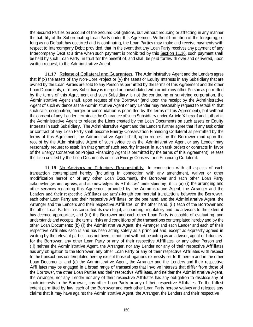 150 the Secured Parties on account of the Secured Obligations, but without reducing or affecting in any manner the liability of the Subordinating Loan Party under this Agreement. Without limitation of the foregoing, so long as no Default has occurred and is continuing, the Loan Parties may make and receive payments with respect to Intercompany Debt; provided, that in the event that any Loan Party receives any payment of any Intercompany Debt at a time when such payment is prohibited by this Section 11.16, such payment shall be held by such Loan Party, in trust for the benefit of, and shall be paid forthwith over and delivered, upon written request, to the Administrative Agent. 11.17 Release of Collateral and Guarantees. The Administrative Agent and the Lenders agree that if (x) the assets of any Non-Core Project or (y) the assets or Equity Interests in any Subsidiary that are owned by the Loan Parties are sold to any Person as permitted by the terms of this Agreement and the other Loan Documents, or if any Subsidiary is merged or consolidated with or into any other Person as permitted by the terms of this Agreement and such Subsidiary is not the continuing or surviving corporation, the Administrative Agent shall, upon request of the Borrower (and upon the receipt by the Administrative Agent of such evidence as the Administrative Agent or any Lender may reasonably request to establish that such sale, designation, merger or consolidation is permitted by the terms of this Agreement), but without the consent of any Lender, terminate the Guarantee of such Subsidiary under Article X hereof and authorize the Administrative Agent to release the Liens created by the Loan Documents on such assets or Equity Interests in such Subsidiary. The Administrative Agent and the Lenders further agree that if any task order or contract of any Loan Party shall become Energy Conservation Financing Collateral as permitted by the terms of this Agreement, the Administrative Agent shall, upon request by the Borrower (and upon the receipt by the Administrative Agent of such evidence as the Administrative Agent or any Lender may reasonably request to establish that grant of such security interest in such task orders or contracts in favor of the Energy Conservation Project Financing Agent is permitted by the terms of this Agreement), release the Lien created by the Loan Documents on such Energy Conservation Financing Collateral. 11.18 No Advisory or Fiduciary Responsibility. In connection with all aspects of each transaction contemplated hereby (including in connection with any amendment, waiver or other modification hereof or of any other Loan Document), the Borrower and each other Loan Party acknowledges and agrees, and acknowledges its Affiliates’ understanding, that: (a) (i) the arranging and other services regarding this Agreement provided by the Administrative Agent, the Arranger and the Lenders and their respective Affiliates are arm’s-length commercial transactions between the Borrower, each other Loan Party and their respective Affiliates, on the one hand, and the Administrative Agent, the Arranger and the Lenders and their respective Affiliates, on the other hand, (ii) each of the Borrower and the other Loan Parties has consulted its own legal, accounting, regulatory and tax advisors to the extent it has deemed appropriate, and (iii) the Borrower and each other Loan Party is capable of evaluating, and understands and accepts, the terms, risks and conditions of the transactions contemplated hereby and by the other Loan Documents; (b) (i) the Administrative Agent, the Arranger and each Lender and each of their respective Affiliates each is and has been acting solely as a principal and, except as expressly agreed in writing by the relevant parties, has not been, is not, and will not be acting as an advisor, agent or fiduciary, for the Borrower, any other Loan Party or any of their respective Affiliates, or any other Person and (ii) neither the Administrative Agent, the Arranger, nor any Lender nor any of their respective Affiliates has any obligation to the Borrower, any other Loan Party or any of their respective Affiliates with respect to the transactions contemplated hereby except those obligations expressly set forth herein and in the other Loan Documents; and (c) the Administrative Agent, the Arranger and the Lenders and their respective Affiliates may be engaged in a broad range of transactions that involve interests that differ from those of the Borrower, the other Loan Parties and their respective Affiliates, and neither the Administrative Agent, the Arranger, nor any Lender nor any of their respective Affiliates has any obligation to disclose any of such interests to the Borrower, any other Loan Party or any of their respective Affiliates. To the fullest extent permitted by law, each of the Borrower and each other Loan Party hereby waives and releases any claims that it may have against the Administrative Agent, the Arranger, the Lenders and their respective