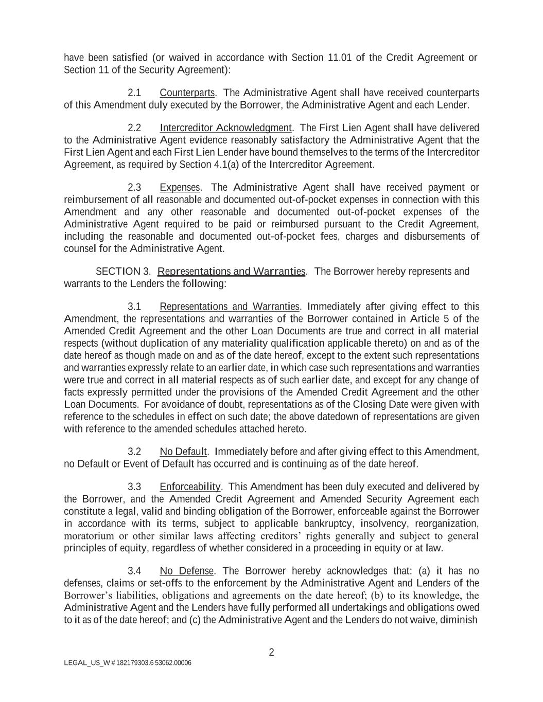 iv 11.11 Survival of Representations and Warranties.................................................................... 147 11.12 Severability...................................................................................................................... 147 11.13 Replacement of Lenders .................................................................................................. 147 11.14 Governing Law; Jurisdiction; Etc .................................................................................... 148 11.15 Waiver of Jury Trial ........................................................................................................ 149 11.16 Subordination .................................................................................................................. 149 11.17 Release of Collateral and Guarantees .............................................................................. 150 11.18 No Advisory or Fiduciary Responsibility ........................................................................ 150 11.19 Electronic Execution; Electronic Records; Counterparts ................................................ 151 11.20 USA Patriot Act Notice ................................................................................................... 152 11.21 Acknowledgement and Consent to Bail-In of Affected Financial Institutions ................ 152 11.22 Acknowledgement Regarding Any Supported QFCs ...................................................... 152 11.23 Judgment Currency ......................................................................................................... 153 11.24 Transitional Arrangements .............................................................................................. 153 11.25 Intercreditor Agreement .................................................................................................. 154