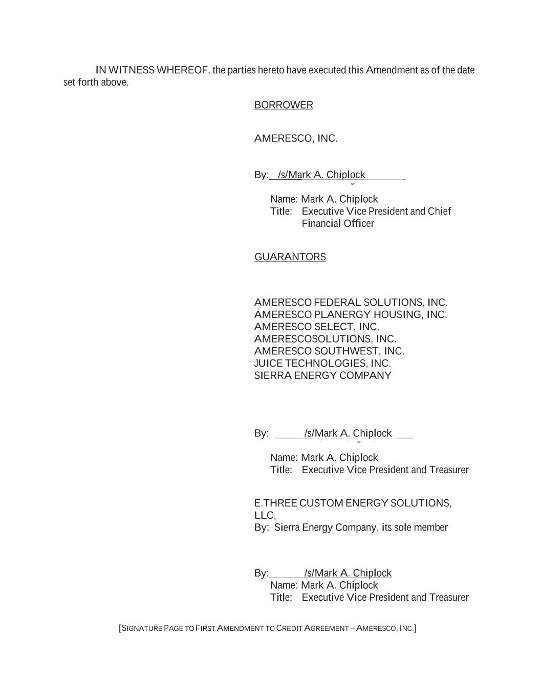[Signature page of Credit Agreement] IN WITNESS WHEREOF, the parties hereto have caused this Agreement to be duly executed as of the date first above written. BORROWER AMERESCO, INC. By: /s/Mark A. Chiplock Name: Mark A. Chiplock Title: Treasurer, Executive Vice President and Chief Financial Officer GUARANTORS AMERESCO FEDERAL SOLUTIONS, INC. AMERESCO PLANERGY HOUSING, INC. AMERESCO SELECT, INC. AMERESCOSOLUTIONS, INC. AMERESCO SOUTHWEST, INC. JUICE TECHNOLOGIES, INC. SIERRA ENERGY COMPANY By: /s/Mark A. Chiplock Name: Mark A. Chiplock Title: Executive Vice President and Treasurer E.THREE CUSTOM ENERGY SOLUTIONS, LLC, By: Sierra Energy Company, its sole member By: /s/Mark A. Chiplock Name: Mark A. Chiplock Title: Executive Vice President and Treasurer