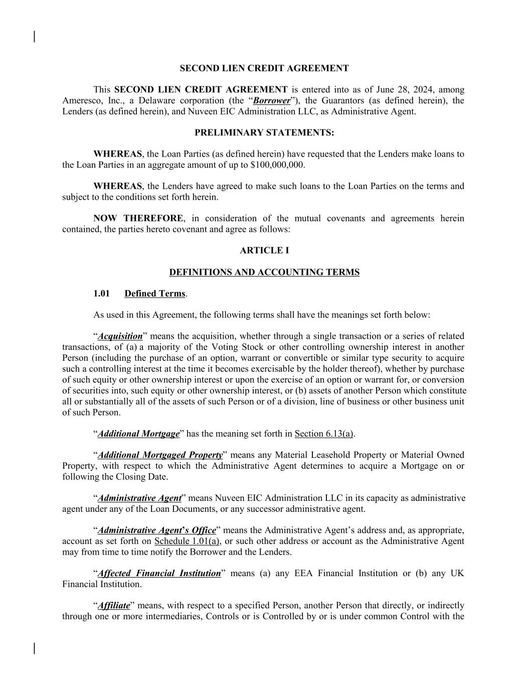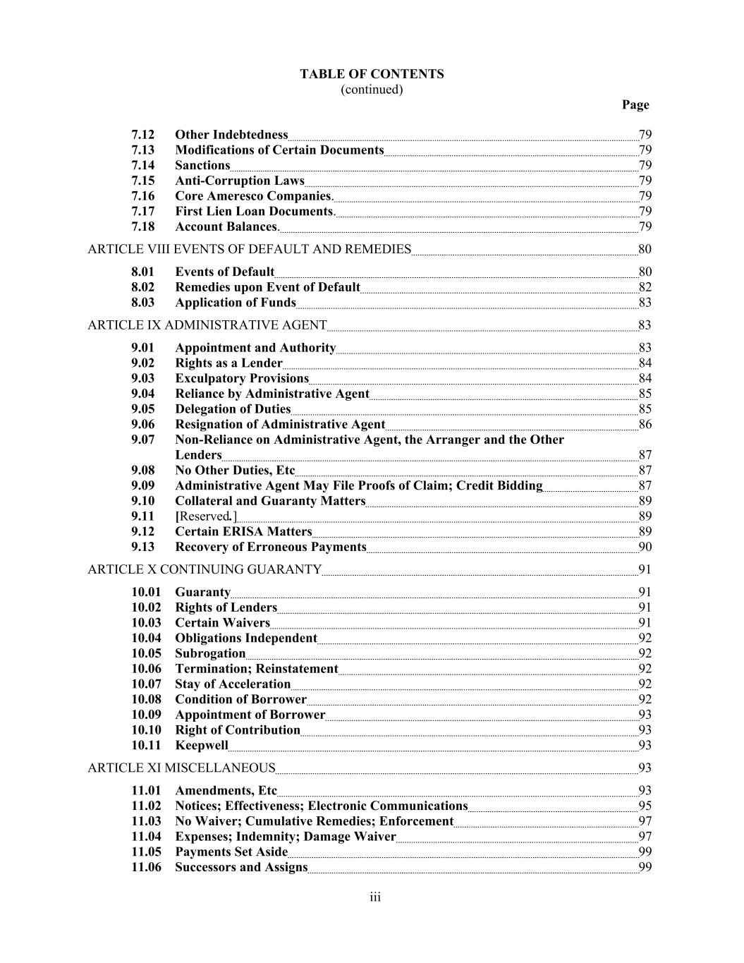 iii 7.11 Lines of Business ............................................................................................................ 116 7.12 Other Indebtedness .......................................................................................................... 116 7.13 Modifications of Certain Documents .............................................................................. 116 7.14 Sanctions ......................................................................................................................... 116 7.15 Anti-Corruption Laws ..................................................................................................... 116 7.16 Core Ameresco Companies ............................................................................................. 116 7.17 Junior Loan Documents .................................................................................................. 116 7.18 Account Balances ............................................................................................................ 116 ARTICLE VIII EVENTS OF DEFAULT AND REMEDIES .................................................................. 117 8.01 Events of Default............................................................................................................. 117 8.02 Remedies upon Event of Default..................................................................................... 119 8.03 Application of Funds ....................................................................................................... 120 ARTICLE IX ADMINISTRATIVE AGENT............................................................................................ 121 9.01 Appointment and Authority ............................................................................................ 121 9.02 Rights as a Lender ........................................................................................................... 122 9.03 Exculpatory Provisions.................................................................................................... 122 9.04 Reliance by Administrative Agent .................................................................................. 123 9.05 Delegation of Duties ....................................................................................................... 123 9.06 Resignation of Administrative Agent .............................................................................. 123 9.07 Non-Reliance on Administrative Agent, the Arranger and the Other Lenders ................ 125 9.08 No Other Duties, Etc ....................................................................................................... 126 9.09 Administrative Agent May File Proofs of Claim; Credit Bidding ................................... 126 9.10 Collateral and Guaranty Matters ..................................................................................... 127 9.11 Secured Cash Management Agreements and Secured Hedge Agreements ..................... 128 9.12 Certain ERISA Matters ................................................................................................... 128 9.13 Recovery of Erroneous Payments ................................................................................... 129 ARTICLE X CONTINUING GUARANTY ............................................................................................. 130 10.01 Guaranty .......................................................................................................................... 130 10.02 Rights of Lenders ............................................................................................................ 130 10.03 Certain Waivers ............................................................................................................... 130 10.04 Obligations Independent ................................................................................................. 131 10.05 Subrogation ..................................................................................................................... 131 10.06 Termination; Reinstatement ............................................................................................ 131 10.07 Stay of Acceleration ........................................................................................................ 131 10.08 Condition of Borrower .................................................................................................... 131 10.09 Appointment of Borrower ............................................................................................... 131 10.10 Right of Contribution ...................................................................................................... 132 10.11 Keepwell ......................................................................................................................... 132 ARTICLE XI MISCELLANEOUS ........................................................................................................... 132 11.01 Amendments, Etc ............................................................................................................ 132 11.02 Notices; Effectiveness; Electronic Communications ....................................................... 135 11.03 No Waiver; Cumulative Remedies; Enforcement ........................................................... 137 11.04 Expenses; Indemnity; Damage Waiver ........................................................................... 137 11.05 Payments Set Aside ......................................................................................................... 139 11.06 Successors and Assigns ................................................................................................... 139 11.07 Treatment of Certain Information; Confidentiality ......................................................... 144 11.08 Right of Setoff ..................................................