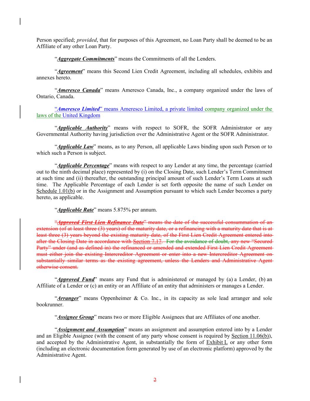 4 (c) denominated in any other Alternative Currency (to the extent such Loans denominated in such currency will bear interest at a term rate), the term rate per annum as designated with respect to such Alternative Currency at the time such Alternative Currency is approved by the Administrative Agent and the relevant Lenders pursuant to Section 1.09(a) plus the adjustment (if any) determined by the Administrative Agent and the relevant Lenders pursuant to Section 1.09(c), provided that if the Alternative Currency Term Rate shall be less than zero percent (0%), such rate shall be deemed to be zero percent (0%) for purposes of this Agreement. “Alternative Currency Term Rate Loan” means a Loan that bears interest at a rate based on the definition of “Alternative Currency Term Rate.” All Alternative Currency Term Rate Loans must be denominated in an Alternative Currency. “Ameresco Canada” means Ameresco Canada, Inc., a company organized under the laws of Ontario, Canada. “Ameresco Limited” means Ameresco Limited, a private limited company organized under the laws of the United Kingdom “Applicable Authority” means (a) with respect to SOFR, the SOFR Administrator or any Governmental Authority having jurisdiction over the Administrative Agent or the SOFR Administrator and (b) with respect to any Alternative Currency, the applicable administrator for the Relevant Rate for such Alternative Currency or any Governmental Authority having jurisdiction over the Administrative Agent or such administrator. “Applicable Law” means, as to any Person, all applicable Laws binding upon such Person or to which such a Person is subject. “Applicable Percentage” means (a) in respect of the Term Facility, with respect to any Term Lender at any time, the percentage (carried out to the ninth decimal place) of the Term Facility represented by (i) on or prior to the Closing Date, such Term Lender’s Term Commitment at such time and (ii) thereafter, the outstanding principal amount of such Term Lender’s Term Loans at such time and (b) in respect of the Revolving Facility, with respect to any Revolving Lender at any time, the percentage (carried out to the ninth decimal place) of the Revolving Facility represented by such Revolving Lender’s Revolving Commitment at such time, in each case, subject to adjustment as provided in Section 2.15. If the Commitment of all of the Revolving Lenders to make Revolving Loans and the obligation of the L/C Issuers to make L/C Credit Extensions have been terminated pursuant to Section 8.02, or if the Revolving Commitments have expired, then the Applicable Percentage of each Lender in respect of such Lender’s Facility shall be determined based on the Applicable Percentage of such Lender in respect of such Lender’s Facility most recently in effect, giving effect to any subsequent assignments and to any Lender’s status as a Defaulting Lender at the time of determination. The Applicable Percentage of each Lender in respect of each Facility is set forth opposite the name of such Lender on Schedule 1.01(b) or in the Assignment and Assumption pursuant to which such Lender becomes a party hereto, as applicable. “Applicable Rate” means, for any day, the rate per annum set forth below opposite the applicable Level then in effect (based on the Core Leverage Ratio), it being understood that the Applicable Rate for (a) Revolving Loans that are Base Rate Loans and Swingline Loans shall be the percentage set forth under the column “Revolving Loans” and “Base Rate”, (b) Revolving Loans that are Term SOFR Loans or Alternative Currency Loans shall be the percentage set forth under the column “Revolving Loans” and “Term SOFR & Letter of Credit Fee”, (c) that portion of the Term Loan comprised of Base Rate Loans