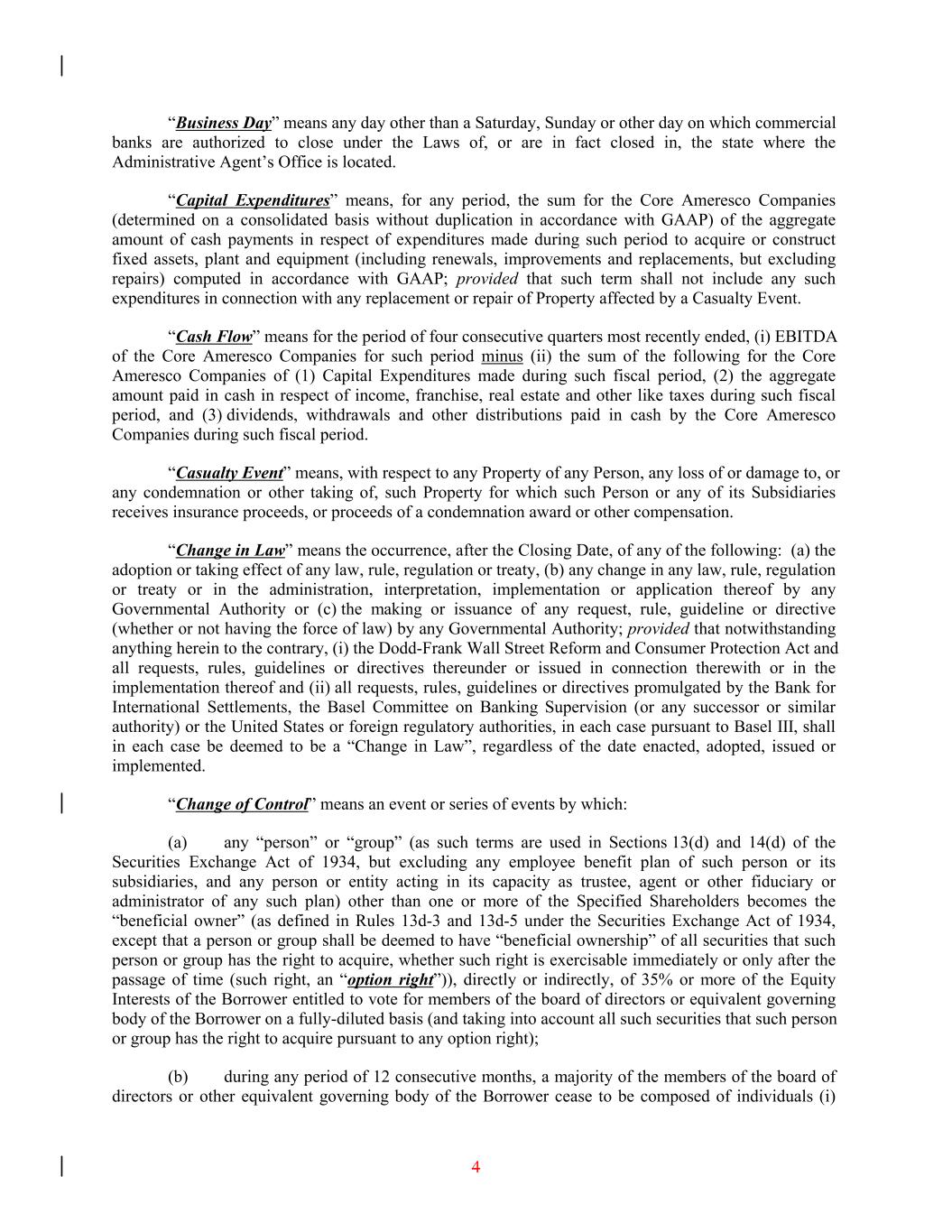 14 excluding (a) the granting of Liens to the Administrative Agent and Lenders and other Liens permitted hereunder, (b) any sale, assignment, transfer or other disposition by any Loan Party of the assets of a Non- Core Project or the Equity Interests of any Non-Core Company, and (c) any sale, assignment, transfer or other disposition of (i) any property sold or disposed of in the ordinary course of business and on ordinary business terms, (ii) any property no longer used or useful in the business of the Loan Parties, and (iii) any Collateral pursuant to an exercise of remedies by the Administrative Agent hereunder or under any other Loan Document. “Division” means the division of the assets, liabilities and/or obligations of a Person (the “Dividing Person”) among two or more Persons (whether pursuant to a “plan of division” or similar arrangement), which may or may not include the Dividing Person and pursuant to which the Dividing Person may or may not survive. “Dollar” and “$” mean lawful money of the United States. “Dollar Equivalent” means, for any amount, at the time of determination thereof, (a) if such amount is expressed in Dollars, such amount, (b) if such amount is expressed in an Alternative Currency, the equivalent of such amount in Dollars determined by using the rate of exchange for the purchase of Dollars with the Alternative Currency last provided (either by publication or otherwise provided to the Administrative Agent or the applicable L/C Issuer, as applicable) by the applicable Bloomberg source (or such other publicly available source for displaying exchange rates) on date that is two (2) Business Days immediately preceding the date of determination (or if such service ceases to be available or ceases to provide such rate of exchange, the equivalent of such amount in Dollars as determined by the Administrative Agent or the applicable L/C Issuer, as applicable, using any method of determination it deems appropriate in its sole discretion) and (c) if such amount is denominated in any other currency, the equivalent of such amount in Dollars as determined by the Administrative Agent or the applicable L/C Issuer, as applicable, using any method of determination it deems appropriate in its sole discretion. Any determination by the Administrative Agent or the applicable L/C Issuer pursuant to clauses (b) or (c) above shall be conclusive absent manifest error. “EBITDA” means, for any period, for the Core Ameresco Companies on a consolidated basis, an amount equal to Consolidated Net Income for such period plus (a) the following to the extent deducted in calculating such Consolidated Net Income: (i) Consolidated Interest Charges for such period, (ii) the provision for federal, state, local and foreign income taxes payable for such period, (iii) depreciation and amortization expense for such period, (iv) Non-Cash Charges for such period, (v) extraordinary or non- recurring expenses for such period, in an amount not to exceed $10,000,000 after the Closing Date (it being understood that any payment required to be made by any Core Ameresco Company in respect of any Non- Core Project Guaranty Liability shall reduce Consolidated Net Income of the Core Ameresco Companies and shall not be added back to EBITDA), and (vi) the aggregate amount received in cash by the Core Ameresco Companies during such period in respect of regularly scheduled dividends or distributions from the Non-Core Companies, calculated and paid in accordance with the organizational documents of such Non-Core Companies; (provided, that the amount added back pursuant to this clause (vi) shall not include any amounts received by the Core Ameresco Companies, in connection with any sale, transfer or other disposition of assets or Equity Interests of any Non-Core Company); minus (b) the following to the extent included in calculating such Consolidated Net Income (i) extraordinary or non-recurring gains during such period (including, without limitation, non-cash gains attributable to the mark to market movement in the valuation of hedging obligations (to the extent the cash impact resulting from such gain has not been realized) or other derivative instruments, and foreign currency translations), and (ii) proceeds received during such period in respect of Casualty Events and Dispositions. For purposes of calculating EBITDA for any period during which a Permitted Acquisition is consummated, EBITDA shall be adjusted in a manner proposed by the Borrower and reasonably satisfactory to the Required Lenders.