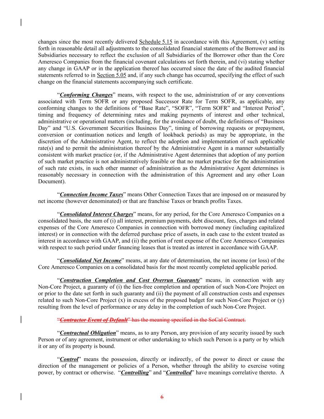 11 Administrative Agent, to reflect the adoption and implementation of such applicable rate(s) and to permit the administration thereof by the Administrative Agent in a manner substantially consistent with market practice (or, if the Administrative Agent determines that adoption of any portion of such market practice is not administratively feasible or that no market practice for the administration of such rate exists, in such other manner of administration as the Administrative Agent determines is reasonably necessary in connection with the administration of this Agreement and any other Loan Document). “Connection Income Taxes” means Other Connection Taxes that are imposed on or measured by net income (however denominated) or that are franchise Taxes or branch profits Taxes. “Consolidated Interest Charges” means, for any period, for the Core Ameresco Companies on a consolidated basis, the sum of (i) all interest, premium payments, debt discount, fees, charges and related expenses of the Core Ameresco Companies in connection with borrowed money (including capitalized interest) or in connection with the deferred purchase price of assets, in each case to the extent treated as interest in accordance with GAAP, and (ii) the portion of rent expense of the Core Ameresco Companies with respect to such period under financing leases that is treated as interest in accordance with GAAP. “Consolidated Net Income” means, at any date of determination, the net income (or loss) of the Core Ameresco Companies on a consolidated basis for the most recently completed applicable period. “Construction Completion and Cost Overrun Guaranty” means, in connection with any Non-Core Project, a guaranty of (i) the lien-free completion and operation of such Non-Core Project on or prior to the date set forth in such guaranty and (ii) the payment of all construction costs and expenses related to such Non-Core Project (x) in excess of the proposed budget for such Non-Core Project or (y) resulting from the level of performance or any delay in the completion of such Non-Core Project. “Contractual Obligation” means, as to any Person, any provision of any security issued by such Person or of any agreement, instrument or other undertaking to which such Person is a party or by which it or any of its property is bound. “Control” means the possession, directly or indirectly, of the power to direct or cause the direction of the management or policies of a Person, whether through the ability to exercise voting power, by contract or otherwise. “Controlling” and “Controlled” have meanings correlative thereto. A Person who owns or holds capital stock, beneficial interests or other securities representing ten percent (10%) or more of the Total Voting Power of another Person shall be deemed, for purposes of this Agreement, to “control” such other Person. “Control Agreement” means, with respect to any deposit or securities account of any Loan Party, a control agreement, in form and substance reasonably satisfactory to the Administrative Agent, executed and delivered by such Loan Party, the financial institution at which such account is maintained and the Administrative Agent, as any such agreement may be amended, supplemented or otherwise modified from time to time. “Copyrights” means all copyrights, whether statutory or common law, owned by or assigned to the Loan Parties, and all exclusive and nonexclusive licenses to the Loan Parties from third parties or rights to use copyrights owned by such third parties, including, without limitation, the registrations, applications and licenses listed on Schedule 5.08 hereto, along with any and all (i) renewals and extensions thereof, (ii) income, royalties, damages, claims and payments now and hereafter due and/or payable with respect thereto, including, without limitation, damages and payments for past, present or future infringements thereof, (iii) rights to sue for past, present and future infringements thereof, and (iv) foreign copyrights and any other rights corresponding thereto throughout the world.