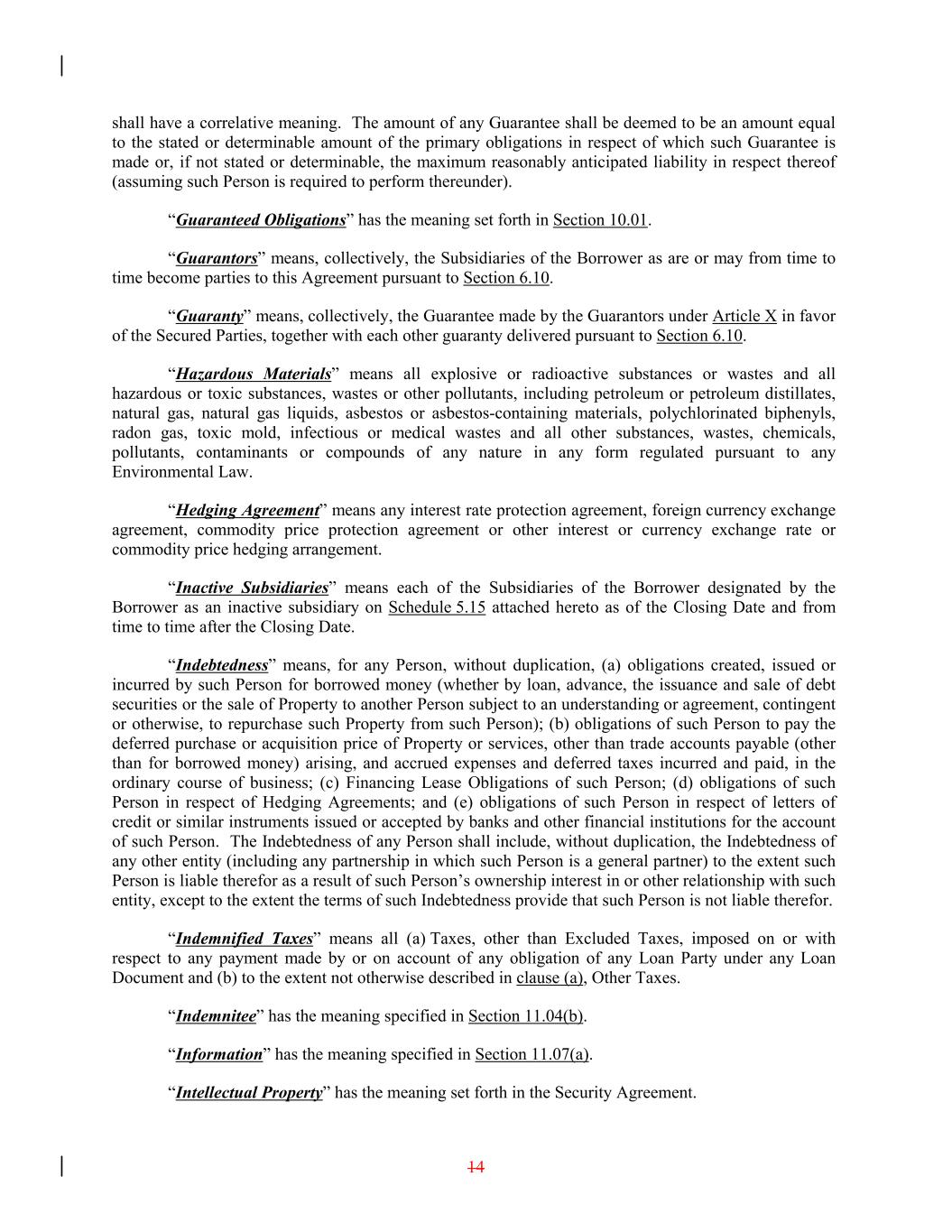 20 “Guaranty” means, collectively, the Guarantee made by the Guarantors under Article X in favor of the Secured Parties, together with each other guaranty delivered pursuant to Section 6.10. “Hazardous Materials” means all explosive or radioactive substances or wastes and all hazardous or toxic substances, wastes or other pollutants, including petroleum or petroleum distillates, natural gas, natural gas liquids, asbestos or asbestos-containing materials, polychlorinated biphenyls, radon gas, toxic mold, infectious or medical wastes and all other substances, wastes, chemicals, pollutants, contaminants or compounds of any nature in any form regulated pursuant to any Environmental Law. “Hedge Bank” means any Person in its capacity as a party to a Swap Contract that, at the time it enters into a Swap Contract not prohibited under Articles VI or VII, is a Lender or an Affiliate of a Lender, in its capacity as a party to such Swap Contract (even if such Person ceases to be a Lender or such Person’s Affiliate ceased to be a Lender); provided, in the case of a Secured Hedge Agreement with a Person who is no longer a Lender (or Affiliate of a Lender), such Person shall be considered a Hedge Bank only through the stated termination date (without extension or renewal) of such Secured Hedge Agreement and provided further that for any of the foregoing to be included as a “Secured Hedge Agreement” on any date of determination by the Administrative Agent, the applicable Hedge Bank (other than the Administrative Agent or an Affiliate of the Administrative Agent) must have delivered a Secured Party Designation Notice to the Administrative Agent prior to such date of determination. “Hedging Agreement” means any interest rate protection agreement, foreign currency exchange agreement, commodity price protection agreement or other interest or currency exchange rate or commodity price hedging arrangement. “Inactive Subsidiaries” means each of the Subsidiaries of the Borrower designated by the Borrower as an inactive subsidiary on Schedule 5.15 attached hereto as of the Closing Date and from time to time after the Closing Date. “Indebtedness” means, for any Person, without duplication, (a) obligations created, issued or incurred by such Person for borrowed money (whether by loan, advance, the issuance and sale of debt securities or the sale of Property to another Person subject to an understanding or agreement, contingent or otherwise, to repurchase such Property from such Person); (b) obligations of such Person to pay the deferred purchase or acquisition price of Property or services, other than trade accounts payable (other than for borrowed money) arising, and accrued expenses and deferred taxes incurred and paid, in the ordinary course of business; (c) Financing Lease Obligations of such Person; (d) obligations of such Person in respect of Hedging Agreements; and (e) obligations of such Person in respect of letters of credit or similar instruments issued or accepted by banks and other financial institutions for the account of such Person. The Indebtedness of any Person shall include, without duplication, the Indebtedness of any other entity (including any partnership in which such Person is a general partner) to the extent such Person is liable therefor as a result of such Person’s ownership interest in or other relationship with such entity, except to the extent the terms of such Indebtedness provide that such Person is not liable therefor. “Indemnified Taxes” means all (a) Taxes, other than Excluded Taxes, imposed on or with respect to any payment made by or on account of any obligation of any Loan Party under any Loan Document and (b) to the extent not otherwise described in clause (a), Other Taxes. “Indemnitee” has the meaning specified in Section 11.04(b). “Information” has the meaning specified in Section 11.07(a). “Intellectual Property” has the meaning set forth in the Security Agreement.
