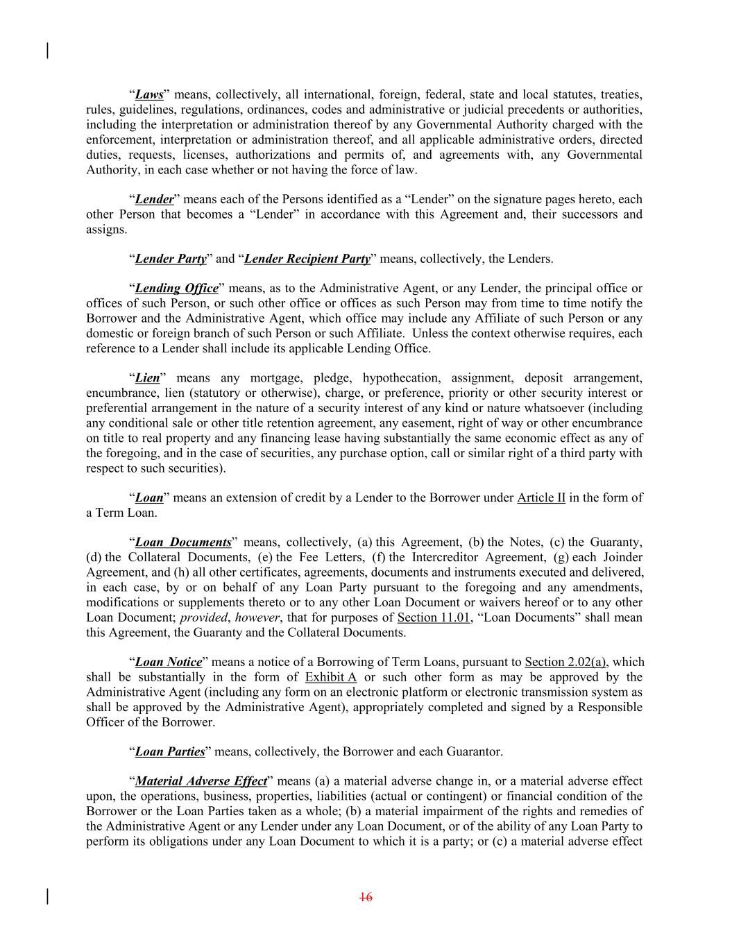 24 “Letter of Credit Application” means an application and agreement for the issuance or amendment of a Letter of Credit in the form from time to time in use by the applicable L/C Issuer. “Letter of Credit Expiration Date” means the day that not later than one hundred eighty (180) days after the Maturity Date then in effect for the Revolving Facility (or, if such day is not a Business Day, the next preceding Business Day). “Letter of Credit Fee” has the meaning specified in Section 2.03(l). “Letter of Credit Report” means a certificate substantially the form of Exhibit S or any other form approved by the Administrative Agent. “Letter of Credit Sublimit” means, as of any date of determination, an amount equal to the lesser of (a) $60,000,000 and (b) the Revolving Facility; provided that each L/C Issuer’s Letter of Credit Sublimit shall not exceed its L/C Commitment. The Letter of Credit Sublimit is part of, and not in addition to, the Revolving Facility. “Lien” means any mortgage, pledge, hypothecation, assignment, deposit arrangement, encumbrance, lien (statutory or otherwise), charge, or preference, priority or other security interest or preferential arrangement in the nature of a security interest of any kind or nature whatsoever (including any conditional sale or other title retention agreement, any easement, right of way or other encumbrance on title to real property and any financing lease having substantially the same economic effect as any of the foregoing, and in the case of securities, any purchase option, call or similar right of a third party with respect to such securities). “Loan” means an extension of credit by a Lender to the Borrower under Article II in the form of a Term Loan, a Revolving Loan or a Swingline Loan. “Loan Documents” means, collectively, (a) this Agreement, (b) the Notes, (c) the Guaranty, (d) the Collateral Documents, (e) the Fee Letter, (f) each Issuer Document, (g) each Joinder Agreement, (h) any agreement creating or perfecting rights in Cash Collateral pursuant to the provisions of Section 2.14, and (i) all other certificates, agreements, documents and instruments executed and delivered, in each case, by or on behalf of any Loan Party pursuant to the foregoing (but specifically excluding any Secured Hedge Agreement or any Secured Cash Management Agreement) and any amendments, modifications or supplements thereto or to any other Loan Document or waivers hereof or to any other Loan Document; provided, however, that for purposes of Section 11.01, “Loan Documents” shall mean this Agreement, the Guaranty and the Collateral Documents. “Loan Notice” means a notice of (a) a Borrowing, (b) a conversion of Loans from one Type to the other, or (c) a continuation of Term SOFR Loans or Alternative Currency Term Rate Loans, pursuant to Section 2.02(a), which shall be substantially in the form of Exhibit A or such other form as may be approved by the Administrative Agent (including any form on an electronic platform or electronic transmission system as shall be approved by the Administrative Agent), appropriately completed and signed by a Responsible Officer of the Borrower. “Loan Parties” means, collectively, the Borrower and each Guarantor. “Master Agreement” has the meaning set forth in the definition of “Swap Contract.” “Material Adverse Effect” means (a) a material adverse change in, or a material adverse effect upon, the operations, business, properties, liabilities (actual or contingent) or financial condition of the