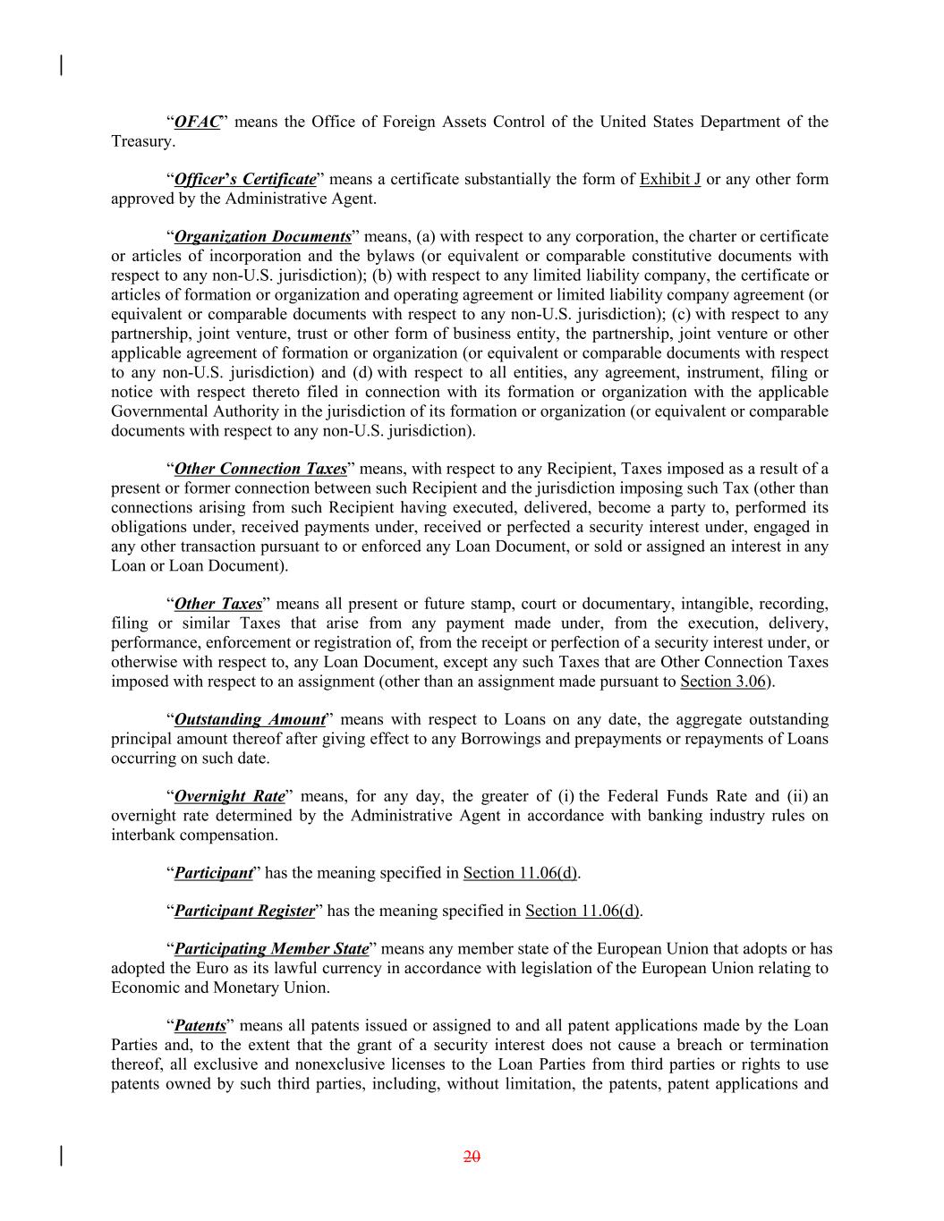29 “Outstanding Amount” means (a) with respect to Term Loans, Revolving Loans and Swingline Loans on any date, the Dollar Equivalent amount of the aggregate outstanding principal amount thereof after giving effect to any Borrowings and prepayments or repayments of Term Loans, Revolving Loans and Swingline Loans, as the case may be, occurring on such date; and (b) with respect to any L/C Obligations on any date, the Dollar Equivalent Amount of the aggregate outstanding amount of such L/C Obligations on such date after giving effect to any L/C Credit Extension occurring on such date and any other changes in the aggregate amount of the L/C Obligations as of such date, including as a result of any reimbursements by the Borrower of Unreimbursed Amounts. “Overnight Rate” means, for any day, (a) with respect to any amount denominated in Dollars, the greater of (i) the Federal Funds Rate and (ii) an overnight rate determined by the Administrative Agent, the L/C Issuers, or the Swingline Lender, as the case may be, in accordance with banking industry rules on interbank compensation, and (b) with respect to any amount denominated in an Alternative Currency, an overnight rate determined by the Administrative Agent or the L/C Issuers, as the case may be, in accordance with banking industry rules on interbank compensation. “Participant” has the meaning specified in Section 11.06(d). “Participant Register” has the meaning specified in Section 11.06(d). “Participating Member State” means any member state of the European Union that adopts or has adopted the Euro as its lawful currency in accordance with legislation of the European Union relating to Economic and Monetary Union. “Patents” means all patents issued or assigned to and all patent applications made by the Loan Parties and, to the extent that the grant of a security interest does not cause a breach or termination thereof, all exclusive and nonexclusive licenses to the Loan Parties from third parties or rights to use patents owned by such third parties, including, without limitation, the patents, patent applications and licenses listed on Schedule 5.08 hereto, along with any and all (a) inventions and improvements described and claimed therein, (b) reissues, divisions, continuations, extensions and continuations-in-part thereof, (c) income, royalties, damages, claims and payments now and hereafter due and/or payable under and with respect thereto, including, without limitation, damages and payments for past or future infringements thereof, (d) rights to sue for past, present and future infringements thereof, and (e) any other rights corresponding thereto throughout the world. “Patriot Act” has the meaning specified in Section 11.20. “PBGC” means the Pension Benefit Guaranty Corporation. “Pension Funding Rules” means the rules of the Code and ERISA regarding minimum funding standards with respect to Pension Plans and set forth in Sections 412, 430, 431, 432 and 436 of the Code and Sections 302, 303, 304 and 305 of ERISA. “Pension Plan” means any employee pension benefit plan (including a Multiple Employer Plan but excluding a Multiemployer Plan) that is maintained or is contributed to by the Borrower and any ERISA Affiliate or with respect to which the Borrower or any ERISA Affiliate has any liability and is either covered by Title IV of ERISA or is subject to the minimum funding standards under Section 412 of the Code. “Permitted Acquisition” has the meaning set forth in Section 7.04(d). “Permitted Investments” means: