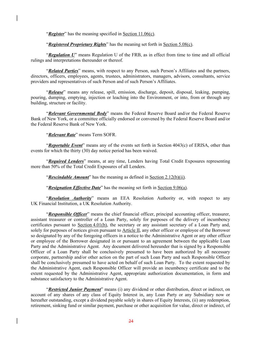 32 “Real Property Asset” means, at any time of determination, any and all real property owned or leased by the Loan Parties. “Recipient” means the Administrative Agent, any Lender, any L/C Issuer or any other recipient of any payment to be made by or on account of any obligation of any Loan Party hereunder. “Register” has the meaning specified in Section 11.06(c). “Registered Proprietary Rights” has the meaning assigned to such term in Section 5.08(c). “Regulation U” means Regulation U of the FRB, as in effect from time to time and all official rulings and interpretations thereunder or thereof. “Reimbursement Obligation” has the meaning assigned to such term in Section 2.03(f). “Related Parties” means, with respect to any Person, such Person’s Affiliates and the partners, directors, officers, employees, agents, trustees, administrators, managers, advisors, consultants, service providers and representatives of such Person and of such Person’s Affiliates. “Release” means any release, spill, emission, discharge, deposit, disposal, leaking, pumping, pouring, dumping, emptying, injection or leaching into the Environment, or into, from or through any building, structure or facility. “Relevant Governmental Body” means (a) with respect to Loans denominated in Dollars, the Federal Reserve Board and/or the Federal Reserve Bank of New York, or a committee officially endorsed or convened by the Federal Reserve Board and/or the Federal Reserve Bank of New York, (b) with respect to Loans denominated in Sterling, the Bank of England, or a committee officially endorsed or convened by the Bank of England or, in each case, any successor thereto, (c) with respect to Loans denominated in Euros, the European Central Bank, or a committee officially endorsed or convened by the European Central Bank or, in each case, any successor thereto, and (d) with respect to Loans denominated in any other Agreed Currency, (i) the central bank for the currency in which such Loan is denominated or any central bank or other supervisor which is responsible for supervising either (x) such Successor Rate or (y) the administrator of such Successor Rate or (ii) any working group or committee officially endorsed or convened by (w) the central bank for the currency in which such Successor Rate is denominated, (x) any central bank or other supervisor that is responsible for supervising either (A) such Successor Rate or (B) the administrator of such Successor Rate, (y) a group of those central banks or other supervisors or (z) the Financial Stability Board or any part thereof. “Relevant Rate” means with respect to any Credit Extension denominated in (a) Dollars, Term SOFR, (b) Sterling, SONIA, (c) Euros, EURIBOR, and (d) Canadian Dollars, the Term CORRA Rate, as applicable “Removal Effective Date” has the meaning specified in Section 9.06(b). “Reportable Event” means any of the events set forth in Section 4043(c) of ERISA, other than events for which the thirty (30) day notice period has been waived. “Request for Credit Extension” means (a) with respect to a Borrowing, conversion or continuation of Term Loans or Revolving Loans, a Loan Notice, (b) with respect to an L/C Credit Extension, a Letter of Credit Application, and (c) with respect to a Swingline Loan, a Swingline Loan Notice.