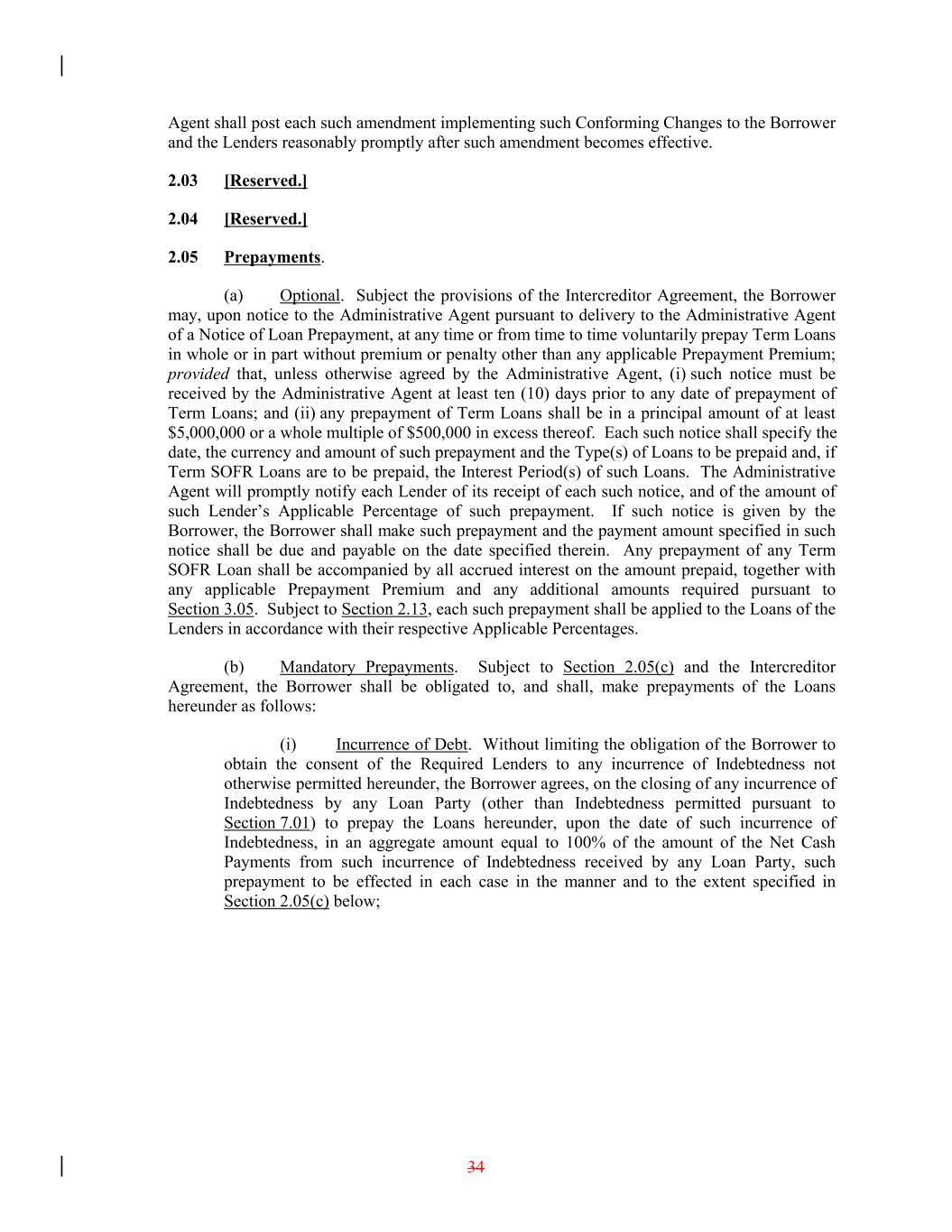 61 amount of such prepayment and the Type(s) of Loans to be prepaid and, if Term SOFR Loans or Alternative Currency Loans are to be prepaid, the Interest Period(s) of such Loans. The Administrative Agent will promptly notify each Lender of its receipt of each such notice, and of the amount of such Lender’s Applicable Percentage of such prepayment. If such notice is given by the Borrower, the Borrower shall make such prepayment and the payment amount specified in such notice shall be due and payable on the date specified therein. Any prepayment of any Term SOFR Loan or Alternative Currency Term Rate Loan shall be accompanied by all accrued interest on the amount prepaid, together with any additional amounts required pursuant to Section 3.05. Each prepayment of the outstanding Term Loans pursuant to this Section 2.05(a) shall be applied to the principal repayment installments thereof in inverse order of maturity. Subject to Section 2.15, each such prepayment shall be applied to the Loans of the Lenders in accordance with their respective Applicable Percentages in respect of each of the relevant Facilities. (ii) The Borrower may, upon notice to the Swingline Lender pursuant to delivery to the Swingline Lender of a Notice of Loan Prepayment (with a copy to the Administrative Agent), at any time or from time to time, voluntarily prepay Swingline Loans in whole or in part without premium or penalty; provided that, unless otherwise agreed by the Swingline Lender, (A) such notice must be received by the Swingline Lender and the Administrative Agent not later than 1:00 p.m. on the date of the prepayment, and (B) any such prepayment shall be in a minimum principal amount of $100,000 or a whole multiple of $100,000 in excess hereof (or, if less, the entire principal thereof then outstanding). Each such notice shall specify the date and amount of such prepayment. If such notice is given by the Borrower, the Borrower shall make such prepayment and the payment amount specified in such notice shall be due and payable on the date specified therein. Any prepayment of principal shall be accompanied by all accrued interest on the amount prepaid, together with any additional amounts required pursuant to Section 3.05. (b) Mandatory Prepayments. The Borrower shall be obligated to, and shall, make prepayments of the Loans hereunder as follows: (i) Incurrence of Debt. Without limiting the obligation of the Borrower to obtain the consent of the Required Lenders to any incurrence of Indebtedness not otherwise permitted hereunder, the Borrower agrees, on the closing of any incurrence of Indebtedness by any Loan Party (other than Indebtedness permitted pursuant to Section 7.01) to prepay the Loans hereunder (and provide Cash Collateral for L/C Obligations, if applicable, as specified in Section 2.05(c) and Section 2.14), upon the date of such incurrence of Indebtedness, in an aggregate amount equal to 100% of the amount of the Net Cash Payments from such incurrence of Indebtedness received by any Loan Party, such prepayment to be effected in each case in the manner and to the extent specified in Section 2.05(c) below. (ii) Sale of Assets. Without limiting the obligation of the Borrower to obtain the consent of the Required Lenders to any Disposition not otherwise permitted hereunder, the Borrower agrees, on or prior to the occurrence of any Disposition by any Loan Party, the Net Cash Payments from which would exceed $10,000,000 individually or $20,000,000 in the aggregate after the Closing Date (as used in this section, the “Max NCPs”) to deliver to the Administrative Agent a statement certified by a Responsible Officer of the Borrower, in form and detail reasonably satisfactory to the Administrative Agent, of the estimated amount of the Net Cash Payments of such Disposition that will (on the date of such