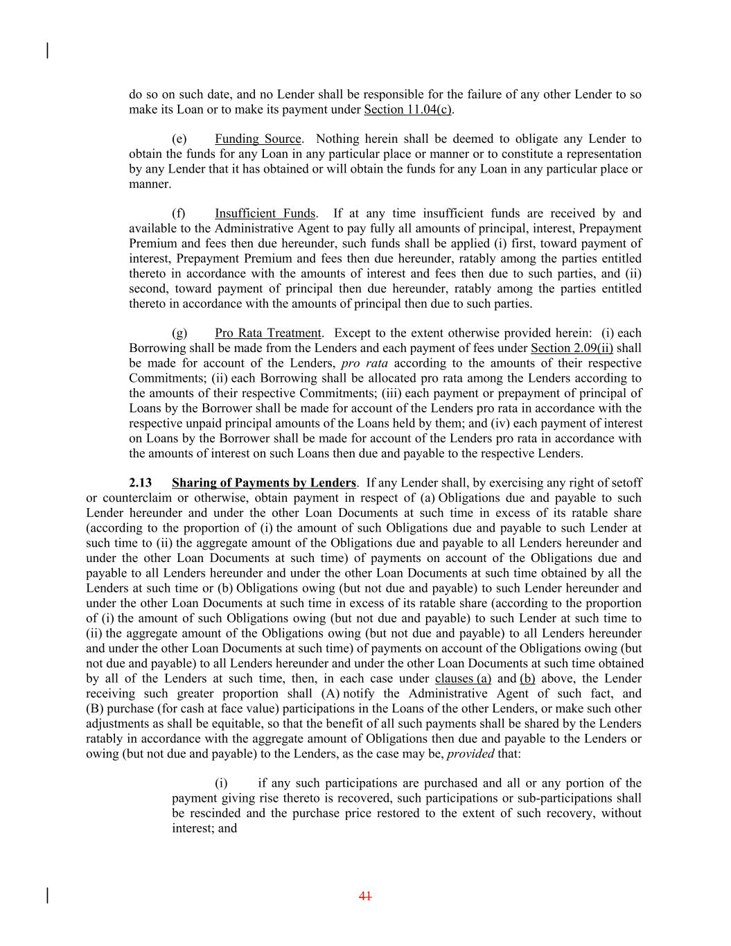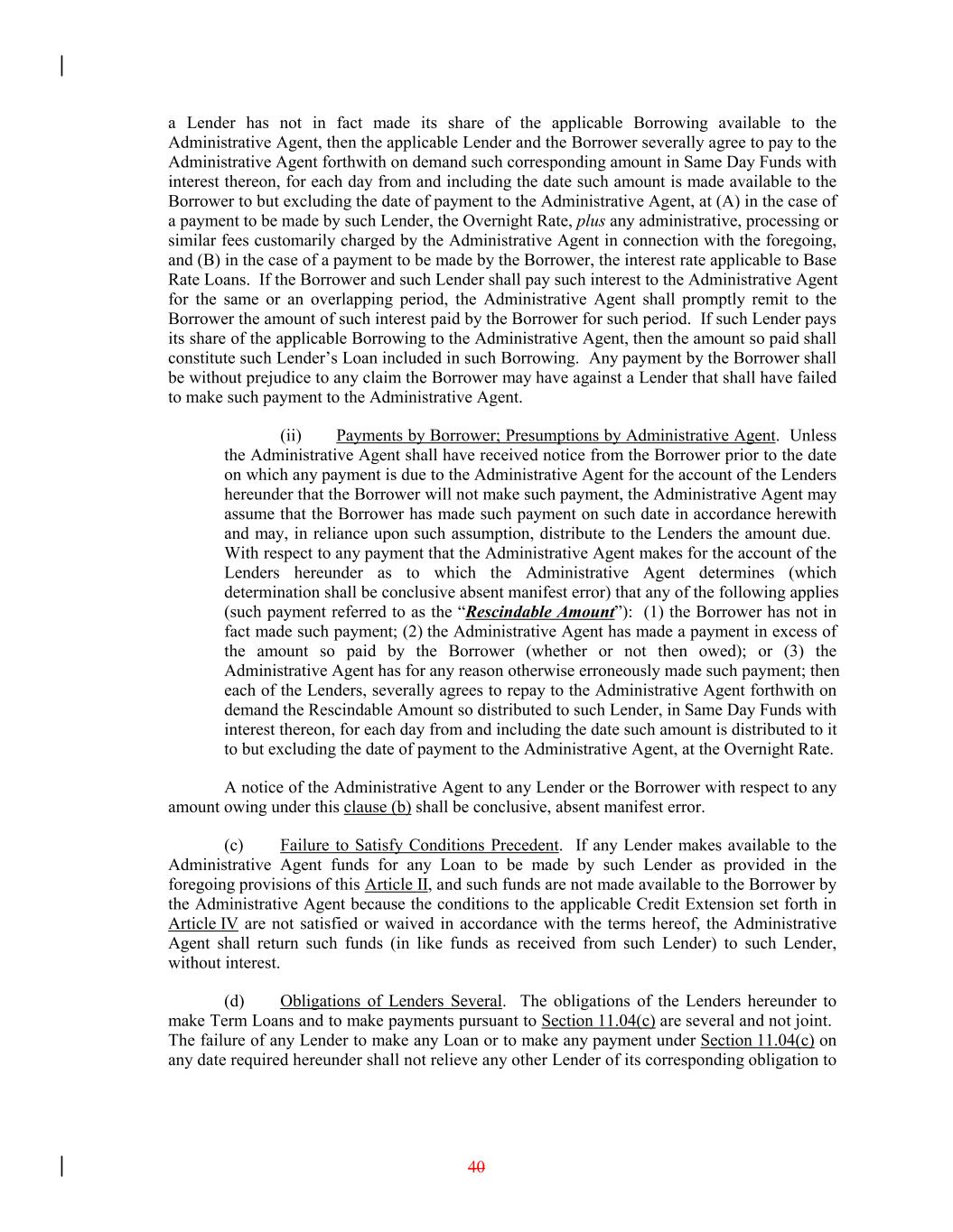 70 repay to the Administrative Agent forthwith on demand the Rescindable Amount so distributed to such Lender or such L/C Issuer, in Same Day Funds with interest thereon, for each day from and including the date such amount is distributed to it to but excluding the date of payment to the Administrative Agent, at the Overnight Rate. A notice of the Administrative Agent to any Lender or the Borrower with respect to any amount owing under this clause (b) shall be conclusive, absent manifest error. (c) Failure to Satisfy Conditions Precedent. If any Lender makes available to the Administrative Agent funds for any Loan to be made by such Lender as provided in the foregoing provisions of this Article II, and such funds are not made available to the Borrower by the Administrative Agent because the conditions to the applicable Credit Extension set forth in Article IV are not satisfied or waived in accordance with the terms hereof, the Administrative Agent shall return such funds (in like funds as received from such Lender) to such Lender, without interest. (d) Obligations of Lenders Several. The obligations of the Lenders hereunder to make Term Loans and Revolving Loans, to fund participations in Letters of Credit and Swingline Loans and to make payments pursuant to Section 11.04(c) are several and not joint. The failure of any Lender to make any Loan, to fund any such participation or to make any payment under Section 11.04(c) on any date required hereunder shall not relieve any other Lender of its corresponding obligation to do so on such date, and no Lender shall be responsible for the failure of any other Lender to so make its Loan, to purchase its participation or to make its payment under Section 11.04(c). (e) Funding Source. Nothing herein shall be deemed to obligate any Lender to obtain the funds for any Loan in any particular place or manner or to constitute a representation by any Lender that it has obtained or will obtain the funds for any Loan in any particular place or manner. (f) Insufficient Funds. If at any time insufficient funds are received by and available to the Administrative Agent to pay fully all amounts of principal, L/C Borrowings, interest and fees then due hereunder, such funds shall be applied (i) first, toward payment of interest and fees then due hereunder, ratably among the parties entitled thereto in accordance with the amounts of interest and fees then due to such parties, and (ii) second, toward payment of principal and L/C Borrowings then due hereunder, ratably among the parties entitled thereto in accordance with the amounts of principal and L/C Borrowings then due to such parties. (g) Pro Rata Treatment. Except to the extent otherwise provided herein: (i) each Borrowing (other than Swingline Borrowings) shall be made from the Appropriate Lenders, each payment of fees under Section 2.09 and clauses (l), (m), (o) and (p) of Section 2.03 shall be made for account of the Appropriate Lenders, and each termination or reduction of the amount of the Commitments shall be applied to the respective Commitments of the Lenders, pro rata according to the amounts of their respective Commitments; (ii) each Borrowing shall be allocated pro rata among the Lenders according to the amounts of their respective Commitments (in the case of the making of Revolving Loans) or their respective Loans that are to be included in such Borrowing (in the case of conversions and continuations of Loans); (iii) each payment or prepayment of principal of Loans by the Borrower shall be made for account of the Appropriate Lenders pro rata in accordance with the respective unpaid principal amounts of the Loans held by them; and (iv) each payment of interest on Loans by the Borrower shall be made for account of the Appropriate Lenders pro rata in accordance with the amounts of interest on such Loans then due and payable to the respective Appropriate Lenders.