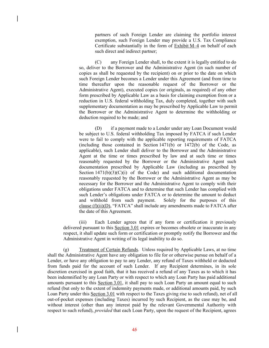 79 M–3, IRS Form W–9, and/or other certification documents from each beneficial owner, as applicable; provided that if the Foreign Lender is a partnership and one or more direct or indirect partners of such Foreign Lender are claiming the portfolio interest exemption, such Foreign Lender may provide a U.S. Tax Compliance Certificate substantially in the form of Exhibit M–4 on behalf of each such direct and indirect partner; (C) any Foreign Lender shall, to the extent it is legally entitled to do so, deliver to the Borrower and the Administrative Agent (in such number of copies as shall be requested by the recipient) on or prior to the date on which such Foreign Lender becomes a Lender under this Agreement (and from time to time thereafter upon the reasonable request of the Borrower or the Administrative Agent), executed copies (or originals, as required) of any other form prescribed by Applicable Law as a basis for claiming exemption from or a reduction in U.S. federal withholding Tax, duly completed, together with such supplementary documentation as may be prescribed by Applicable Law to permit the Borrower or the Administrative Agent to determine the withholding or deduction required to be made; and (D) if a payment made to a Lender under any Loan Document would be subject to U.S. federal withholding Tax imposed by FATCA if such Lender were to fail to comply with the applicable reporting requirements of FATCA (including those contained in Section 1471(b) or 1472(b) of the Code, as applicable), such Lender shall deliver to the Borrower and the Administrative Agent at the time or times prescribed by law and at such time or times reasonably requested by the Borrower or the Administrative Agent such documentation prescribed by Applicable Law (including as prescribed by Section 1471(b)(3)(C)(i) of the Code) and such additional documentation reasonably requested by the Borrower or the Administrative Agent as may be necessary for the Borrower and the Administrative Agent to comply with their obligations under FATCA and to determine that such Lender has complied with such Lender’s obligations under FATCA or to determine the amount to deduct and withhold from such payment. Solely for the purposes of this clause (f)(ii)(D), “FATCA” shall include any amendments made to FATCA after the date of this Agreement. (iii) Each Lender agrees that if any form or certification it previously delivered pursuant to this Section 3.01 expires or becomes obsolete or inaccurate in any respect, it shall update such form or certification or promptly notify the Borrower and the Administrative Agent in writing of its legal inability to do so. (g) Treatment of Certain Refunds. Unless required by Applicable Laws, at no time shall the Administrative Agent have any obligation to file for or otherwise pursue on behalf of a Lender, or have any obligation to pay to any Lender, any refund of Taxes withheld or deducted from funds paid for the account of such Lender. If any Recipient determines, in its sole discretion exercised in good faith, that it has received a refund of any Taxes as to which it has been indemnified by any Loan Party or with respect to which any Loan Party has paid additional amounts pursuant to this Section 3.01, it shall pay to such Loan Party an amount equal to such refund (but only to the extent of indemnity payments made, or additional amounts paid, by such Loan Party under this Section 3.01 with respect to the Taxes giving rise to such refund), net of all out-of-pocket expenses (including Taxes) incurred by such Recipient, as the case may be, and without interest (other than any interest paid by the relevant Governmental Authority with respect to such refund),
