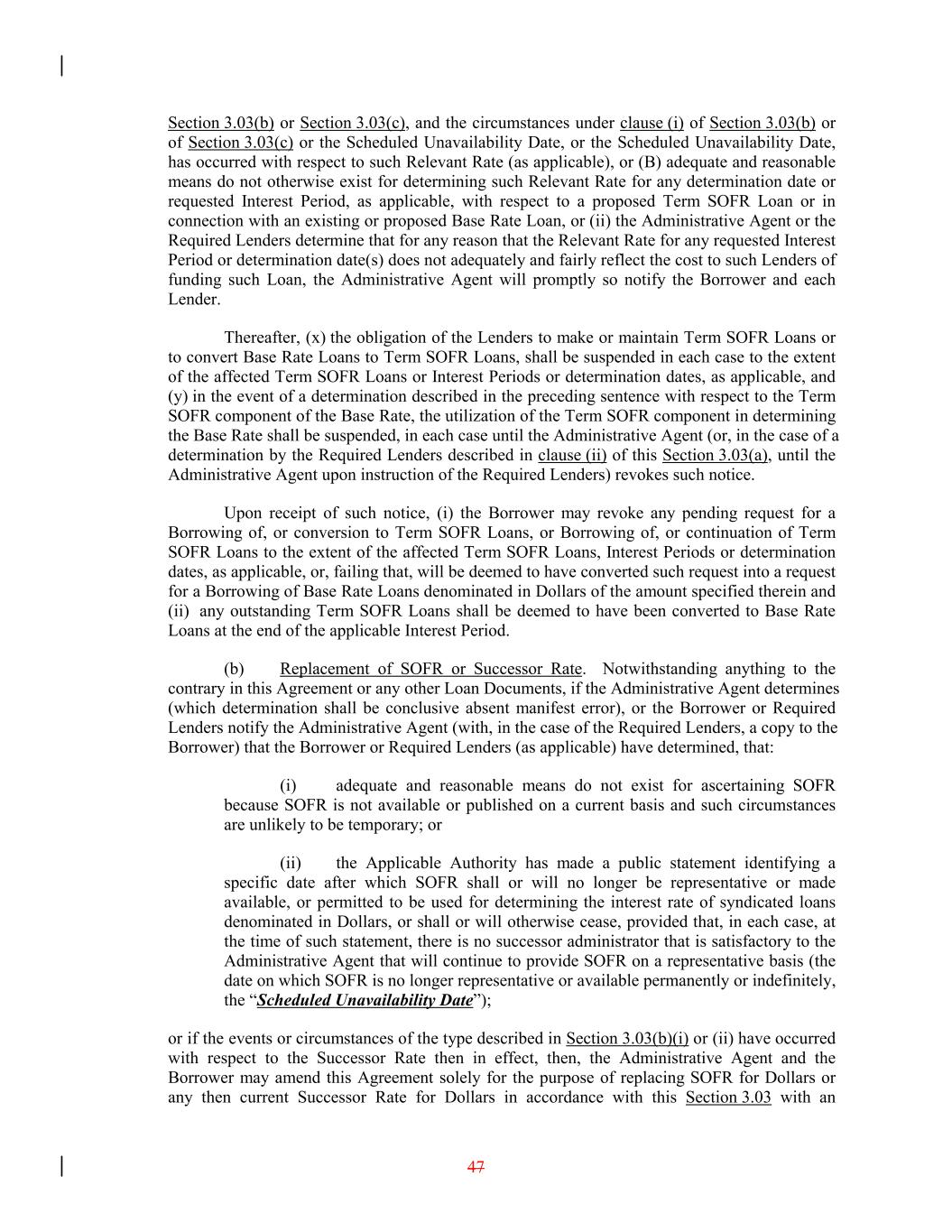 81 3.03 Inability to Determine Rates. (a) If in connection with any request for a Term SOFR Loan or an Alternative Currency Loan or a conversion of Base Rate Loans to Term SOFR Loans or an Alternative currency Loan or a continuation of any of such Loans, as applicable, (i) the Administrative Agent determines (which determination shall be conclusive absent manifest error) that (A) no Successor Rate for the Relevant Rate for the applicable Agreed Currency has been determined in accordance with Section 3.03(b) or Section 3.03(c), and the circumstances under clause (i) of Section 3.03(b) or of Section 3.03(c) or the Scheduled Unavailability Date, or the SOFR Scheduled Unavailability Date, has occurred with respect to such Relevant Rate (as applicable), or (B) adequate and reasonable means do not otherwise exist for determining such Relevant Rate for the applicable Agreed Currency for any determination date or requested Interest Period, as applicable, with respect to a proposed Term SOFR Loan or Alternative Currency Loan or in connection with an existing or proposed Base Rate Loan, or (ii) the Administrative Agent or the Required Lenders determine that for any reason that the Relevant Rate with respect to a proposed Loan denominated in an Agreed Currency for any requested Interest Period or determination date(s) does not adequately and fairly reflect the cost to such Lenders of funding such Loan, the Administrative Agent will promptly so notify the Borrower and each Lender. Thereafter, (x) the obligation of the Lenders to make or maintain Loans in the affected currencies, as applicable, or to convert Base Rate Loans to Term SOFR Loans, shall be suspended in each case to the extent of the affected Term SOFR Loans or Alternative Currency Loans or Interest Periods or determination dates, as applicable, and (y) in the event of a determination described in the preceding sentence with respect to the Term SOFR component of the Base Rate, the utilization of the Term SOFR component in determining the Base Rate shall be suspended, in each case until the Administrative Agent (or, in the case of a determination by the Required Lenders described in clause (ii) of this Section 3.03(a), until the Administrative Agent upon instruction of the Required Lenders) revokes such notice. Upon receipt of such notice, (i) the Borrower may revoke any pending request for a Borrowing of, or conversion to Term SOFR Loans, or Borrowing of, or continuation of Term SOFR Loans or Alternative Currency Loans to the extent of the affected Term SOFR Loans, Alternative Currency Loans, Interest Periods or determination dates, as applicable, or, failing that, will be deemed to have converted such request into a request for a Borrowing of Base Rate Loans denominated in Dollars in the Dollar Equivalent of the amount specified therein and (ii) (A) any outstanding Term SOFR Loans shall be deemed to have been converted to Base Rate Loans immediately and (B) any outstanding affected Alternative Currency Loans, at the Borrower’s election, shall either (1) be converted into a Borrowing of Base Rate Loans denominated in Dollars in the Dollar Amount of the amount of such outstanding Alternative Currency Loan immediately, in the case of an Alternative Currency Daily Rate Loan or at the end of the applicable Interest Period, in the case of a Term SOFR Loan or Alternative Currency Term Rate Loan or (2) be prepaid in full immediately, in the case of an Alternative Currency Daily Rate Loan, or at the end of the applicable Interest Period, in the case of a Term SOFR Loan or Alternative Currency Term Rate Loan; provided that if no election is made by the Borrower (x) in the case of an Alternative Currency Daily Rate Loan, by the date that is three Business Days after receipt by the Borrower of such notice or (y) in the case of a Term SOFR Loan or Alternative Currency Term Rate Loan, by the last day of the current Interest Period for the applicable Term SOFR Loan or Alternative Currency Term Rate Loan, the Borrower shall be deemed to have elected clause (1) above. (b) Replacement of SOFR or SOFR Successor Rate. Notwithstanding anything to the contrary in this Agreement or any other Loan Documents, if the Administrative Agent determines