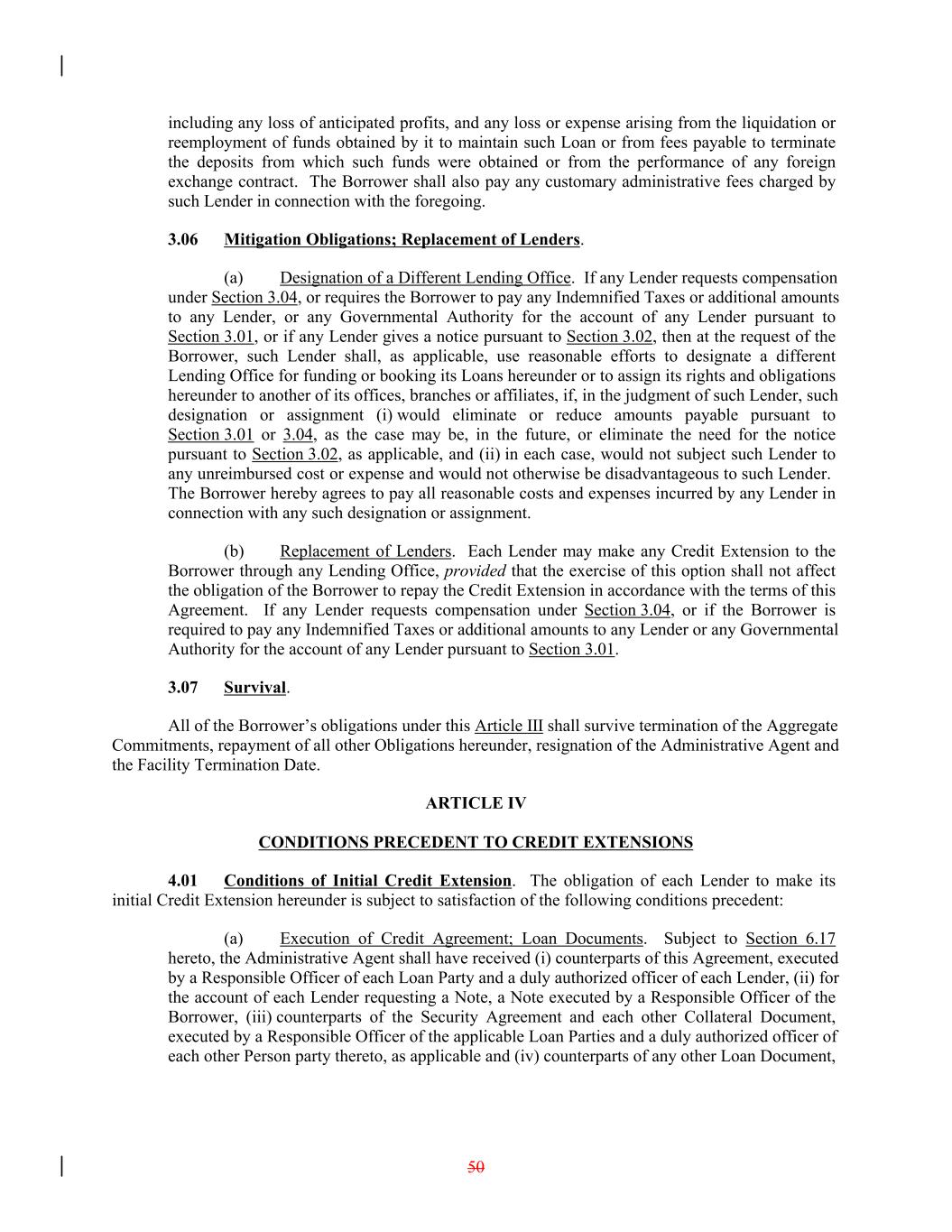 86 reasonable efforts to designate a different Lending Office for funding or booking its Loans hereunder or to assign its rights and obligations hereunder to another of its offices, branches or affiliates, if, in the judgment of such Lender or such L/C Issuer, such designation or assignment (i) would eliminate or reduce amounts payable pursuant to Section 3.01 or 3.04, as the case may be, in the future, or eliminate the need for the notice pursuant to Section 3.02, as applicable, and (ii) in each case, would not subject such Lender or such L/C Issuer, as the case may be, to any unreimbursed cost or expense and would not otherwise be disadvantageous to such Lender or such L/C Issuer, as the case may be. The Borrower hereby agrees to pay all reasonable costs and expenses incurred by any Lender or any L/C Issuer in connection with any such designation or assignment. (b) Replacement of Lenders. Each Lender may make any Credit Extension to the Borrower through any Lending Office, provided that the exercise of this option shall not affect the obligation of the Borrower to repay the Credit Extension in accordance with the terms of this Agreement. If any Lender requests compensation under Section 3.04, or if the Borrower is required to pay any Indemnified Taxes or additional amounts to any Lender or any Governmental Authority for the account of any Lender pursuant to Section 3.01 and, in each case, such Lender has declined or is unable to designate a different lending office in accordance with Section 3.06(a), the Borrower may replace such Lender in accordance with Section 11.13. 3.07 Survival. All of the Borrower’s obligations under this Article III shall survive termination of the Aggregate Commitments, repayment of all other Obligations hereunder, resignation of the Administrative Agent and the Facility Termination Date. ARTICLE IV CONDITIONS PRECEDENT TO CREDIT EXTENSIONS 4.01 Conditions of Initial Credit Extension. The obligation of any L/C Issuer and each Lender to make its initial Credit Extension hereunder is subject to satisfaction of the following conditions precedent: (a) Execution of Credit Agreement; Loan Documents. The Administrative Agent shall have received (i) counterparts of this Agreement, executed by a Responsible Officer of each Loan Party and a duly authorized officer of each Lender, (ii) for the account of each Lender requesting a Note, a Note executed by a Responsible Officer of the Borrower, (iii) counterparts of the Security Agreement and each other Collateral Document, executed by a Responsible Officer of the applicable Loan Parties and a duly authorized officer of each other Person party thereto, as applicable, (iv) counterparts of an amendment to the Junior Credit Agreement making conforming changes to the Junior Credit Agreement and the other Junior Loan Documents duly executed by the Loan Parties and the other parties thereto in form and substance satisfactory to the Administrative Agent, and (v) counterparts of any other Loan Document, executed by a Responsible Officer of the applicable Loan Party and a duly authorized officer of each other Person party thereto. (b) Officer’s Certificate; Evidence of Existence and Good Standing. The Administrative Agent shall have received an Officer’s Certificate dated the Closing Date, certifying as to the Organization Documents of each Loan Party (which, to the extent filed with a Governmental Authority with respect to the Borrower, shall be certified as of a recent date by such