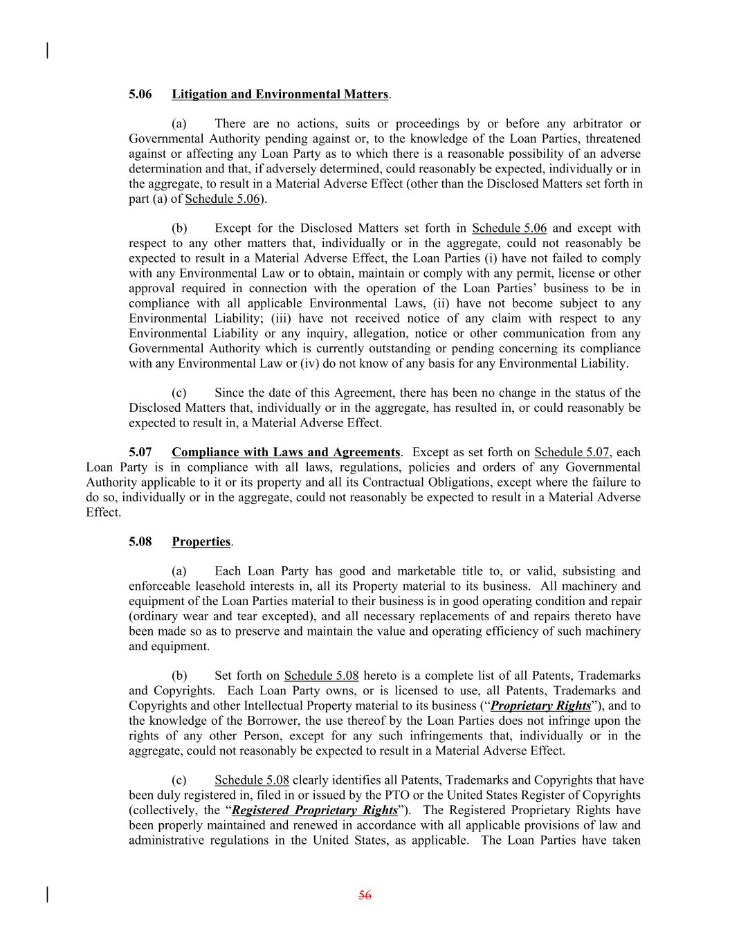 92 5.06 Litigation and Environmental Matters. (a) There are no actions, suits or proceedings by or before any arbitrator or Governmental Authority pending against or, to the knowledge of the Loan Parties, threatened against or affecting any Loan Party as to which there is a reasonable possibility of an adverse determination and that, if adversely determined, could reasonably be expected, individually or in the aggregate, to result in a Material Adverse Effect (other than the Disclosed Matters set forth in part (a) of Schedule 5.06). (b) Except for the Disclosed Matters set forth in Schedule 5.06 and except with respect to any other matters that, individually or in the aggregate, could not reasonably be expected to result in a Material Adverse Effect, the Loan Parties (i) have not failed to comply with any Environmental Law or to obtain, maintain or comply with any permit, license or other approval required in connection with the operation of the Loan Parties’ business to be in compliance with all applicable Environmental Laws, (ii) have not become subject to any Environmental Liability; (iii) have not received notice of any claim with respect to any Environmental Liability or any inquiry, allegation, notice or other communication from any Governmental Authority which is currently outstanding or pending concerning its compliance with any Environmental Law or (iv) do not know of any basis for any Environmental Liability. (c) Since the date of this Agreement, there has been no change in the status of the Disclosed Matters that, individually or in the aggregate, has resulted in, or could reasonably be expected to result in, a Material Adverse Effect. 5.07 Compliance with Laws and Agreements. Except as set forth on Schedule 5.07, each Loan Party is in compliance with all laws, regulations, policies and orders of any Governmental Authority applicable to it or its property and all its Contractual Obligations, except where the failure to do so, individually or in the aggregate, could not reasonably be expected to result in a Material Adverse Effect. 5.08 Properties. (a) Each Loan Party has good and marketable title to, or valid, subsisting and enforceable leasehold interests in, all its Property material to its business. All machinery and equipment of the Loan Parties material to their business is in good operating condition and repair (ordinary wear and tear excepted), and all necessary replacements of and repairs thereto have been made so as to preserve and maintain the value and operating efficiency of such machinery and equipment. (b) Set forth on Schedule 5.08 hereto is a complete list of all Patents, Trademarks and Copyrights. Each Loan Party owns, or is licensed to use, all Patents, Trademarks and Copyrights and other intellectual property material to its business (“Proprietary Rights”), and to the knowledge of the Borrower, the use thereof by the Loan Parties does not infringe upon the rights of any other Person, except for any such infringements that, individually or in the aggregate, could not reasonably be expected to result in a Material Adverse Effect. (c) Schedule 5.08 clearly identifies all Patents, Trademarks and Copyrights that have been duly registered in, filed in or issued by the PTO or the United States Register of Copyrights (collectively, the “Registered Proprietary Rights”). The Registered Proprietary Rights have been properly maintained and renewed in accordance with all applicable provisions of law and administrative regulations in the United States, as applicable. The Loan Parties have taken commercially reasonable steps to protect the Registered Proprietary Rights material to their