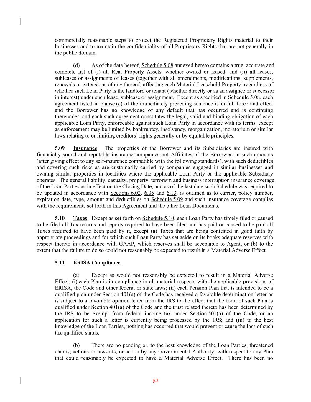 93 businesses and to maintain the confidentiality of all Proprietary Rights that are not generally in the public domain. (d) As of the date hereof, Schedule 5.08 annexed hereto contains a true, accurate and complete list of (i) all Real Property Assets, whether owned or leased, and (ii) all leases, subleases or assignments of leases (together with all amendments, modifications, supplements, renewals or extensions of any thereof) affecting each Material Leasehold Property, regardless of whether such Loan Party is the landlord or tenant (whether directly or as an assignee or successor in interest) under such lease, sublease or assignment. Except as specified in Schedule 5.08, each agreement listed in clause (c) of the immediately preceding sentence is in full force and effect and the Borrower has no knowledge of any default that has occurred and is continuing thereunder, and each such agreement constitutes the legal, valid and binding obligation of each applicable Loan Party, enforceable against such Loan Party in accordance with its terms, except as enforcement may be limited by bankruptcy, insolvency, reorganization, moratorium or similar laws relating to or limiting creditors’ rights generally or by equitable principles. 5.09 Insurance. The properties of the Borrower and its Subsidiaries are insured with financially sound and reputable insurance companies not Affiliates of the Borrower, in such amounts (after giving effect to any self-insurance compatible with the following standards), with such deductibles and covering such risks as are customarily carried by companies engaged in similar businesses and owning similar properties in localities where the applicable Loan Party or the applicable Subsidiary operates. The general liability, casualty, property, terrorism and business interruption insurance coverage of the Loan Parties as in effect on the Closing Date, and as of the last date such Schedule was required to be updated in accordance with Sections 6.02, 6.05 and 6.13, is outlined as to carrier, policy number, expiration date, type, amount and deductibles on Schedule 5.09 and such insurance coverage complies with the requirements set forth in this Agreement and the other Loan Documents. 5.10 Taxes. Except as set forth on Schedule 5.10, each Loan Party has timely filed or caused to be filed all Tax returns and reports required to have been filed and has paid or caused to be paid all Taxes required to have been paid by it, except (a) Taxes that are being contested in good faith by appropriate proceedings and for which such Loan Party has set aside on its books adequate reserves with respect thereto in accordance with GAAP, which reserves shall be acceptable to Agent, or (b) to the extent that the failure to do so could not reasonably be expected to result in a Material Adverse Effect. 5.11 ERISA Compliance. (a) Except as would not reasonably be expected to result in a Material Adverse Effect, (i) each Plan is in compliance in all material respects with the applicable provisions of ERISA, the Code and other federal or state laws; (ii) each Pension Plan that is intended to be a qualified plan under Section 401(a) of the Code has received a favorable determination letter or is subject to a favorable opinion letter from the IRS to the effect that the form of such Plan is qualified under Section 401(a) of the Code and the trust related thereto has been determined by the IRS to be exempt from federal income tax under Section 501(a) of the Code, or an application for such a letter is currently being processed by the IRS; and (iii) to the best knowledge of the Loan Parties, nothing has occurred that would prevent or cause the loss of such tax-qualified status. (b) There are no pending or, to the best knowledge of the Loan Parties, threatened claims, actions or lawsuits, or action by any Governmental Authority, with respect to any Plan that could reasonably be expected to have a Material Adverse Effect. There has been no prohibited transaction or violation of the fiduciary responsibility rules with respect to any Plan that has resulted or could reasonably be expected to result in a Material Adverse Effect.