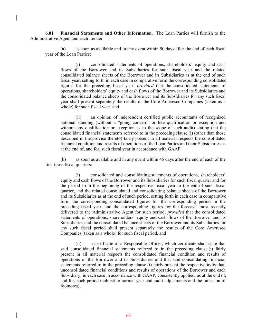 99 (i) consolidated statements of operations, shareholders’ equity and cash flows of the Borrower and its Subsidiaries for such fiscal year and the related consolidated balance sheets of the Borrower and its Subsidiaries as at the end of such fiscal year, setting forth in each case in comparative form the corresponding consolidated figures for the preceding fiscal year; provided that the consolidated statements of operations, shareholders’ equity and cash flows of the Borrower and its Subsidiaries and the consolidated balance sheets of the Borrower and its Subsidiaries for any such fiscal year shall present separately the results of the Core Ameresco Companies (taken as a whole) for such fiscal year, and (ii) an opinion of independent certified public accountants of recognized national standing (without a “going concern” or like qualification or exception and without any qualification or exception as to the scope of such audit) stating that the consolidated financial statements referred to in the preceding clause (i) (other than those described in the proviso thereto) fairly present in all material respects the consolidated financial condition and results of operations of the Loan Parties and their Subsidiaries as at the end of, and for, such fiscal year in accordance with GAAP. (b) as soon as available and in any event within 45 days after the end of each of the first three fiscal quarters: (i) consolidated and consolidating statements of operations, shareholders’ equity and cash flows of the Borrower and its Subsidiaries for such fiscal quarter and for the period from the beginning of the respective fiscal year to the end of such fiscal quarter, and the related consolidated and consolidating balance sheets of the Borrower and its Subsidiaries as at the end of such period, setting forth in each case in comparative form the corresponding consolidated figures for the corresponding period in the preceding fiscal year, and the corresponding figures for the forecasts most recently delivered to the Administrative Agent for such period; provided that the consolidated statements of operations, shareholders’ equity and cash flows of the Borrower and its Subsidiaries and the consolidated balance sheets of the Borrower and its Subsidiaries for any such fiscal period shall present separately the results of the Core Ameresco Companies (taken as a whole) for such fiscal period, and (ii) a certificate of a Responsible Officer, which certificate shall state that said consolidated financial statements referred to in the preceding clause (i) fairly present in all material respects the consolidated financial condition and results of operations of the Borrower and its Subsidiaries and that said consolidating financial statements referred to in the preceding clause (i) fairly present the respective individual unconsolidated financial conditions and results of operations of the Borrower and each Subsidiary, in each case in accordance with GAAP, consistently applied, as at the end of, and for, such period (subject to normal year-end audit adjustments and the omission of footnotes); (c) as soon as available and in any event within (i) 45 days after the end of each of the first three fiscal quarters a Compliance Certificate duly executed by a Responsible Officer with respect to the quarterly financial statements delivered pursuant to Section 6.01(b) above, and (ii) within 90 days after the end of each fiscal year, a Compliance Certificate duly executed by a Responsible Officer with respect to the annual financial statements delivered pursuant to Section 6.01(a) above, together with, in the case of each of clauses (i) and (ii) of this subsection (c), such supporting financial information with respect to the Core Ameresco Companies as shall be reasonably acceptable to the Administrative Agent;