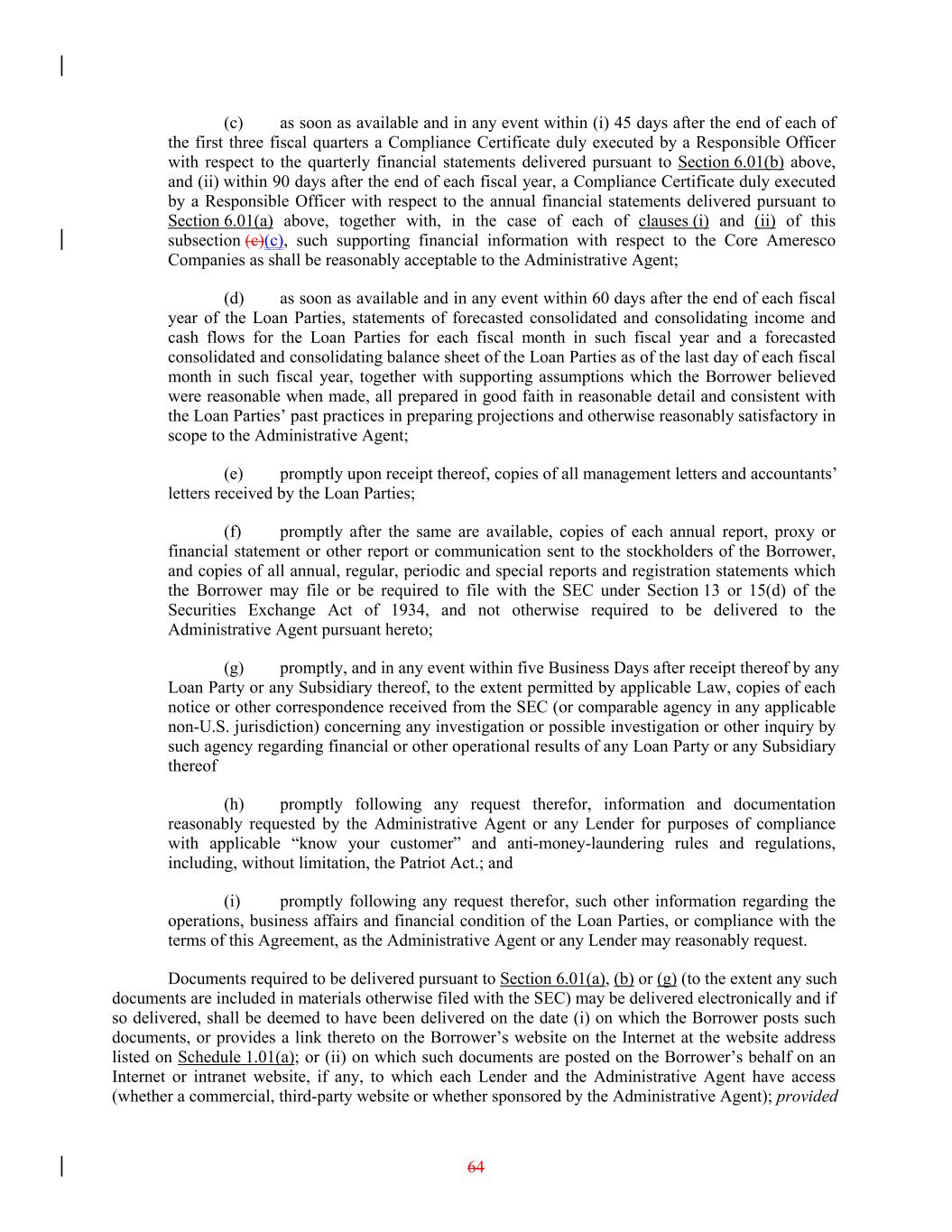 100 (d) as soon as available and in any event within 60 days after the end of each fiscal year of the Loan Parties, statements of forecasted consolidated and consolidating income and cash flows for the Loan Parties for each fiscal month in such fiscal year and a forecasted consolidated and consolidating balance sheet of the Loan Parties as of the last day of each fiscal month in such fiscal year, together with supporting assumptions which the Borrower believed were reasonable when made, all prepared in good faith in reasonable detail and consistent with the Loan Parties’ past practices in preparing projections and otherwise reasonably satisfactory in scope to the Administrative Agent; (e) promptly upon receipt thereof, copies of all management letters and accountants’ letters received by the Loan Parties; (f) promptly after the same are available, copies of each annual report, proxy or financial statement or other report or communication sent to the stockholders of the Borrower, and copies of all annual, regular, periodic and special reports and registration statements which the Borrower may file or be required to file with the SEC under Section 13 or 15(d) of the Securities Exchange Act of 1934, and not otherwise required to be delivered to the Administrative Agent pursuant hereto; (g) promptly, and in any event within five Business Days after receipt thereof by any Loan Party or any Subsidiary thereof, to the extent permitted by applicable Law, copies of each notice or other correspondence received from the SEC (or comparable agency in any applicable non-U.S. jurisdiction) concerning any investigation or possible investigation or other inquiry by such agency regarding financial or other operational results of any Loan Party or any Subsidiary thereof (h) promptly following any request therefor, information and documentation reasonably requested by the Administrative Agent or any Lender for purposes of compliance with applicable “know your customer” and anti-money-laundering rules and regulations, including, without limitation, the Patriot Act.; and (i) promptly following any request therefor, such other information regarding the operations, business affairs and financial condition of the Loan Parties, or compliance with the terms of this Agreement, as the Administrative Agent or any Lender may reasonably request. Documents required to be delivered pursuant to Section 6.01(a), (b) or (g) (to the extent any such documents are included in materials otherwise filed with the SEC) may be delivered electronically and if so delivered, shall be deemed to have been delivered on the date (i) on which the Borrower posts such documents, or provides a link thereto on the Borrower’s website on the Internet at the website address listed on Schedule 1.01(a); or (ii) on which such documents are posted on the Borrower’s behalf on an Internet or intranet website, if any, to which each Lender and the Administrative Agent have access (whether a commercial, third-party website or whether sponsored by the Administrative Agent); provided that: (x) the Borrower shall deliver paper copies of such documents to the Administrative Agent or any Lender upon its request to the Borrower to deliver such paper copies until a written request to cease delivering paper copies is given by the Administrative Agent or such Lender and (y) the Borrower shall notify the Administrative Agent and each Lender (by fax transmission or e-mail transmission) of the posting of any such documents and provide to the Administrative Agent by e-mail electronic versions (i.e., soft copies) of such documents. The Administrative Agent shall have no obligation to request the delivery of or to maintain paper copies of the documents referred to above, and in any event shall have no responsibility to monitor compliance by the Borrower with any such request by a Lender for delivery, and each Lender shall be solely responsible for requesting delivery to it or maintaining its copies of such documents.
