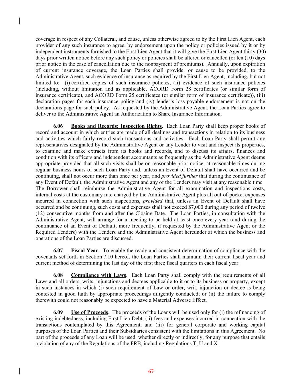 102 6.03 Existence; Conduct of Business. Each Loan Party shall do or cause to be done all things necessary to preserve, renew and keep in full force and effect its legal existence and the rights, licenses, permits, privileges and franchises material to the conduct of its business, except to the extent such failure could not reasonably be expected to have a Material Adverse Effect; provided that the foregoing shall not prohibit any merger, consolidation, liquidation, dissolution or any discontinuance or sale of such business permitted under Section 7.04. 6.04 Payment of Obligations. Each Loan Party shall pay its obligations, including Tax liabilities, that, if not paid, could result in a Material Adverse Effect before the same shall become delinquent or in default, except where (a) the validity or amount thereof is being contested in good faith by appropriate proceedings, (b) such Loan Party has set aside on its books adequate reserves with respect thereto in accordance with GAAP, which reserves shall be acceptable to Agent, and (c) the failure to make payment pending such contest could not reasonably be expected to result in a Material Adverse Effect. 6.05 Maintenance of Properties; Insurance. Each Loan Party shall (a) keep and maintain all property material to the conduct of its business in good working order and condition, ordinary wear and tear excepted, and (b) maintain insurance, with financially sound and reputable insurance companies, as may be required by law and such other insurance in such amounts and against such risks as are customarily maintained by companies engaged in the same or similar businesses operating in the same or similar locations, including, without limitation, business interruption insurance. Without limiting the generality of the foregoing, the Loan Parties will maintain or cause to be maintained replacement value casualty insurance on the Collateral under such policies of insurance and flood insurance on all Additional Mortgaged Property in compliance with applicable flood laws and regulations, in each case with such insurance companies, in such amounts, with such deductibles, and covering such terms and risks as are standard and customary, available on commercially reasonable terms and at all times satisfactory to the Administrative Agent in its commercially reasonable judgment. The Loan Parties shall cause the Agent to be named as lenders’ loss payable, loss payee or mortgagee, as its interest may appear, and/or additional insured with respect of any such insurance providing liability coverage or coverage in respect of any Collateral, and cause, unless otherwise agreed to by the Administrative Agent, each provider of any such insurance to agree, by endorsement upon the policy or policies issued by it or by independent instruments furnished to the Administrative Agent that it will give the Administrative Agent thirty (30) days prior written notice before any such policy or policies shall be altered or cancelled (or ten (10) days prior notice in the case of cancellation due to the nonpayment of premiums). Annually, upon expiration of current insurance coverage, the Loan Parties shall provide, or cause to be provided, to the Administrative Agent, such evidence of insurance as required by the Administrative Agent, including, but not limited to: (i) certified copies of such insurance policies, (ii) evidence of such insurance policies (including, without limitation and as applicable, ACORD Form 28 certificates (or similar form of insurance certificate), and ACORD Form 25 certificates (or similar form of insurance certificate)), (iii) declaration pages for each insurance policy and (iv) lender’s loss payable endorsement if the Administrative Agent for the benefit of the Secured Parties is not on the declarations page for such policy. As requested by the Administrative Agent, the Loan Parties agree to deliver to the Administrative Agent an Authorization to Share Insurance Information. 6.06 Books and Records; Inspection Rights. Each Loan Party shall keep proper books of record and account in which entries are made of all dealings and transactions in relation to its business and activities which fairly record such transactions and activities. Each Loan Party shall permit any representatives designated by the Administrative Agent or any Lender to visit and inspect its properties, to examine and make extracts from its books and records, and to discuss its affairs, finances and condition with its officers and independent accountants as frequently as the Administrative Agent deems appropriate provided that all such visits shall be on reasonable prior notice, at reasonable times during regular business hours of such Loan Party and, unless an Event of Default shall have occurred and be continuing, shall not