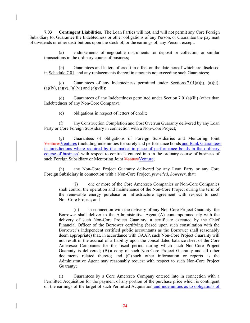 109 7.03 Contingent Liabilities. The Loan Parties will not, and will not permit any Core Foreign Subsidiary to, Guarantee the Indebtedness or other obligations of any Person, or Guarantee the payment of dividends or other distributions upon the stock of, or the earnings of, any Person, except: (a) endorsements of negotiable instruments for deposit or collection or similar transactions in the ordinary course of business; (b) Guarantees and letters of credit in effect on the date hereof which are disclosed in Schedule 7.01, and any replacements thereof in amounts not exceeding such Guarantees; (c) Guarantees of any Indebtedness permitted under Sections 7.01(a)(i), (a)(iii), (a)(iv), (a)(v) (to the extent such Guaranty is also Subordinated Indebtedness), (a)(vii) and (a)(xi); (d) Guarantees of any Indebtedness permitted under Section 7.01(a)(ii) (other than Indebtedness of any Non-Core Company), provided that to the extent such Indebtedness is Subordinated Indebtedness, such Guaranty shall also be Subordinated Indebtedness; (e) obligations in respect of Letters of Credit; (f) any Construction Completion and Cost Overrun Guaranty delivered by any Loan Party or Core Foreign Subsidiary in connection with a Non-Core Project; (g) Guarantees of obligations of Foreign Subsidiaries and Mentoring Joint Ventures (including indemnities for surety and performance bonds and Bank Guarantees in jurisdictions where required by the market in place of performance bonds in the ordinary course of business) with respect to contracts entered into in the ordinary course of business of such Foreign Subsidiary or Mentoring Joint Venture; (h) any Non-Core Project Guaranty delivered by any Loan Party or any Core Foreign Subsidiary in connection with a Non-Core Project, provided, however, that: (i) one or more of the Core Ameresco Companies or Non-Core Companies shall control the operation and maintenance of the Non-Core Project during the term of the renewable energy purchase or infrastructure agreement with respect to such Non-Core Project; and (ii) in connection with the delivery of any Non-Core Project Guaranty, the Borrower shall deliver to the Administrative Agent (A) contemporaneously with the delivery of such Non-Core Project Guaranty, a certificate executed by the Chief Financial Officer of the Borrower certifying (based upon such consultation with the Borrower’s independent certified public accountants as the Borrower shall reasonably deem appropriate) that, in accordance with GAAP, such Non-Core Project Guaranty will not result in the accrual of a liability upon the consolidated balance sheet of the Core Ameresco Companies for the fiscal period during which such Non-Core Project Guaranty is delivered; (B) a copy of such Non-Core Project Guaranty and all other documents related thereto; and (C) such other information or reports as the Administrative Agent may reasonably request with respect to such Non-Core Project Guaranty; (i) Guarantees by a Core Ameresco Company entered into in connection with a Permitted Acquisition for the payment of any portion of the purchase price which is contingent on the earnings of the target of such Permitted Acquisition and indemnities as to obligations of the
