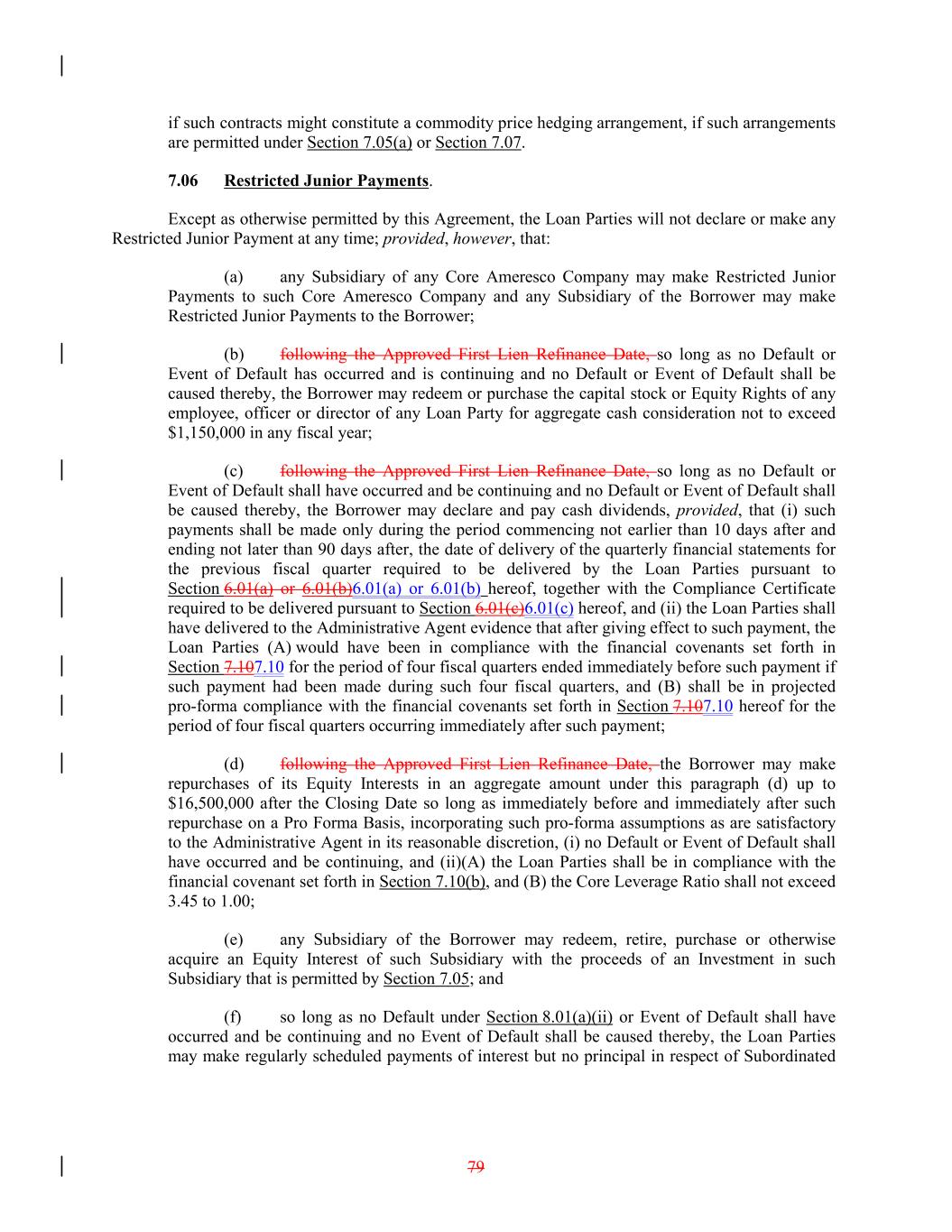 114 might constitute a commodity price hedging arrangement, if such arrangements are permitted under Section 7.05(a) or Section 7.07. 7.06 Restricted Junior Payments. Except as otherwise permitted by this Agreement, the Loan Parties will not declare or make any Restricted Junior Payment at any time; provided, however, that: (a) any Subsidiary of any Core Ameresco Company may make Restricted Junior Payments to such Core Ameresco Company and any Subsidiary of the Borrower may make Restricted Junior Payments to the Borrower; (b) so long as no Default or Event of Default has occurred and is continuing and no Default or Event of Default shall be caused thereby, the Borrower may redeem or purchase the capital stock or Equity Rights of any employee, officer or director of any Loan Party for aggregate cash consideration not to exceed $1,000,000 in any fiscal year; (c) so long as no Default or Event of Default shall have occurred and be continuing and no Default or Event of Default shall be caused thereby, the Borrower may declare and pay cash dividends, provided, that (i) such payments shall be made only during the period commencing not earlier than 10 days after and ending not later than 90 days after, the date of delivery of the quarterly financial statements for the previous fiscal quarter required to be delivered by the Loan Parties pursuant to Section 6.01(a) or 6.01(b) hereof, together with the Compliance Certificate required to be delivered pursuant to Section 6.01(c) hereof, and (ii) the Loan Parties shall have delivered to the Administrative Agent evidence that after giving effect to such payment, the Loan Parties (A) would have been in compliance with the financial covenants set forth in Section 7.10 for the period of four fiscal quarters ended immediately before such payment if such payment had been made during such four fiscal quarters, and (B) shall be in projected pro-forma compliance with the financial covenants set forth in Section 7.10 hereof for the period of four fiscal quarters occurring immediately after such payment; (d) the Borrower may make repurchases of its Equity Interests in an aggregate amount under this paragraph (d) up to $15,000,000 after the Closing Date so long as immediately before and immediately after such repurchase on a Pro Forma Basis, incorporating such pro-forma assumptions as are satisfactory to the Administrative Agent in its reasonable discretion, (i) no Default or Event of Default shall have occurred and be continuing, and (ii)(A) the Loan Parties shall be in compliance with the financial covenant set forth in Section 7.10(b), and (B) the Core Leverage Ratio shall not exceed 3.00 to 1.00; (e) any Subsidiary of the Borrower may redeem, retire, purchase or otherwise acquire an Equity Interest of such Subsidiary with the proceeds of an Investment in such Subsidiary that is permitted by Section 7.05; and (f) so long as no Default under Section 8.01(a)(ii) or Event of Default shall have occurred and be continuing and no Event of Default shall be caused thereby, the Loan Parties may make regularly scheduled payments of interest but no principal in respect of Subordinated Indebtedness on the dates and in the amounts set forth in the applicable Subordinated Debt Documents. 7.07 Transactions with Affiliates. Except as expressly permitted by this Agreement, the Loan Parties will not directly or indirectly (a) make any Investment in an Affiliate; (b) transfer, sell, lease, assign