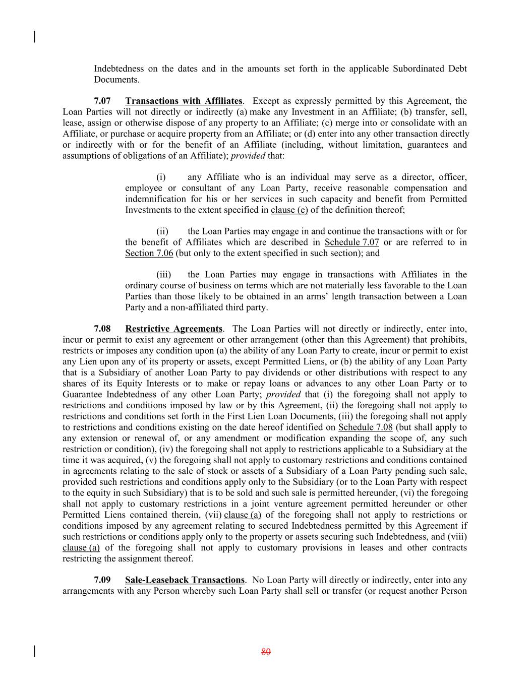 115 or otherwise dispose of any property to an Affiliate; (c) merge into or consolidate with an Affiliate, or purchase or acquire property from an Affiliate; or (d) enter into any other transaction directly or indirectly with or for the benefit of an Affiliate (including, without limitation, guarantees and assumptions of obligations of an Affiliate); provided that: (i) any Affiliate who is an individual may serve as a director, officer, employee or consultant of any Loan Party, receive reasonable compensation and indemnification for his or her services in such capacity and benefit from Permitted Investments to the extent specified in clause (e) of the definition thereof; (ii) the Loan Parties may engage in and continue the transactions with or for the benefit of Affiliates which are described in Schedule 7.07 or are referred to in Section 7.06 (but only to the extent specified in such section); and (iii) the Loan Parties may engage in transactions with Affiliates in the ordinary course of business on terms which are not materially less favorable to the Loan Parties than those likely to be obtained in an arms’ length transaction between a Loan Party and a non- affiliated third party. 7.08 Restrictive Agreements. The Loan Parties will not directly or indirectly, enter into, incur or permit to exist any agreement or other arrangement (other than this Agreement) that prohibits, restricts or imposes any condition upon (a) the ability of any Loan Party to create, incur or permit to exist any Lien upon any of its property or assets, except Permitted Liens, or (b) the ability of any Loan Party that is a Subsidiary of another Loan Party to pay dividends or other distributions with respect to any shares of its Equity Interests or to make or repay loans or advances to any other Loan Party or to Guarantee Indebtedness of any other Loan Party; provided that (i) the foregoing shall not apply to restrictions and conditions imposed by law or by this Agreement, (ii) the forgoing shall not apply to restrictions and conditions set forth in the Junior Loan Documents to the extent not inconsistent with the requirements and limitations set forth in the Intercreditor Agreement, (iii) the foregoing shall not apply to restrictions and conditions existing on the date hereof identified on Schedule 7.08 (but shall apply to any extension or renewal of, or any amendment or modification expanding the scope of, any such restriction or condition), (iv) the foregoing shall not apply to restrictions applicable to a Subsidiary at the time it was acquired, (v) the foregoing shall not apply to customary restrictions and conditions contained in agreements relating to the sale of stock or assets of a Subsidiary of a Loan Party pending such sale, provided such restrictions and conditions apply only to the Subsidiary (or to the Loan Party with respect to the equity in such Subsidiary) that is to be sold and such sale is permitted hereunder, (vi) the foregoing shall not apply to customary restrictions in a joint venture agreement permitted hereunder or other Permitted Liens contained therein, (vii) clause (a) of the foregoing shall not apply to restrictions or conditions imposed by any agreement relating to secured Indebtedness permitted by this Agreement if such restrictions or conditions apply only to the property or assets securing such Indebtedness, and (viii) clause (a) of the foregoing shall not apply to customary provisions in leases and other contracts restricting the assignment thereof. 7.09 Sale-Leaseback Transactions. No Loan Party will directly or indirectly, enter into any arrangements with any Person whereby such Loan Party shall sell or transfer (or request another Person to purchase) any property, real, personal or mixed, used or useful in its business, whether now owned or hereafter acquired, and thereafter rent or lease such property from any Person. 7.10 Certain Financial Covenants. (a) Total Funded Debt to EBITDA Ratio. The Loan Parties shall not permit the Core Leverage Ratio as of the end of each fiscal quarter to exceed 3.50 to 1.00.
