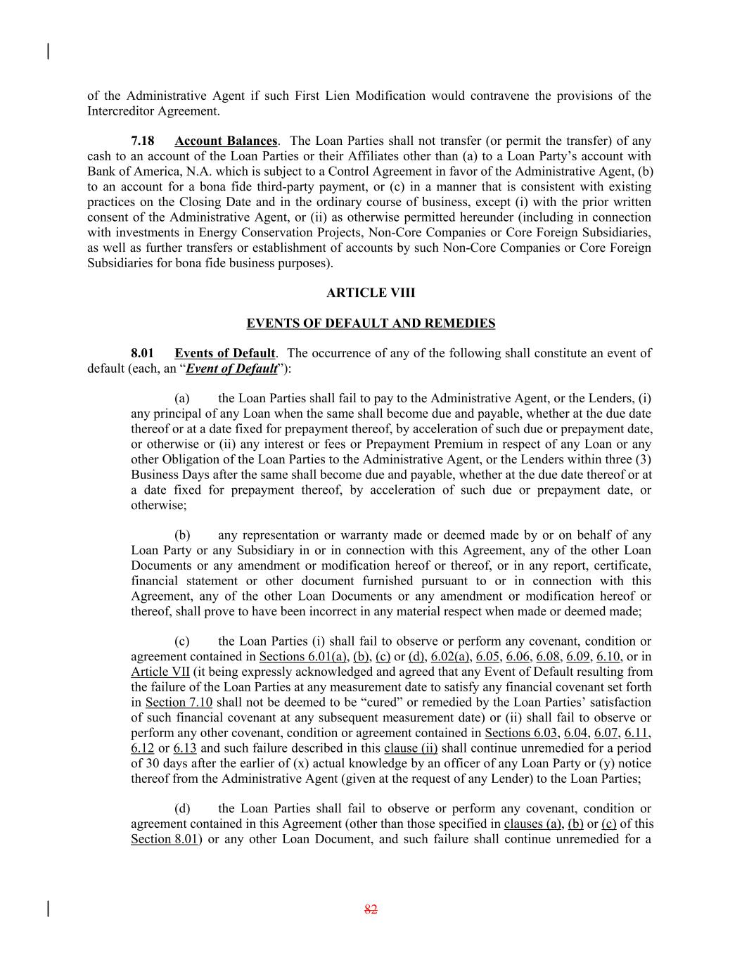 117 Agent, or (ii) as otherwise permitted hereunder (including in connection with investments in Energy Conservation Projects, Non-Core Companies or Core Foreign Subsidiaries, as well as further transfers or establishment of accounts by such Non-Core Companies or Core Foreign Subsidiaries for bona fide business purposes). ARTICLE VIII EVENTS OF DEFAULT AND REMEDIES 8.01 Events of Default. The occurrence of any of the following shall constitute an event of default (each, an “Event of Default”): (a) the Loan Parties shall fail to pay to the Administrative Agent, the L/C Issuers, or the Lenders, (i) any principal of any Loan when the same shall become due and payable, whether at the due date thereof or at a date fixed for prepayment thereof, by acceleration of such due or prepayment date, or otherwise or (ii) any interest or fees in respect of any Loan or any Reimbursement Obligation in respect of any L/C Disbursement or any other Obligation of the Loan Parties to the Administrative Agent, the L/C Issuers, or the Lenders within three (3) Business Days after the same shall become due and payable, whether at the due date thereof or at a date fixed for prepayment thereof, by acceleration of such due or prepayment date, or otherwise; (b) any representation or warranty made or deemed made by or on behalf of any Loan Party or any Subsidiary in or in connection with this Agreement, any of the other Loan Documents or any amendment or modification hereof or thereof, or in any report, certificate, financial statement or other document furnished pursuant to or in connection with this Agreement, any of the other Loan Documents or any amendment or modification hereof or thereof, shall prove to have been incorrect in any material respect when made or deemed made; (c) the Loan Parties (i) shall fail to observe or perform any covenant, condition or agreement contained in Sections 6.01(a), (b), (c) or (d), 6.02(a), 6.05, 6.06, 6.08, 6.09, 6.10, or in Article VII (it being expressly acknowledged and agreed that any Event of Default resulting from the failure of the Loan Parties at any measurement date to satisfy any financial covenant set forth in Section 7.10 shall not be deemed to be “cured” or remedied by the Loan Parties’ satisfaction of such financial covenant at any subsequent measurement date) or (ii) shall fail to observe or perform any other covenant, condition or agreement contained in Sections 6.03, 6.04, 6.07, 6.11, 6.12 or 6.13 and such failure described in this clause (ii) shall continue unremedied for a period of 30 days after the earlier of (x) actual knowledge by an officer of any Loan Party or (y) notice thereof from the Administrative Agent (given at the request of any Lender) to the Loan Parties; (d) the Loan Parties shall fail to observe or perform any covenant, condition or agreement contained in this Agreement (other than those specified in clauses (a), (b) or (c) of this Section 8.01) or any other Loan Document, and such failure shall continue unremedied for a period of 30 days after notice thereof from the Administrative Agent (at the request of any Lender) to the Loan Parties; (e) the Loan Parties shall fail to make any payment (whether of principal, interest or otherwise and regardless of amount) in respect of any Material Indebtedness or any Material Rental Obligation, when and as the same shall become due and payable, after giving effect to any grace period with respect thereto;