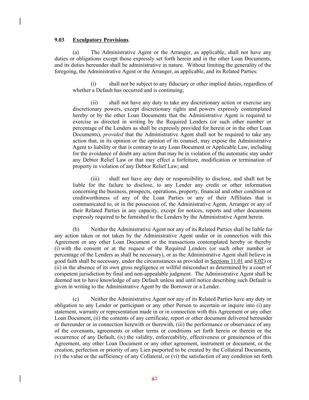 122 9.02 Rights as a Lender. The Person serving as the Administrative Agent hereunder shall have the same rights and powers in its capacity as a Lender as any other Lender and may exercise the same as though it were not the Administrative Agent and the term “Lender” or “Lenders” shall, unless otherwise expressly indicated or unless the context otherwise requires, include the Person serving as the Administrative Agent hereunder in its individual capacity. Such Person and its Affiliates may accept deposits from, lend money to, own securities of, act as the financial advisor or in any other advisory capacity for and generally engage in any kind of banking, trust, financial, advisory, underwriting or other business with any Loan Party or any Subsidiary or other Affiliate thereof as if such Person were not the Administrative Agent hereunder and without any duty to account therefor to the Lenders or to provide notice to or consent of the Lenders with respect thereto. 9.03 Exculpatory Provisions. (a) The Administrative Agent or the Arranger, as applicable, shall not have any duties or obligations except those expressly set forth herein and in the other Loan Documents, and its duties hereunder shall be administrative in nature. Without limiting the generality of the foregoing, the Administrative Agent or the Arranger, as applicable, and its Related Parties: (i) shall not be subject to any fiduciary or other implied duties, regardless of whether a Default has occurred and is continuing; (ii) shall not have any duty to take any discretionary action or exercise any discretionary powers, except discretionary rights and powers expressly contemplated hereby or by the other Loan Documents that the Administrative Agent is required to exercise as directed in writing by the Required Lenders (or such other number or percentage of the Lenders as shall be expressly provided for herein or in the other Loan Documents), provided that the Administrative Agent shall not be required to take any action that, in its opinion or the opinion of its counsel, may expose the Administrative Agent to liability or that is contrary to any Loan Document or Applicable Law, including for the avoidance of doubt any action that may be in violation of the automatic stay under any Debtor Relief Law or that may effect a forfeiture, modification or termination of property of a Defaulting Lender in violation of any Debtor Relief Law; and (iii) shall not have any duty or responsibility to disclose, and shall not be liable for the failure to disclose, to any Lender or any L/C Issuer any credit or other information concerning the business, prospects, operations, property, financial and other condition or creditworthiness of any of the Loan Parties or any of their Affiliates that is communicated to, or in the possession of, the Administrative Agent, Arranger or any of their Related Parties in any capacity, except for notices, reports and other documents expressly required to be furnished to the Lenders by the Administrative Agent herein. (b) Neither the Administrative Agent nor any of its Related Parties shall be liable for any action taken or not taken by the Administrative Agent under or in connection with this Agreement or any other Loan Document or the transactions contemplated hereby or thereby (i) with the consent or at the request of the Required Lenders (or such other number or percentage of the Lenders as shall be necessary), or as the Administrative Agent shall believe in good faith shall be necessary, under the circumstances as provided in Sections 11.01 and 8.02) or (ii) in the absence of its own gross negligence or willful misconduct as determined by a court of competent jurisdiction by final and non-appealable judgment. The Administrative Agent shall be deemed not to have knowledge of any Default unless and until notice describing such Default is given in writing to the Administrative Agent by the Borrower, a Lender or an L/C Issuer.