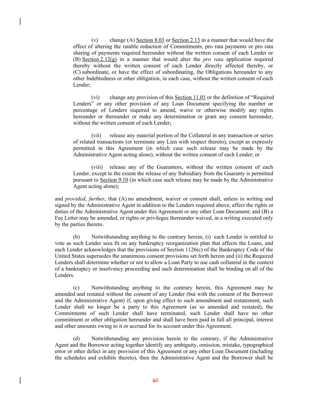 133 scheduled reduction of any Facility hereunder or under any other Loan Document without the written consent of each Appropriate Lender; (iv) reduce the principal of, or the rate of interest specified herein on (other than the decision not to change, or cease to change, Default Interest), any Loan or L/C Borrowing, or any fees or other amounts payable hereunder or under any other Loan Document without the written consent of each Lender entitled to such amount; provided, however, that only the consent of the Required Lenders shall be necessary to amend the definition of “Default Rate” or to waive any obligation of the Borrower to pay interest or Letter of Credit Fees at the Default Rate; (v) change (A) Section 8.03 or Section 2.13 in a manner that would have the effect of altering the ratable reduction of Commitments, pro rata payments or pro rata sharing of payments required hereunder without the written consent of each Lender or (B) the order of application of any reduction in the Commitments or any prepayment of Loans among the Facilities from the application thereof set forth in the applicable provisions of Section 2.05(c) or 2.06(c), respectively, in any manner that materially and adversely affects the Lenders under a Facility without the written consent of the Required Revolving Lenders or the Required Term Lenders under the Term Facility, as applicable or (C) Section 2.12(g) in a manner that would alter the pro rata application required thereby without the written consent of each Lender directly affected thereby, or (D) subordinate, or have the effect of subordinating, the Obligations hereunder to any other Indebtedness or other obligation, in each case, without the written consent of each Lender; (vi) change (A) any provision of this Section 11.01 or the definition of “Required Lenders” or “Required Class Lenders” or any other provision of any Loan Document specifying the number or percentage of Lenders required to amend, waive or otherwise modify any rights hereunder or thereunder or make any determination or grant any consent hereunder, without the written consent of each Lender or (B) the definitions of “Required Revolving Lenders” or “Required Term Lenders” as each relates to the related Facility (or the constituent definition therein relating to such Facility) without the written consent of each Lender under such Facility; (vii) release any material portion of the Collateral in any transaction or series of related transactions (or terminate any Lien with respect thereto), except as expressly permitted in this Agreement (in which case such release may be made by the Administrative Agent acting alone), without the written consent of each Lender; (viii) release any of the Guarantors, without the written consent of each Lender, except to the extent the release of any Subsidiary from the Guaranty is permitted pursuant to Section 9.10 (in which case such release may be made by the Administrative Agent acting alone); (ix) amend Section 1.09 or the definition of “Alternative Currency” without the consent of each Lender directly affected thereby; or (x) directly and materially adversely affect the rights of Lenders holding Commitments or Loans of one Class differently from the rights of Lenders holding Commitments or Loans of any other Class without the written consent of the applicable Required Class Lenders;