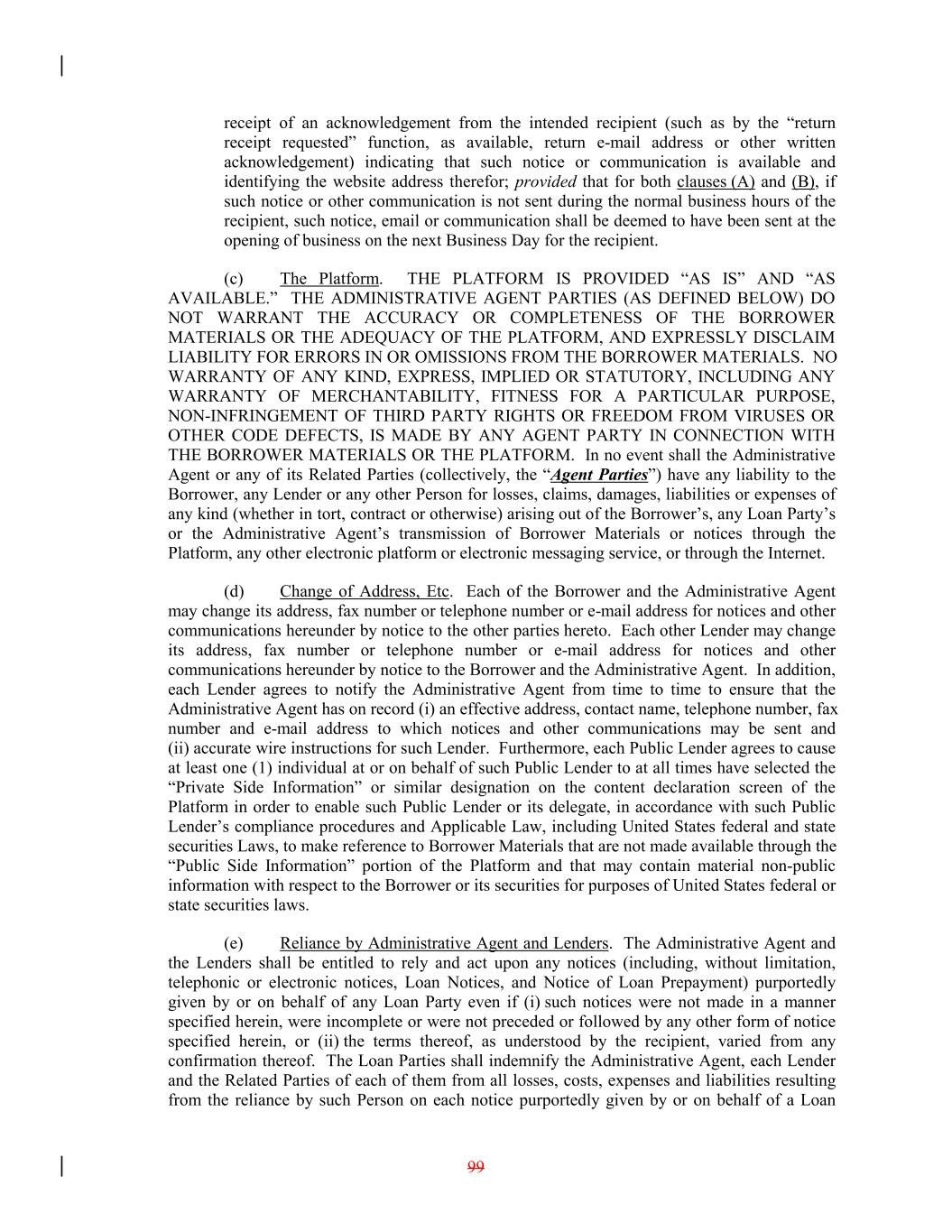 136 (ii) Unless the Administrative Agent otherwise prescribes, (A) notices and other communications sent to an e-mail address shall be deemed received upon the sender’s receipt of an acknowledgment from the intended recipient (such as by the “return receipt requested” function, as available, return e-mail or other written acknowledgement) and (B) notices and other communications posted to an Internet or intranet website shall be deemed received by the intended recipient upon the sender’s receipt of an acknowledgement from the intended recipient (such as by the “return receipt requested” function, as available, return e-mail address or other written acknowledgement) indicating that such notice or communication is available and identifying the website address therefor; provided that for both clauses (A) and (B), if such notice or other communication is not sent during the normal business hours of the recipient, such notice, email or communication shall be deemed to have been sent at the opening of business on the next Business Day for the recipient. (c) The Platform. THE PLATFORM IS PROVIDED “AS IS” AND “AS AVAILABLE.” THE ADMINISTRATIVE AGENT PARTIES (AS DEFINED BELOW) DO NOT WARRANT THE ACCURACY OR COMPLETENESS OF THE BORROWER MATERIALS OR THE ADEQUACY OF THE PLATFORM, AND EXPRESSLY DISCLAIM LIABILITY FOR ERRORS IN OR OMISSIONS FROM THE BORROWER MATERIALS. NO WARRANTY OF ANY KIND, EXPRESS, IMPLIED OR STATUTORY, INCLUDING ANY WARRANTY OF MERCHANTABILITY, FITNESS FOR A PARTICULAR PURPOSE, NON- INFRINGEMENT OF THIRD PARTY RIGHTS OR FREEDOM FROM VIRUSES OR OTHER CODE DEFECTS, IS MADE BY ANY AGENT PARTY IN CONNECTION WITH THE BORROWER MATERIALS OR THE PLATFORM. In no event shall the Administrative Agent or any of its Related Parties (collectively, the “Agent Parties”) have any liability to the Borrower, any Lender, any L/C Issuer or any other Person for losses, claims, damages, liabilities or expenses of any kind (whether in tort, contract or otherwise) arising out of the Borrower’s, any Loan Party’s or the Administrative Agent’s transmission of Borrower Materials or notices through the Platform, any other electronic platform or electronic messaging service, or through the Internet. (d) Change of Address, Etc. Each of the Borrower, the Administrative Agent, each L/C Issuer and the Swingline Lender may change its address, fax number or telephone number or e-mail address for notices and other communications hereunder by notice to the other parties hereto. Each other Lender may change its address, fax number or telephone number or e-mail address for notices and other communications hereunder by notice to the Borrower, the Administrative Agent, each L/C Issuer and the Swingline Lender. In addition, each Lender agrees to notify the Administrative Agent from time to time to ensure that the Administrative Agent has on record (i) an effective address, contact name, telephone number, fax number and e-mail address to which notices and other communications may be sent and (ii) accurate wire instructions for such Lender. Furthermore, each Public Lender agrees to cause at least one (1) individual at or on behalf of such Public Lender to at all times have selected the “Private Side Information” or similar designation on the content declaration screen of the Platform in order to enable such Public Lender or its delegate, in accordance with such Public Lender’s compliance procedures and Applicable Law, including United States federal and state securities Laws, to make reference to Borrower Materials that are not made available through the “Public Side Information” portion of the Platform and that may contain material non-public information with respect to the Borrower or its securities for purposes of United States federal or state securities laws. (e) Reliance by Administrative Agent, L/C Issuers and Lenders. The Administrative Agent, the L/C Issuers and the Lenders shall be entitled to rely and act upon any notices (including, without limitation, telephonic or electronic notices, Loan Notices, Letter of Credit Applications,