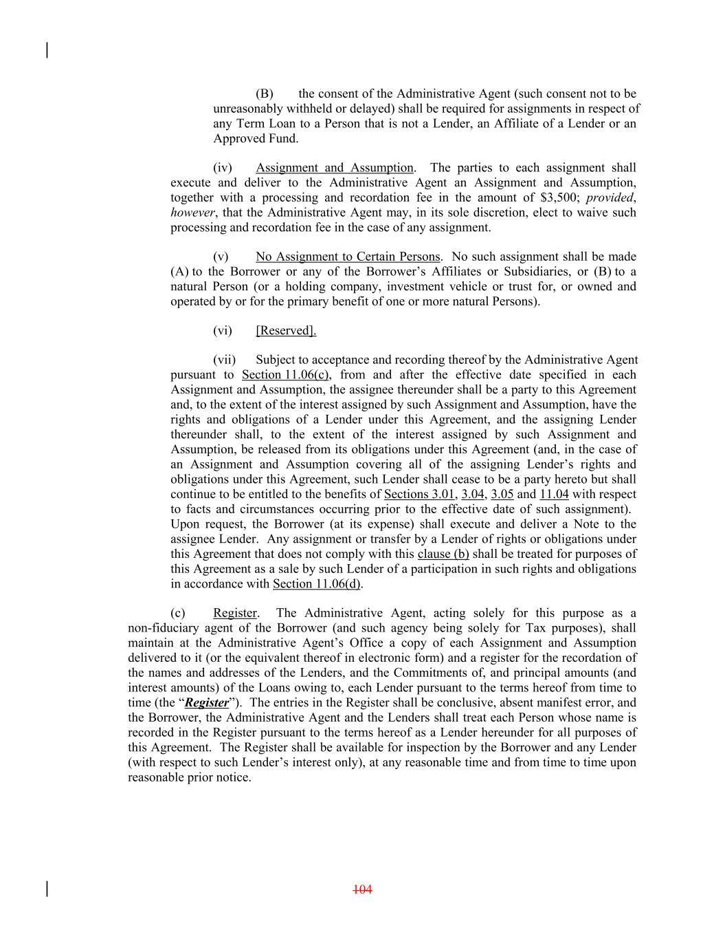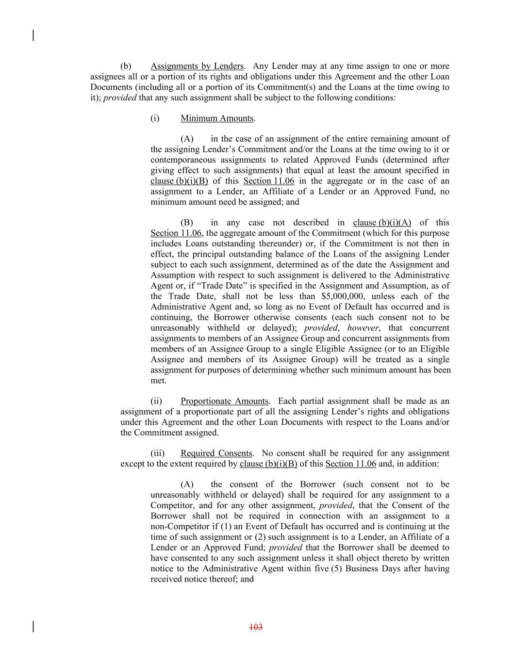 141 (ii) Proportionate Amounts. Each partial assignment shall be made as an assignment of a proportionate part of all the assigning Lender’s rights and obligations under this Agreement and the other Loan Documents with respect to the Loans and/or the Commitment assigned, except that this clause (b)(ii) shall not (A) apply to the Swingline Lender’s rights and obligations in respect of Swingline Loans or (B) prohibit any Lender from assigning all or a portion of its rights and obligations among separate Facilities on a non-pro rata basis. (iii) Required Consents. No consent shall be required for any assignment except to the extent required by clause (b)(i)(B) of this Section 11.06 and, in addition: (A) the consent of the Borrower (such consent not to be unreasonably withheld or delayed) shall be required for any assignment to a Competitor, and for any other assignment, provided, that the Consent of the Borrower shall not be required in connection with an assignment to a non-Competitor if (1) an Event of Default has occurred and is continuing at the time of such assignment or (2) such assignment is to a Lender, an Affiliate of a Lender or an Approved Fund; provided that the Borrower shall be deemed to have consented to any such assignment unless it shall object thereto by written notice to the Administrative Agent within five (5) Business Days after having received notice thereof; and provided, further, that the Borrower’s consent shall not be required during the primary syndication of the Facilities; (B) the consent of the Administrative Agent (such consent not to be unreasonably withheld or delayed) shall be required for assignments in respect of (1) any Revolving Commitment if such assignment is to a Person that is not a Lender with a Commitment in respect of the Revolving Facility, an Affiliate of such Lender or an Approved Fund with respect to such Lender or (2) any Term Loan to a Person that is not a Lender, an Affiliate of a Lender or an Approved Fund; and (C) the consent of each L/C Issuer and the Swingline Lender shall be required for any assignment in respect of the Revolving Facility. (iv) Assignment and Assumption. The parties to each assignment shall execute and deliver to the Administrative Agent an Assignment and Assumption, together with a processing and recordation fee in the amount of $3,500; provided, however, that the Administrative Agent may, in its sole discretion, elect to waive such processing and recordation fee in the case of any assignment. The assignee, if it is not a Lender, shall deliver to the Administrative Agent an Administrative Questionnaire. (v) No Assignment to Certain Persons. No such assignment shall be made (A) to the Borrower or any of the Borrower’s Affiliates or Subsidiaries, (B) to any Defaulting Lender or any of its Subsidiaries, or any Person who, upon becoming a Lender hereunder, would constitute any of the foregoing Persons described in this clause (B), or (C) to a natural Person (or a holding company, investment vehicle or trust for, or owned and operated by or for the primary benefit of one or more natural Persons). (vi) Certain Additional Payments. In connection with any assignment of rights and obligations of any Defaulting Lender hereunder, no such assignment shall be effective unless and until, in addition to the other conditions thereto set forth herein, the parties to