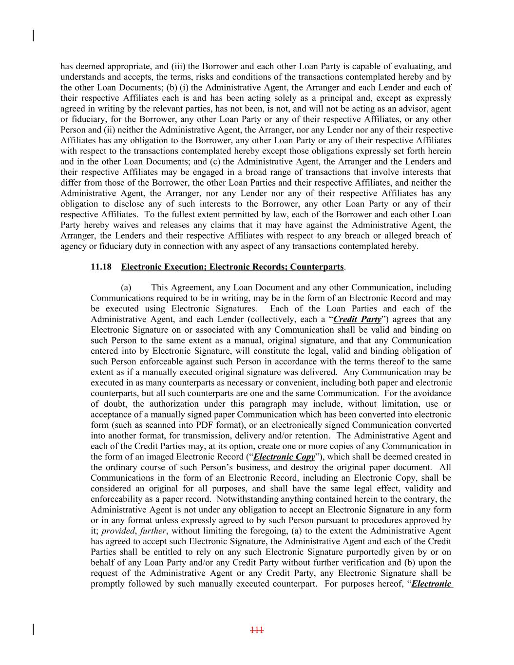 151 Affiliates with respect to any breach or alleged breach of agency or fiduciary duty in connection with any aspect of any transactions contemplated hereby. 11.19 Electronic Execution; Electronic Records; Counterparts. (a) This Agreement, any Loan Document and any other Communication, including Communications required to be in writing, may be in the form of an Electronic Record and may be executed using Electronic Signatures. Each of the Loan Parties and each of the Administrative Agent, each L/C Issuer, the Swingline Lender, and each Lender (collectively, each a “Credit Party”) agrees that any Electronic Signature on or associated with any Communication shall be valid and binding on such Person to the same extent as a manual, original signature, and that any Communication entered into by Electronic Signature, will constitute the legal, valid and binding obligation of such Person enforceable against such Person in accordance with the terms thereof to the same extent as if a manually executed original signature was delivered. Any Communication may be executed in as many counterparts as necessary or convenient, including both paper and electronic counterparts, but all such counterparts are one and the same Communication. For the avoidance of doubt, the authorization under this paragraph may include, without limitation, use or acceptance of a manually signed paper Communication which has been converted into electronic form (such as scanned into PDF format), or an electronically signed Communication converted into another format, for transmission, delivery and/or retention. The Administrative Agent and each of the Credit Parties may, at its option, create one or more copies of any Communication in the form of an imaged Electronic Record (“Electronic Copy”), which shall be deemed created in the ordinary course of such Person’s business, and destroy the original paper document. All Communications in the form of an Electronic Record, including an Electronic Copy, shall be considered an original for all purposes, and shall have the same legal effect, validity and enforceability as a paper record. Notwithstanding anything contained herein to the contrary, the Administrative Agent, L/C Issuers and Swingline Lender are not under any obligation to accept an Electronic Signature in any form or in any format unless expressly agreed to by such Person pursuant to procedures approved by it; provided, further, without limiting the foregoing, (a) to the extent the Administrative Agent, L/C Issuers and/or Swingline Lender have agreed to accept such Electronic Signature, the Administrative Agent and each of the Credit Parties shall be entitled to rely on any such Electronic Signature purportedly given by or on behalf of any Loan Party and/or any Credit Party without further verification and (b) upon the request of the Administrative Agent or any Credit Party, any Electronic Signature shall be promptly followed by such manually executed counterpart. For purposes hereof, “Electronic Record” and “Electronic Signature” shall have the meanings assigned to them, respectively, by 15 USC §7006, as it may be amended from time to time. (b) Neither the Administrative Agent, the L/C Issuers nor the Swingline Lender shall be responsible for or have any duty to ascertain or inquire into the sufficiency, validity, enforceability, effectiveness or genuineness of any Loan Document or any other agreement, instrument or document (including, for the avoidance of doubt, in connection with the Administrative Agent’s, any L/C Issuer’s or the Swingline Lender’s reliance on any Electronic Signature transmitted by telecopy, emailed .pdf or any other electronic means). The Administrative Agent, L/C Issuers and Swingline Lender shall be entitled to rely on, and shall incur no liability under or in respect of this Agreement or any other Loan Document by acting upon, any Communication (which writing may be a fax, any electronic message, Internet or intranet website posting or other distribution or signed using an Electronic Signature) or any statement made to it orally or by telephone and believed by it to be genuine and signed or sent or otherwise authenticated (whether or not such Person in fact meets the requirements set forth in the Loan Documents for being the maker thereof).