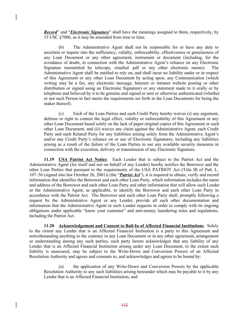 152 (c) Each of the Loan Parties and each Credit Party hereby waives (i) any argument, defense or right to contest the legal effect, validity or enforceability of this Agreement or any other Loan Document based solely on the lack of paper original copies of this Agreement or such other Loan Document, and (ii) waives any claim against the Administrative Agent, each Credit Party and each Related Party for any liabilities arising solely from the Administrative Agent’s and/or any Credit Party’s reliance on or use of Electronic Signatures, including any liabilities arising as a result of the failure of the Loan Parties to use any available security measures in connection with the execution, delivery or transmission of any Electronic Signature. 11.20 USA Patriot Act Notice. Each Lender that is subject to the Patriot Act and the Administrative Agent (for itself and not on behalf of any Lender) hereby notifies the Borrower and the other Loan Parties that pursuant to the requirements of the USA PATRIOT Act (Title III of Pub. L. 107– 56 (signed into law October 26, 2001)) (the “Patriot Act”), it is required to obtain, verify and record information that identifies the Borrower and each other Loan Party, which information includes the name and address of the Borrower and each other Loan Party and other information that will allow such Lender or the Administrative Agent, as applicable, to identify the Borrower and each other Loan Party in accordance with the Patriot Act. The Borrower and each other Loan Party shall, promptly following a request by the Administrative Agent or any Lender, provide all such other documentation and information that the Administrative Agent or such Lender requests in order to comply with its ongoing obligations under applicable “know your customer” and anti-money laundering rules and regulations, including the Patriot Act. 11.21 Acknowledgement and Consent to Bail-In of Affected Financial Institutions. Solely to the extent any Lender or L/C Issuer that is an Affected Financial Institution is a party to this Agreement and notwithstanding anything to the contrary in any Loan Document or in any other agreement, arrangement or understanding among any such parties, each party hereto acknowledges that any liability of any Lender or L/C Issuer that is an Affected Financial Institution arising under any Loan Document, to the extent such liability is unsecured, may be subject to the Write-Down and Conversion Powers of an Affected Resolution Authority and agrees and consents to, and acknowledges and agrees to be bound by: (a) the application of any Write-Down and Conversion Powers by the applicable Resolution Authority to any such liabilities arising hereunder which may be payable to it by any Lender or L/C Issuer that is an Affected Financial Institution; and (b) the effects of any Bail-In Action on any such liability, including, if applicable: (i) a reduction in full or in part or cancellation of any such liability; (ii) a conversion of all, or a portion of, such liability into shares or other instruments of ownership in such Affected Financial Institution, its parent undertaking, or a bridge institution that may be issued to it or otherwise conferred on it, and that such shares or other instruments of ownership will be accepted by it in lieu of any rights with respect to any such liability under this Agreement or any other Loan Document; or (iii) the variation of the terms of such liability in connection with the exercise of the Write-Down and Conversion Powers of the applicable Resolution Authority. 11.22 Acknowledgement Regarding Any Supported QFCs. To the extent that the Loan Documents provide support, through a guarantee or otherwise, for any Swap Contract or any other agreement or instrument that is a QFC (such support, “QFC Credit Support”, and each such QFC, a “Supported QFC”), the parties acknowledge and agree as follows with respect to the resolution power of