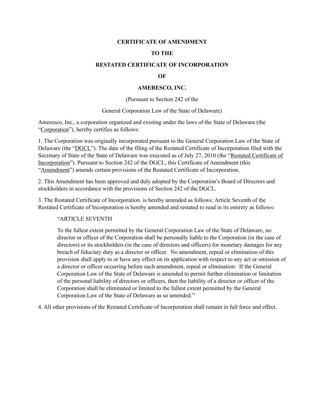 CERTIFICATE OF AMENDMENT TO THE RESTATED CERTIFICATE OF INCORPORATION OF AMERESCO, INC. (Pursuant to Section 242 of the General Corporation Law of the State of Delaware) Ameresco, Inc., a corporation organized and existing under the laws of the State of Delaware (the “Corporation”), hereby certifies as follows: 1. The Corporation was originally incorporated pursuant to the General Corporation Law of the State of Delaware (the “DGCL”). The date of the filing of the Restated Certificate of Incorporation filed with the Secretary of State of the State of Delaware was executed as of July 27, 2010 (the “Restated Certificate of Incorporation”). Pursuant to Section 242 of the DGCL, this Certificate of Amendment (this “Amendment”) amends certain provisions of the Restated Certificate of Incorporation. 2. This Amendment has been approved and duly adopted by the Corporation’s Board of Directors and stockholders in accordance with the provisions of Section 242 of the DGCL. 3. The Restated Certificate of Incorporation. is hereby amended as follows: Article Seventh of the Restated Certificate of Incorporation is hereby amended and restated to read in its entirety as follows: “ARTICLE SEVENTH To the fullest extent permitted by the General Corporation Law of the State of Delaware, no director or officer of the Corporation shall be personally liable to the Corporation (in the case of directors) or its stockholders (in the case of directors and officers) for monetary damages for any breach of fiduciary duty as a director or officer. No amendment, repeal or elimination of this provision shall apply to or have any effect on its application with respect to any act or omission of a director or officer occurring before such amendment, repeal or elimination. If the General Corporation Law of the State of Delaware is amended to permit further elimination or limitation of the personal liability of directors or officers, then the liability of a director or officer of the Corporation shall be eliminated or limited to the fullest extent permitted by the General Corporation Law of the State of Delaware as so amended.” 4. All other provisions of the Restated Certificate of Incorporation shall remain in full force and effect.