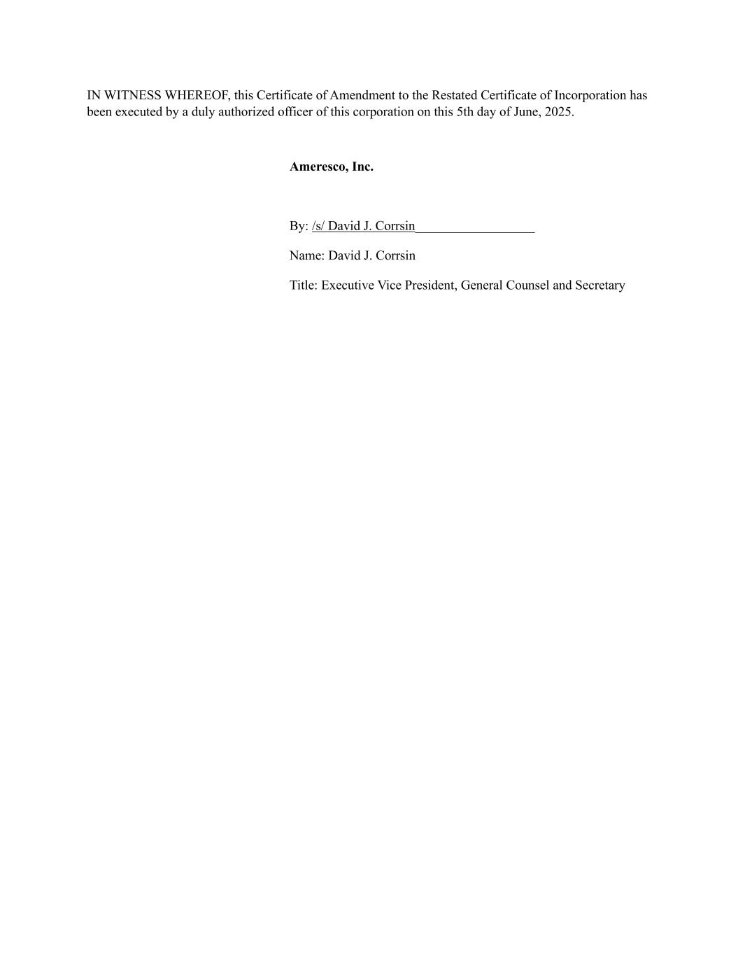 IN WITNESS WHEREOF, this Certificate of Amendment to the Restated Certificate of Incorporation has been executed by a duly authorized officer of this corporation on this 5th day of June, 2025. Ameresco, Inc. By: /s/ David J. Corrsin__________________ Name: David J. Corrsin Title: Executive Vice President, General Counsel and Secretary