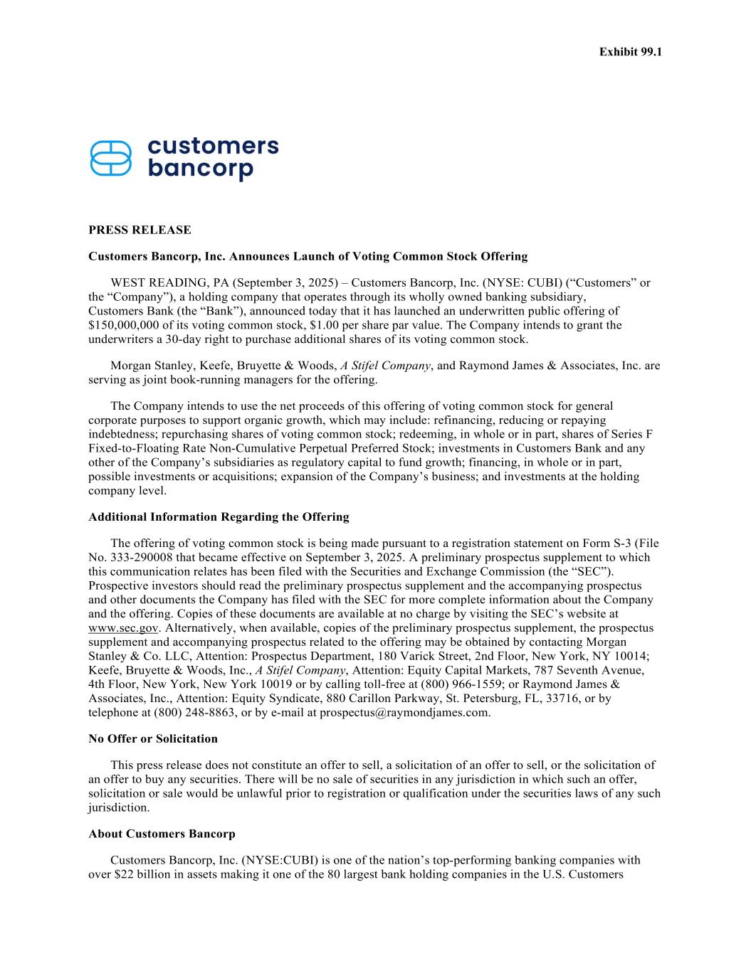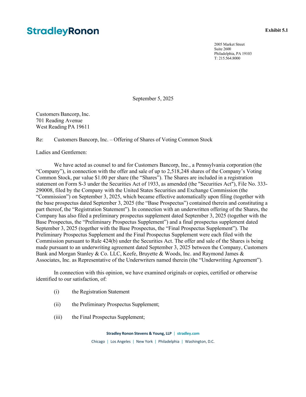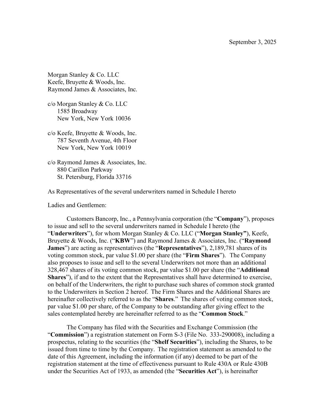 September 3, 2025 Morgan Stanley & Co. LLC Keefe, Bruyette & Woods, Inc. Raymond James & Associates, Inc. c/o Morgan Stanley & Co. LLC 1585 Broadway New York, New York 10036 c/o Keefe, Bruyette & Woods, Inc. 787 Seventh Avenue, 4th Floor New York, New York 10019 c/o Raymond James & Associates, Inc. 880 Carillon Parkway St. Petersburg, Florida 33716 As Representatives of the several underwriters named in Schedule I hereto Ladies and Gentlemen: Customers Bancorp, Inc., a Pennsylvania corporation (the “Company”), proposes to issue and sell to the several underwriters named in Schedule I hereto (the “Underwriters”), for whom Morgan Stanley & Co. LLC (“Morgan Stanley”), Keefe, Bruyette & Woods, Inc. (“KBW”) and Raymond James & Associates, Inc. (“Raymond James”) are acting as representatives (the “Representatives”), 2,189,781 shares of its voting common stock, par value $1.00 per share (the “Firm Shares”). The Company also proposes to issue and sell to the several Underwriters not more than an additional 328,467 shares of its voting common stock, par value $1.00 per share (the “Additional Shares”), if and to the extent that the Representatives shall have determined to exercise, on behalf of the Underwriters, the right to purchase such shares of common stock granted to the Underwriters in Section 2 hereof. The Firm Shares and the Additional Shares are hereinafter collectively referred to as the “Shares.” The shares of voting common stock, par value $1.00 per share, of the Company to be outstanding after giving effect to the sales contemplated hereby are hereinafter referred to as the “Common Stock.” The Company has filed with the Securities and Exchange Commission (the “Commission”) a registration statement on Form S-3 (File No. 333-290008), including a prospectus, relating to the securities (the “Shelf Securities”), including the Shares, to be issued from time to time by the Company. The registration statement as amended to the date of this Agreement, including the information (if any) deemed to be part of the registration statement at the time of effectiveness pursuant to Rule 430A or Rule 430B under the Securities Act of 1933, as amended (the “Securities Act”), is hereinafter