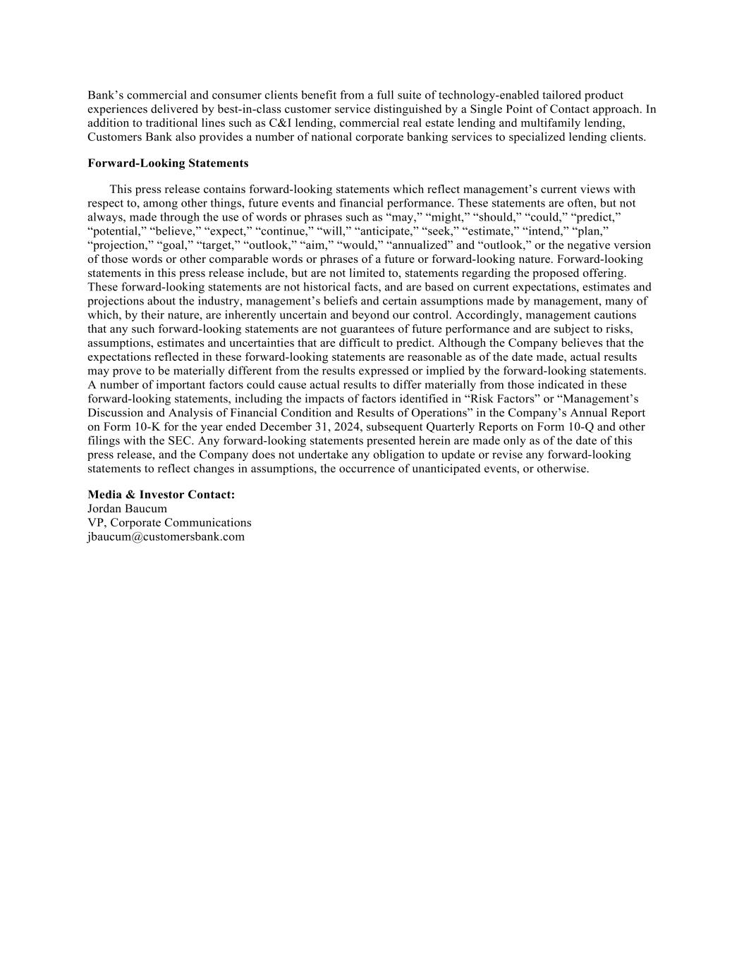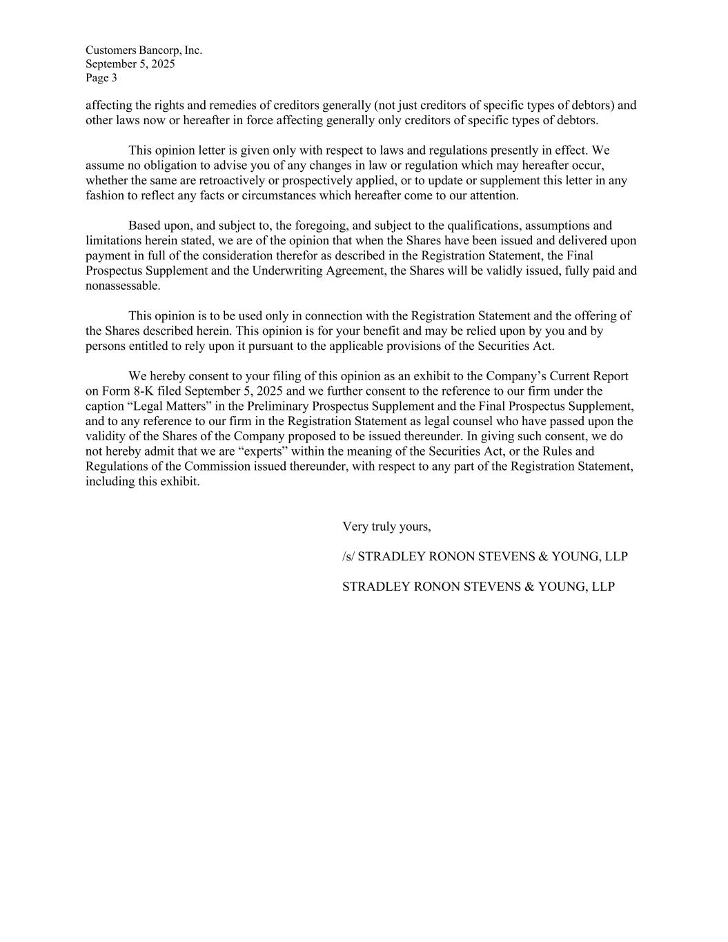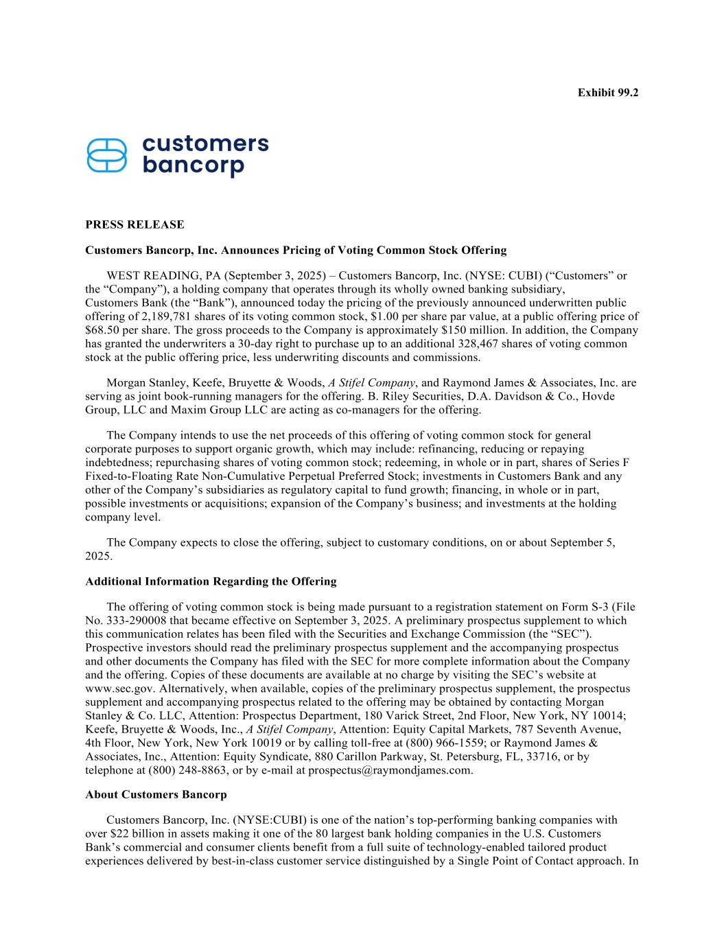 September 3, 2025 Morgan Stanley & Co. LLC Keefe, Bruyette & Woods, Inc. Raymond James & Associates, Inc. c/o Morgan Stanley & Co. LLC 1585 Broadway New York, New York 10036 c/o Keefe, Bruyette & Woods, Inc. 787 Seventh Avenue, 4th Floor New York, New York 10019 c/o Raymond James & Associates, Inc. 880 Carillon Parkway St. Petersburg, Florida 33716 As Representatives of the several underwriters named in Schedule I hereto Ladies and Gentlemen: Customers Bancorp, Inc., a Pennsylvania corporation (the “Company”), proposes to issue and sell to the several underwriters named in Schedule I hereto (the “Underwriters”), for whom Morgan Stanley & Co. LLC (“Morgan Stanley”), Keefe, Bruyette & Woods, Inc. (“KBW”) and Raymond James & Associates, Inc. (“Raymond James”) are acting as representatives (the “Representatives”), 2,189,781 shares of its voting common stock, par value $1.00 per share (the “Firm Shares”). The Company also proposes to issue and sell to the several Underwriters not more than an additional 328,467 shares of its voting common stock, par value $1.00 per share (the “Additional Shares”), if and to the extent that the Representatives shall have determined to exercise, on behalf of the Underwriters, the right to purchase such shares of common stock granted to the Underwriters in Section 2 hereof. The Firm Shares and the Additional Shares are hereinafter collectively referred to as the “Shares.” The shares of voting common stock, par value $1.00 per share, of the Company to be outstanding after giving effect to the sales contemplated hereby are hereinafter referred to as the “Common Stock.” The Company has filed with the Securities and Exchange Commission (the “Commission”) a registration statement on Form S-3 (File No. 333-290008), including a prospectus, relating to the securities (the “Shelf Securities”), including the Shares, to be issued from time to time by the Company. The registration statement as amended to the date of this Agreement, including the information (if any) deemed to be part of the registration statement at the time of effectiveness pursuant to Rule 430A or Rule 430B under the Securities Act of 1933, as amended (the “Securities Act”), is hereinafter