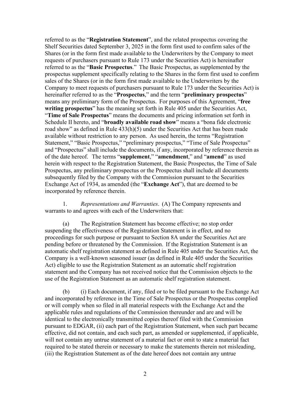 2 referred to as the “Registration Statement”, and the related prospectus covering the Shelf Securities dated September 3, 2025 in the form first used to confirm sales of the Shares (or in the form first made available to the Underwriters by the Company to meet requests of purchasers pursuant to Rule 173 under the Securities Act) is hereinafter referred to as the “Basic Prospectus.” The Basic Prospectus, as supplemented by the prospectus supplement specifically relating to the Shares in the form first used to confirm sales of the Shares (or in the form first made available to the Underwriters by the Company to meet requests of purchasers pursuant to Rule 173 under the Securities Act) is hereinafter referred to as the “Prospectus,” and the term “preliminary prospectus” means any preliminary form of the Prospectus. For purposes of this Agreement, “free writing prospectus” has the meaning set forth in Rule 405 under the Securities Act, “Time of Sale Prospectus” means the documents and pricing information set forth in Schedule II hereto, and “broadly available road show” means a “bona fide electronic road show” as defined in Rule 433(h)(5) under the Securities Act that has been made available without restriction to any person. As used herein, the terms “Registration Statement,” “Basic Prospectus,” “preliminary prospectus,” “Time of Sale Prospectus” and “Prospectus” shall include the documents, if any, incorporated by reference therein as of the date hereof. The terms “supplement,” “amendment,” and “amend” as used herein with respect to the Registration Statement, the Basic Prospectus, the Time of Sale Prospectus, any preliminary prospectus or the Prospectus shall include all documents subsequently filed by the Company with the Commission pursuant to the Securities Exchange Act of 1934, as amended (the “Exchange Act”), that are deemed to be incorporated by reference therein. 1. Representations and Warranties. (A) The Company represents and warrants to and agrees with each of the Underwriters that: (a) The Registration Statement has become effective; no stop order suspending the effectiveness of the Registration Statement is in effect, and no proceedings for such purpose or pursuant to Section 8A under the Securities Act are pending before or threatened by the Commission. If the Registration Statement is an automatic shelf registration statement as defined in Rule 405 under the Securities Act, the Company is a well-known seasoned issuer (as defined in Rule 405 under the Securities Act) eligible to use the Registration Statement as an automatic shelf registration statement and the Company has not received notice that the Commission objects to the use of the Registration Statement as an automatic shelf registration statement. (b) (i) Each document, if any, filed or to be filed pursuant to the Exchange Act and incorporated by reference in the Time of Sale Prospectus or the Prospectus complied or will comply when so filed in all material respects with the Exchange Act and the applicable rules and regulations of the Commission thereunder and are and will be identical to the electronically transmitted copies thereof filed with the Commission pursuant to EDGAR, (ii) each part of the Registration Statement, when such part became effective, did not contain, and each such part, as amended or supplemented, if applicable, will not contain any untrue statement of a material fact or omit to state a material fact required to be stated therein or necessary to make the statements therein not misleading, (iii) the Registration Statement as of the date hereof does not contain any untrue