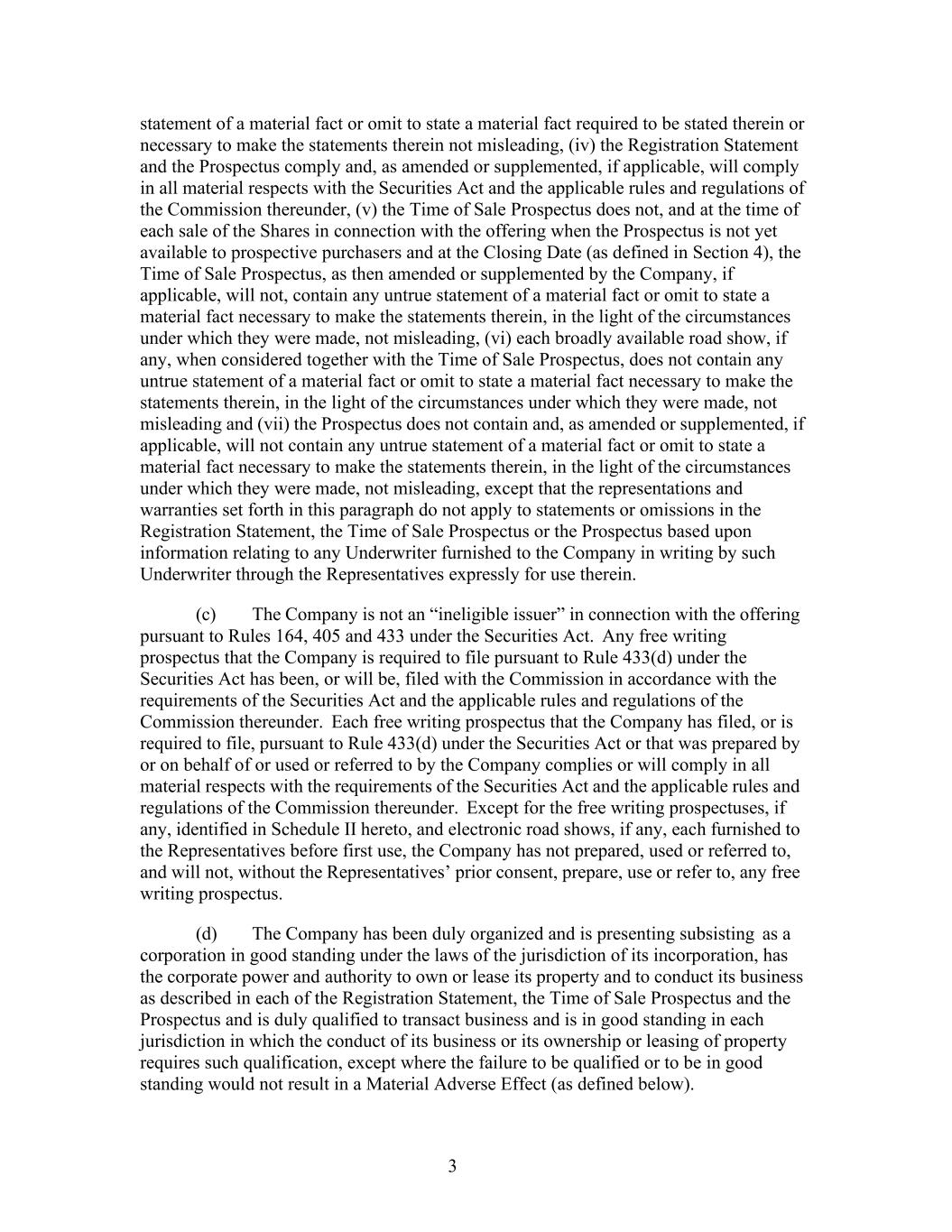 3 statement of a material fact or omit to state a material fact required to be stated therein or necessary to make the statements therein not misleading, (iv) the Registration Statement and the Prospectus comply and, as amended or supplemented, if applicable, will comply in all material respects with the Securities Act and the applicable rules and regulations of the Commission thereunder, (v) the Time of Sale Prospectus does not, and at the time of each sale of the Shares in connection with the offering when the Prospectus is not yet available to prospective purchasers and at the Closing Date (as defined in Section 4), the Time of Sale Prospectus, as then amended or supplemented by the Company, if applicable, will not, contain any untrue statement of a material fact or omit to state a material fact necessary to make the statements therein, in the light of the circumstances under which they were made, not misleading, (vi) each broadly available road show, if any, when considered together with the Time of Sale Prospectus, does not contain any untrue statement of a material fact or omit to state a material fact necessary to make the statements therein, in the light of the circumstances under which they were made, not misleading and (vii) the Prospectus does not contain and, as amended or supplemented, if applicable, will not contain any untrue statement of a material fact or omit to state a material fact necessary to make the statements therein, in the light of the circumstances under which they were made, not misleading, except that the representations and warranties set forth in this paragraph do not apply to statements or omissions in the Registration Statement, the Time of Sale Prospectus or the Prospectus based upon information relating to any Underwriter furnished to the Company in writing by such Underwriter through the Representatives expressly for use therein. (c) The Company is not an “ineligible issuer” in connection with the offering pursuant to Rules 164, 405 and 433 under the Securities Act. Any free writing prospectus that the Company is required to file pursuant to Rule 433(d) under the Securities Act has been, or will be, filed with the Commission in accordance with the requirements of the Securities Act and the applicable rules and regulations of the Commission thereunder. Each free writing prospectus that the Company has filed, or is required to file, pursuant to Rule 433(d) under the Securities Act or that was prepared by or on behalf of or used or referred to by the Company complies or will comply in all material respects with the requirements of the Securities Act and the applicable rules and regulations of the Commission thereunder. Except for the free writing prospectuses, if any, identified in Schedule II hereto, and electronic road shows, if any, each furnished to the Representatives before first use, the Company has not prepared, used or referred to, and will not, without the Representatives’ prior consent, prepare, use or refer to, any free writing prospectus. (d) The Company has been duly organized and is presenting subsisting as a corporation in good standing under the laws of the jurisdiction of its incorporation, has the corporate power and authority to own or lease its property and to conduct its business as described in each of the Registration Statement, the Time of Sale Prospectus and the Prospectus and is duly qualified to transact business and is in good standing in each jurisdiction in which the conduct of its business or its ownership or leasing of property requires such qualification, except where the failure to be qualified or to be in good standing would not result in a Material Adverse Effect (as defined below).