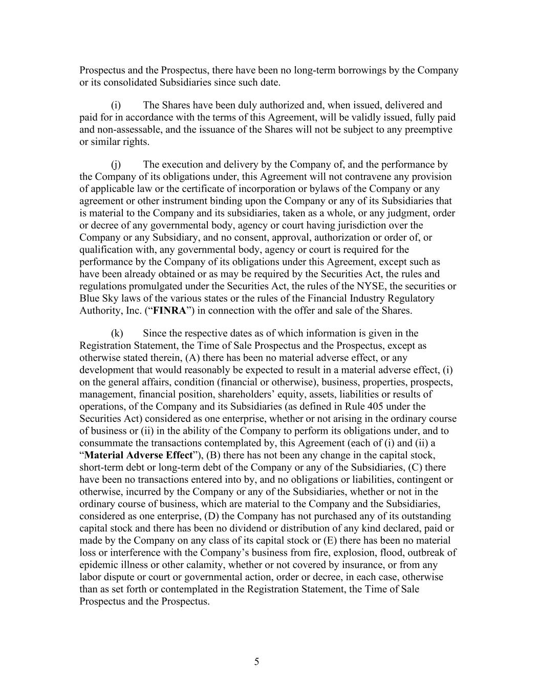 5 Prospectus and the Prospectus, there have been no long-term borrowings by the Company or its consolidated Subsidiaries since such date. (i) The Shares have been duly authorized and, when issued, delivered and paid for in accordance with the terms of this Agreement, will be validly issued, fully paid and non-assessable, and the issuance of the Shares will not be subject to any preemptive or similar rights. (j) The execution and delivery by the Company of, and the performance by the Company of its obligations under, this Agreement will not contravene any provision of applicable law or the certificate of incorporation or bylaws of the Company or any agreement or other instrument binding upon the Company or any of its Subsidiaries that is material to the Company and its subsidiaries, taken as a whole, or any judgment, order or decree of any governmental body, agency or court having jurisdiction over the Company or any Subsidiary, and no consent, approval, authorization or order of, or qualification with, any governmental body, agency or court is required for the performance by the Company of its obligations under this Agreement, except such as have been already obtained or as may be required by the Securities Act, the rules and regulations promulgated under the Securities Act, the rules of the NYSE, the securities or Blue Sky laws of the various states or the rules of the Financial Industry Regulatory Authority, Inc. (“FINRA”) in connection with the offer and sale of the Shares. (k) Since the respective dates as of which information is given in the Registration Statement, the Time of Sale Prospectus and the Prospectus, except as otherwise stated therein, (A) there has been no material adverse effect, or any development that would reasonably be expected to result in a material adverse effect, (i) on the general affairs, condition (financial or otherwise), business, properties, prospects, management, financial position, shareholders’ equity, assets, liabilities or results of operations, of the Company and its Subsidiaries (as defined in Rule 405 under the Securities Act) considered as one enterprise, whether or not arising in the ordinary course of business or (ii) in the ability of the Company to perform its obligations under, and to consummate the transactions contemplated by, this Agreement (each of (i) and (ii) a “Material Adverse Effect”), (B) there has not been any change in the capital stock, short-term debt or long-term debt of the Company or any of the Subsidiaries, (C) there have been no transactions entered into by, and no obligations or liabilities, contingent or otherwise, incurred by the Company or any of the Subsidiaries, whether or not in the ordinary course of business, which are material to the Company and the Subsidiaries, considered as one enterprise, (D) the Company has not purchased any of its outstanding capital stock and there has been no dividend or distribution of any kind declared, paid or made by the Company on any class of its capital stock or (E) there has been no material loss or interference with the Company’s business from fire, explosion, flood, outbreak of epidemic illness or other calamity, whether or not covered by insurance, or from any labor dispute or court or governmental action, order or decree, in each case, otherwise than as set forth or contemplated in the Registration Statement, the Time of Sale Prospectus and the Prospectus.